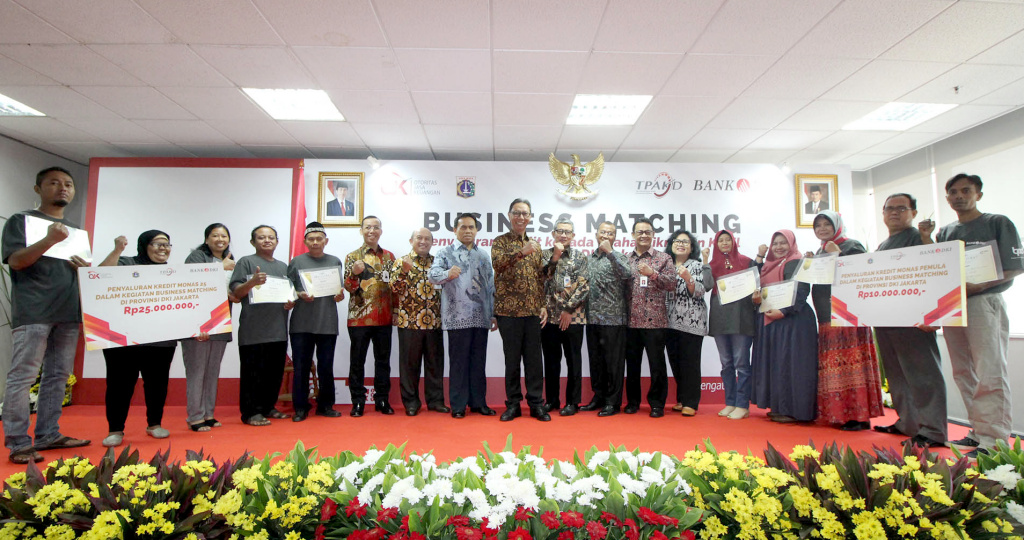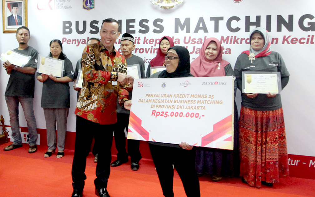 Plt Direktur Utama PT Bank DKI, Sigit Prastowo memberikan penyaluran kredit secara simbolis kepada perwakilan dari 250 peserta program Pengembangan Kewirausahaan Terpadu (PKT) pada acara Business Matching Penyaluran Kredit Kepada Usaha Mikro & Kecil di Provinsi DKI Jakarta bersama Pemprov DKI Jakarta dan OJK di Jakarta, Kamis (25/7). AKTUAL/Dok Bank DKI
