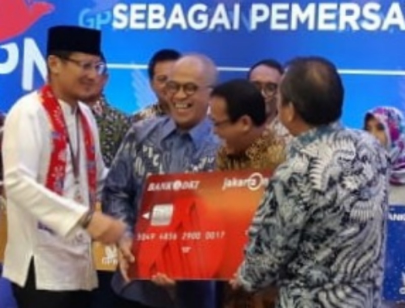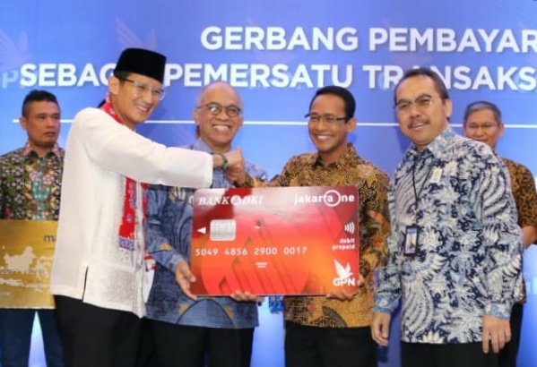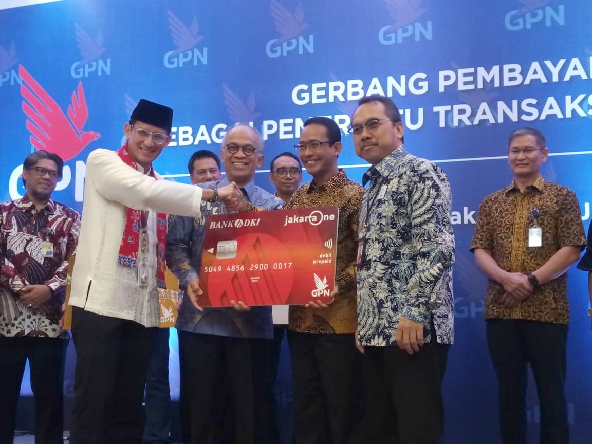Wakil Gubernur DKI Jakarta Sandiaga Uno (kiri) bersama Direktur Utama Bank DKI Kresno Sediarsi (kedua kiri, Pemimpin Bank Indonesia Regional DKI Jakarta Sutrisno (kanan) dan Direktur Keuangan & Administrasi MRT Tuhiyat (kedua kanan) menunjukkan simbolis kartu ATM GPN (Gerbang Pembayaran Nasional) Bank DKI pada acara sosialisasi Gerbang Pembayaran Nasional di Jakarta, Jumat (27/7). Bank DKI akan melakukan penggantian kartu ATM secara bertahap menjadi kartu ATM berlogo GPN kepada nasabahnya. AKTUAL/Bank DKI