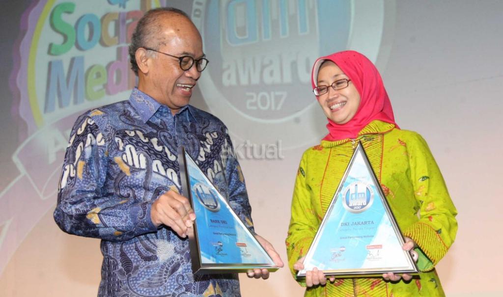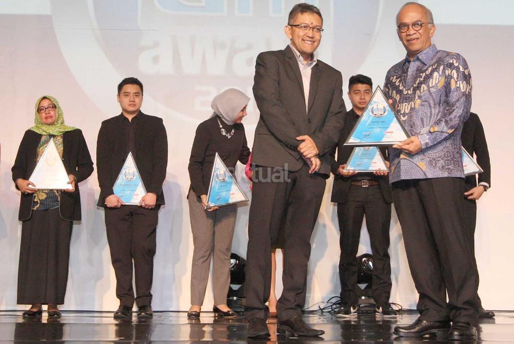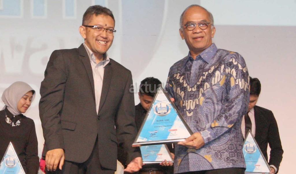 Direktur Utama Bank DKI, Kresno Sediarsi (kanan) menerima penghargaan Digital Marketing Awards untuk kategori Bank Pembangunan Daerah Great Performing Website dari Managing Director Marketing Group, Adyo Bawono di Jakarta, Selasa (31/10). Penghargaan tersebut diberikan oleh dari Majalah Marketing dan Lembaga Survey Independent Survey One. Bank DKI secara konsisten terus menerapkan keterbukaan informasi melalui berbagai media komunikasi termasuk diantaranya website Bank DKI www.bankdki.co.id. AKTUAL/Humaa Bank DKI