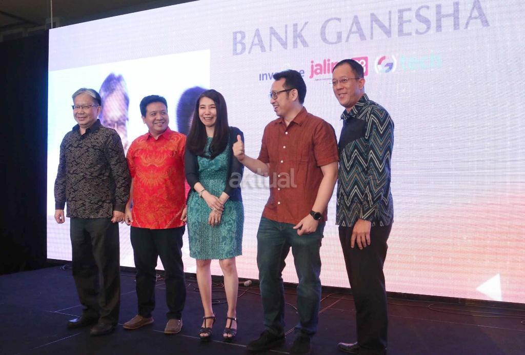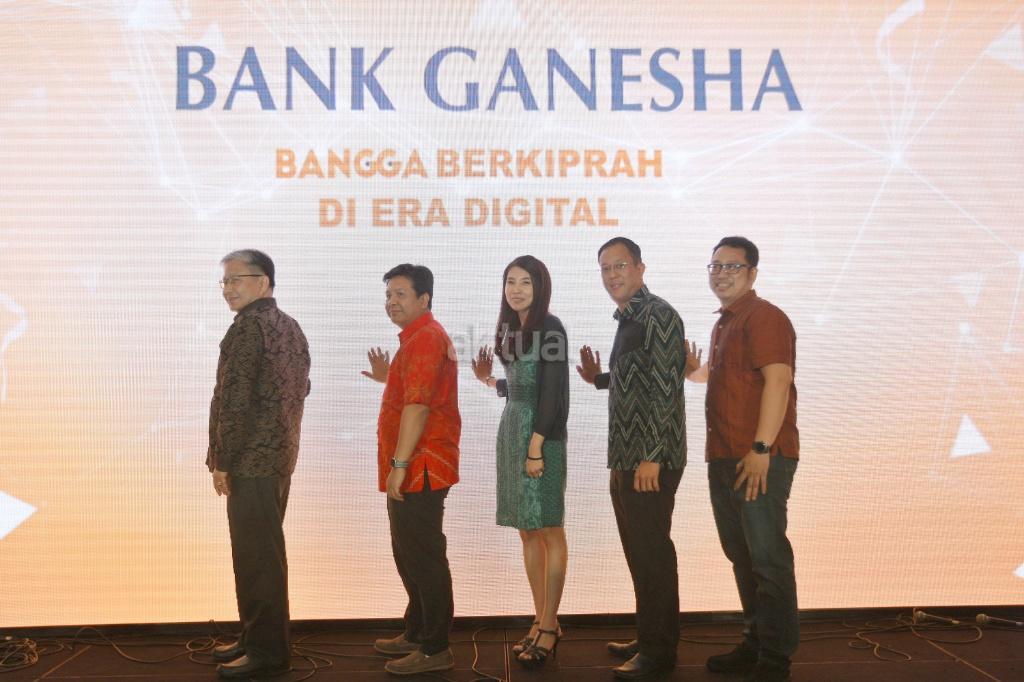 Presiden Direktur Bank Ganesha Surjawaty Tatang (tengah) bersama Direktur Marketing Bank Ganesha Setiawan Kumala (dua dari kanan), Direktur Kepatuhan Sugiarto Surjadi (kiri), Division Head Operasional dan IT Rudy Hamdani (dua dari kiri), dan Division Head E-channel Adi Haryadi, saat peluncuran aplikasi layanan mobile banking ‘Bangga’, di Jakarta, Selasa (3/4). Aplikasi tersebut ditujukan untuk memenuhi kebutuhan transaksi finansial maupun nonfinansial nasabah perseroan. AKTUAL/Eko S Hilman