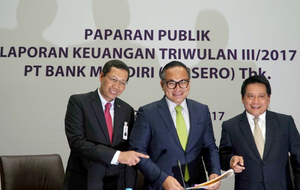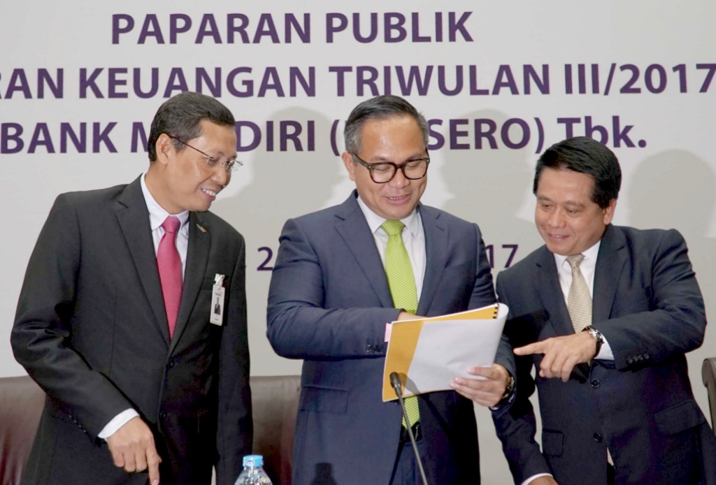 Direktur Utama Bank Mandiri Kartika Wirjoatmodjo (tengah), Direktur Distributions Hery Gunardi (kanan) dan Direktur Retail Banking Tardi (kiri) berbincang usai menyampaikan kinerja perseroan pada triwulan III-2017 di Plaza Mandiri Jakarta, Selasa (24/10). Atas implementasi peran perseroan sebagai agen pembangunan, Bank Mandiri berhasil mencatatkan pertumbuhan kredit 9,8% yoy pada akhir September 2017 menjadi Rp686,2 triliun, dimana penyaluran ke sektor produktif mencapai Rp510,7 triliun, atau hampir 75% dari portollio Bank Mandiri. Atas capaian tersebut, perseroan membukukan kenaikan laba bersih sebesar 25,4% menjadi Rp15,1 triliun pada akhir triwulan III-2017. AKTUAL/Eko S Hilman