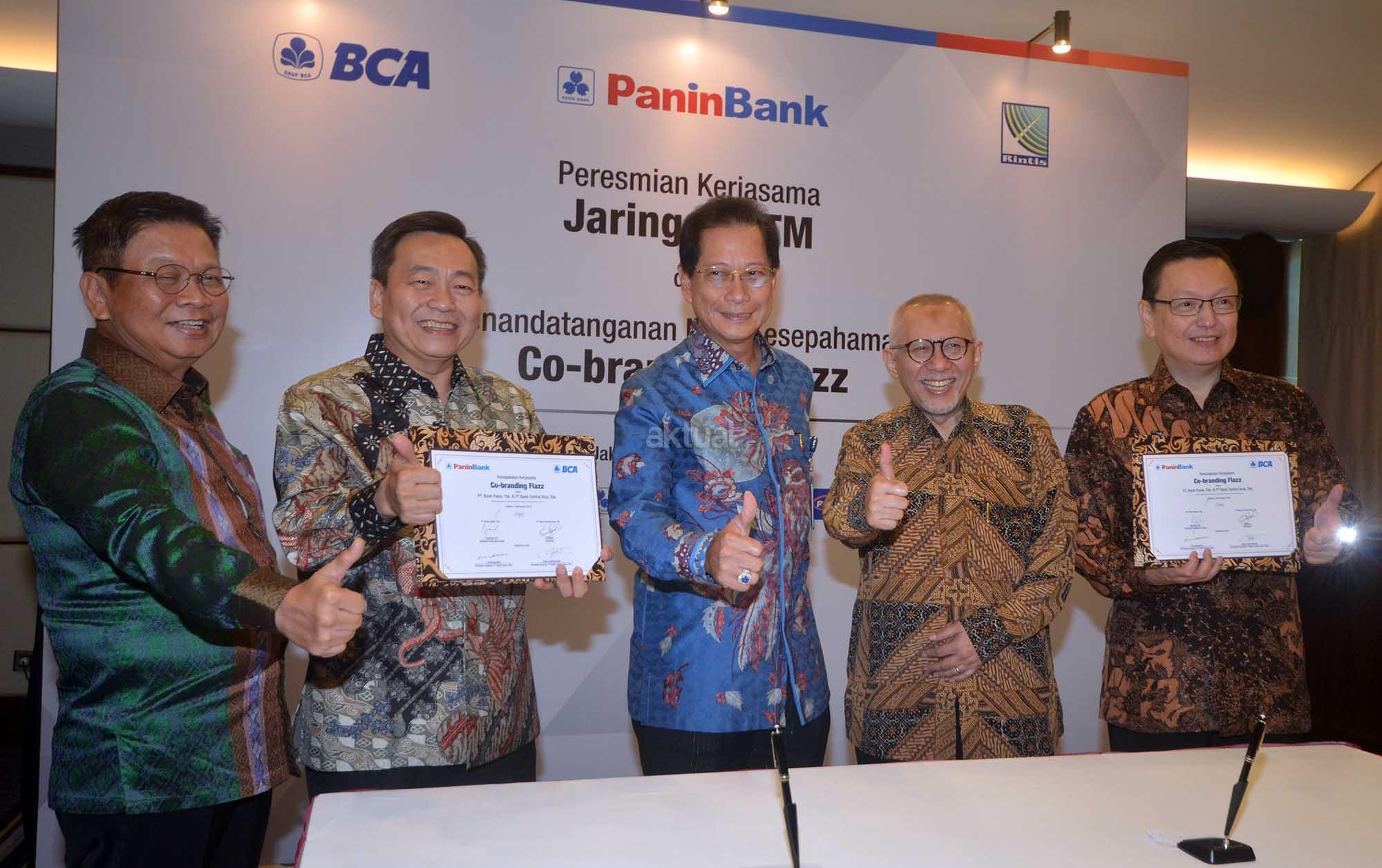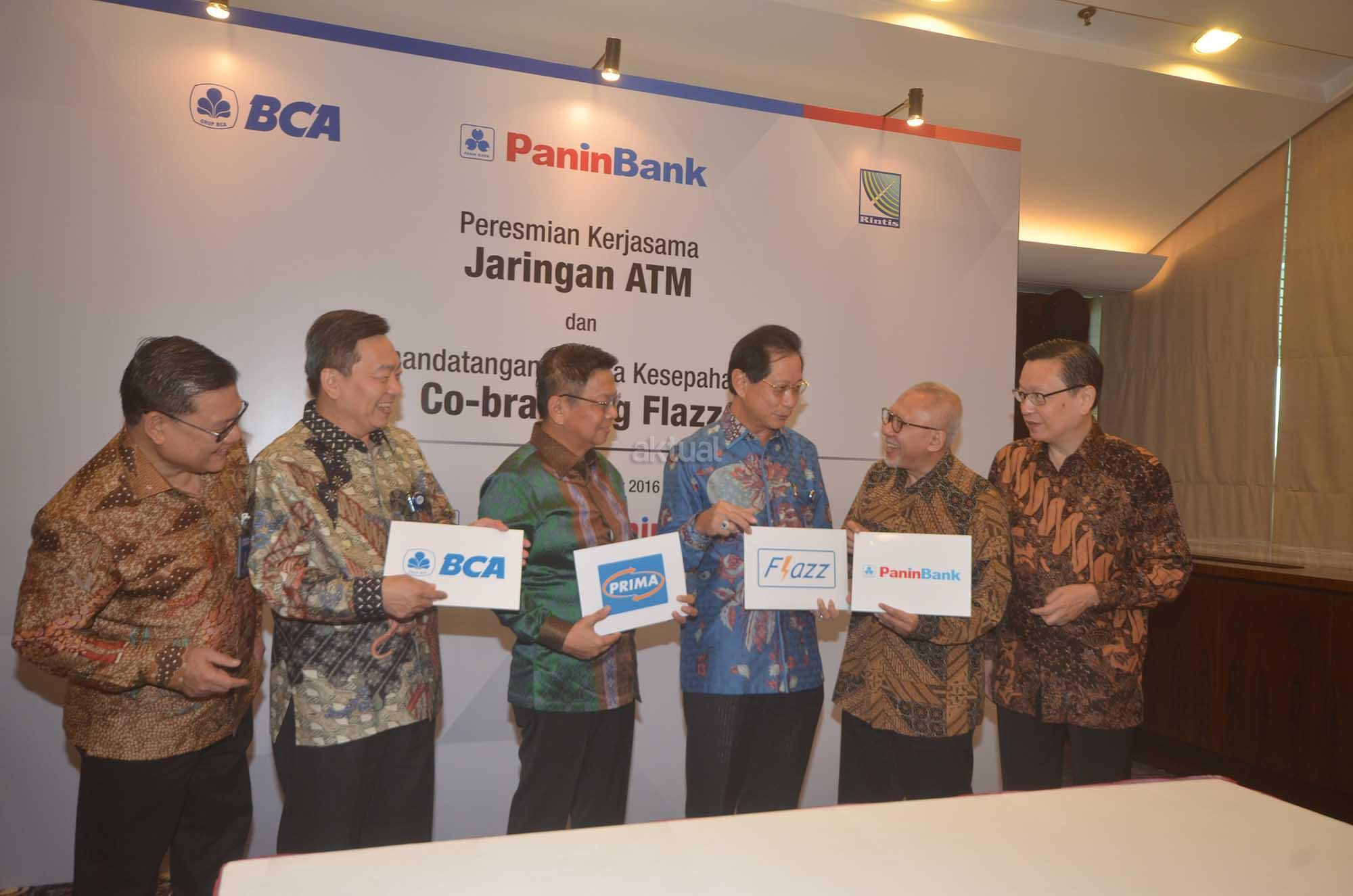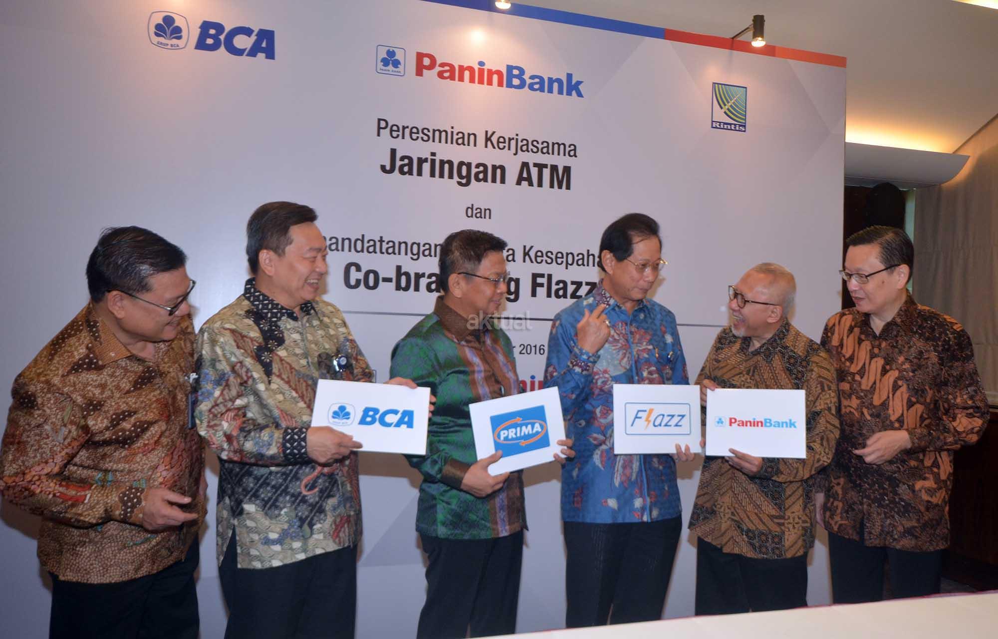 Presiden Direktur BCA Jahja Setiaatmadja (kedua kanan), Direktur BCA Santoso (kiri), Presdir PaninBank Herwidayatmo (tengah), Direktur PaninBank Ken Ng (kanan), dan Presdir PT Rintis Sejahtera Iwan Setiawan (kedua kiri), bertumpu tangan untuk berfoto saat penandatanganan nota kesepahaman di Jakarta, Rabu (2/11). PT Bank Central Asia, PT Bank Panin Tbk, dan PT Rintis Sejahtera (Rintis), berkerja sama untuk penerbitan kartu prabayar multiguna BCA, Flazz, dan bergabungnya PaninBank dalam Jaringan Prima untuk memperluas layanan transaksi. AKTUAL/Ekos S Hilman