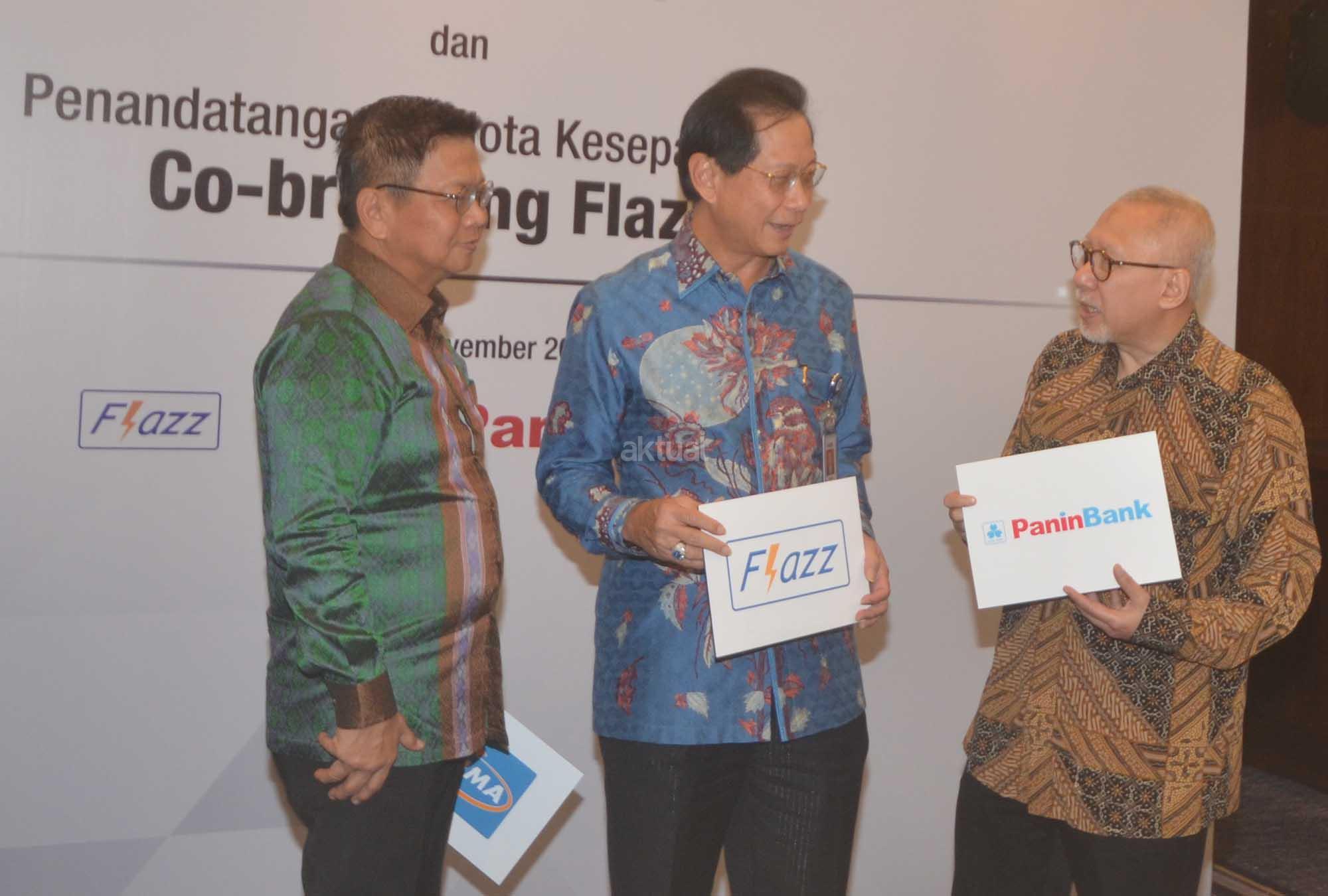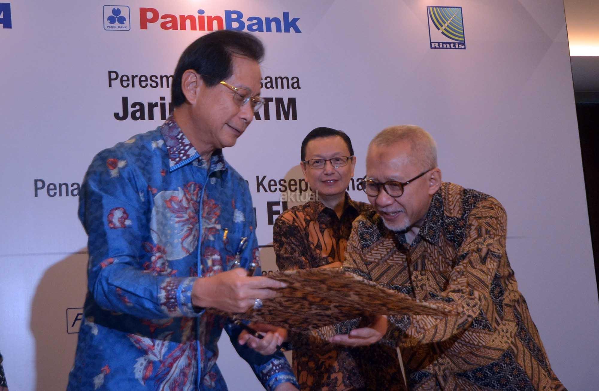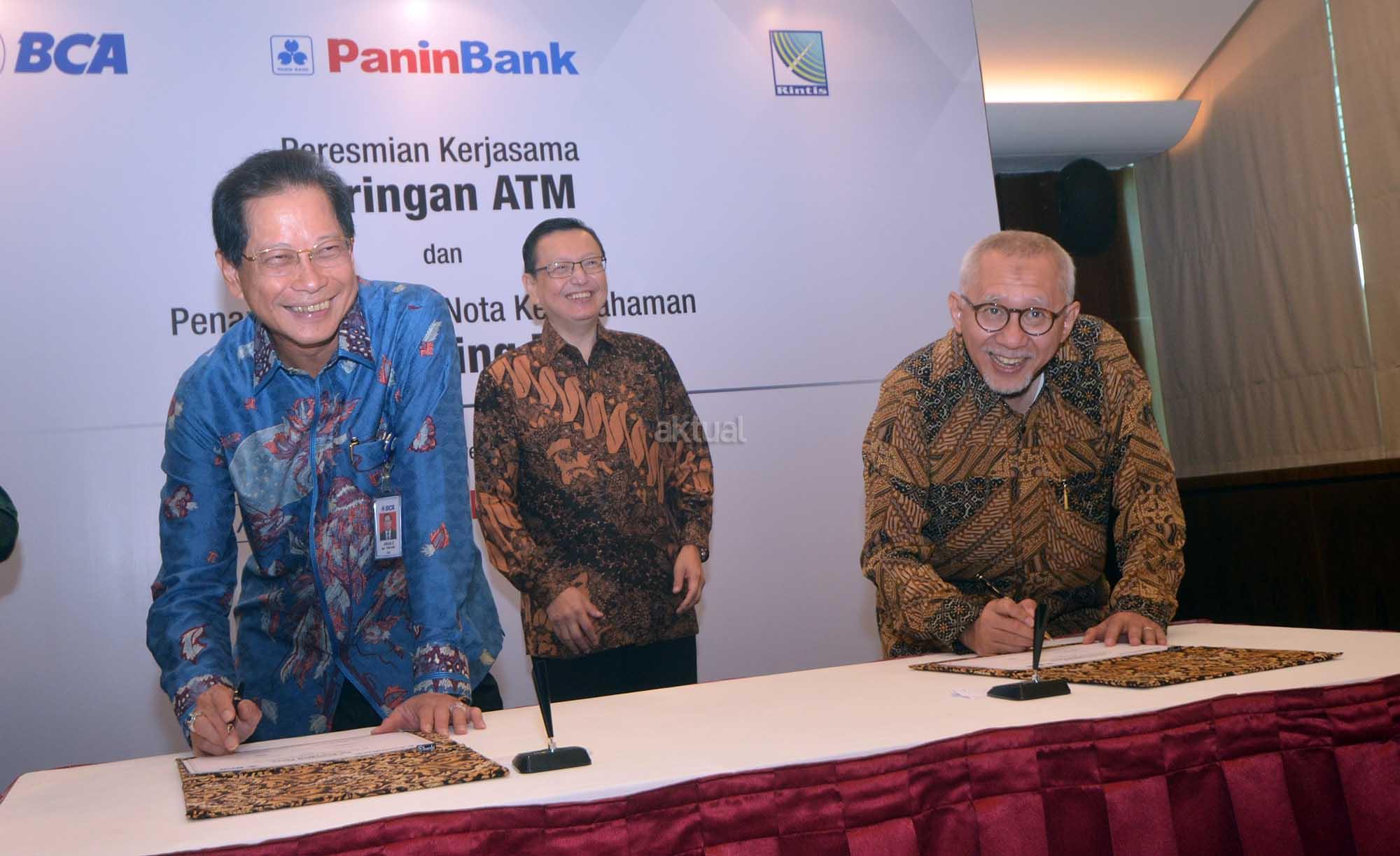 Presiden Direktur BCA Jahja Setiaatmadja (kedua kanan), Direktur BCA Santoso (kiri), Presdir PaninBank Herwidayatmo (tengah), Direktur PaninBank Ken Ng (kanan), dan Presdir PT Rintis Sejahtera Iwan Setiawan (kedua kiri), bertumpu tangan untuk berfoto saat penandatanganan nota kesepahaman di Jakarta, Rabu (2/11). PT Bank Central Asia, PT Bank Panin Tbk, dan PT Rintis Sejahtera (Rintis), berkerja sama untuk penerbitan kartu prabayar multiguna BCA, Flazz, dan bergabungnya PaninBank dalam Jaringan Prima untuk memperluas layanan transaksi. AKTUAL/Ekos S Hilman