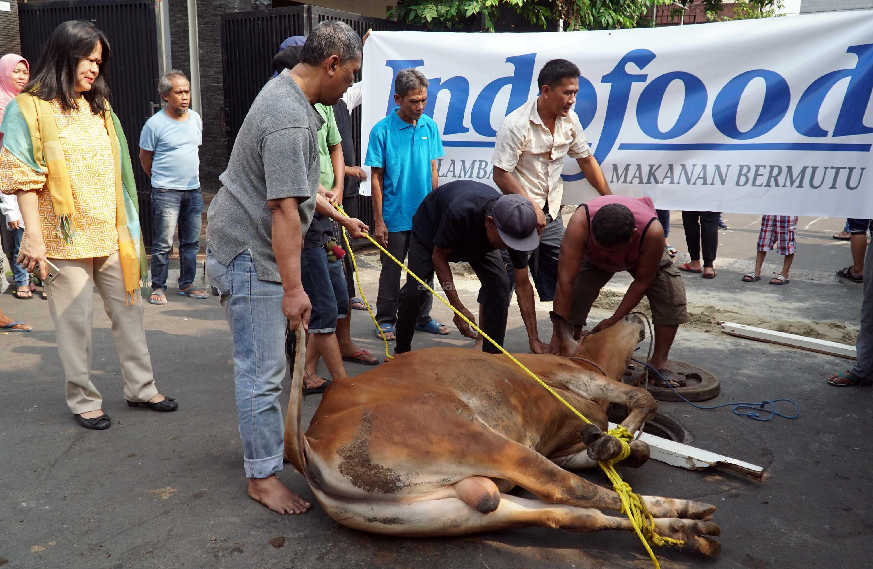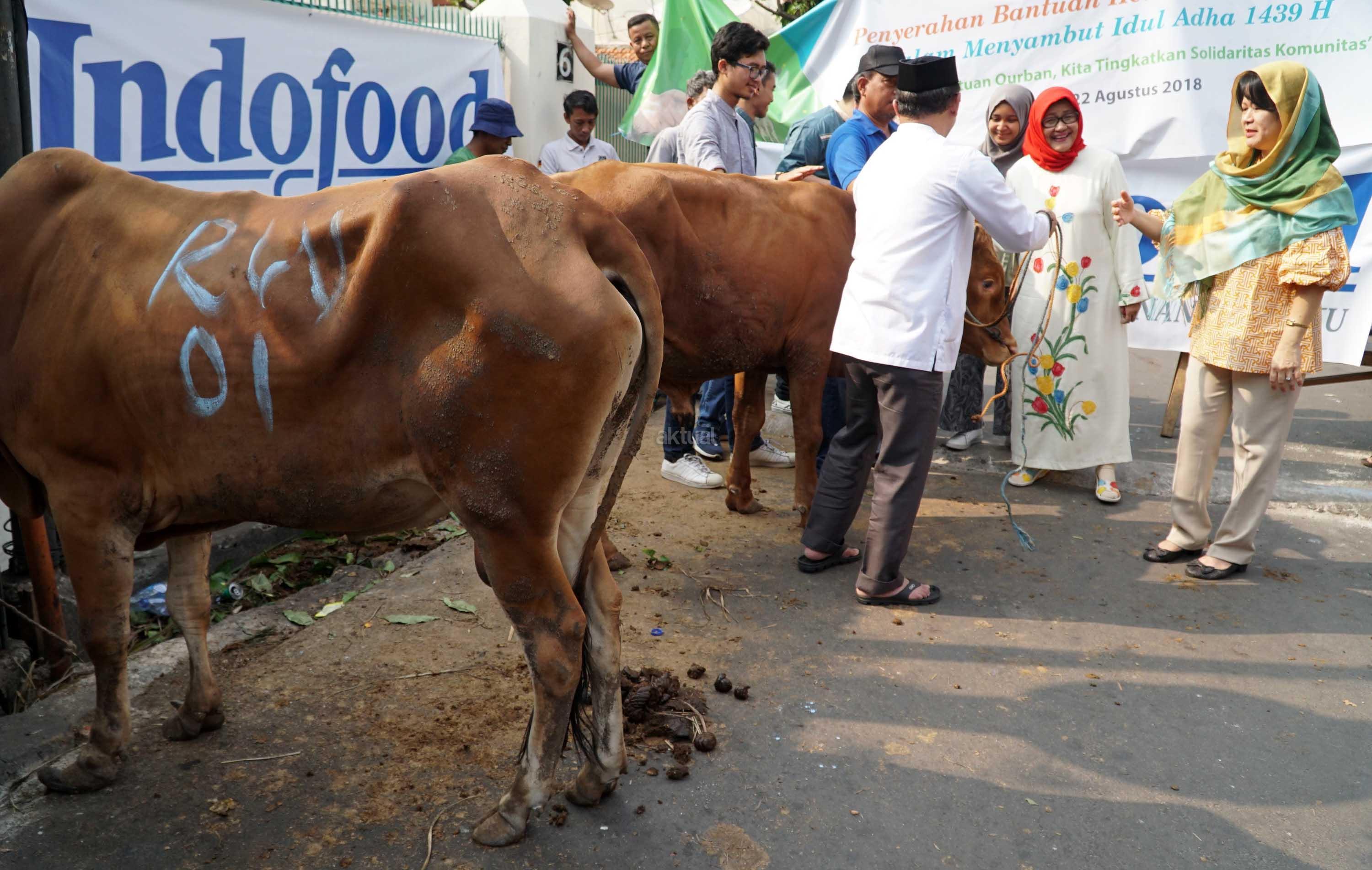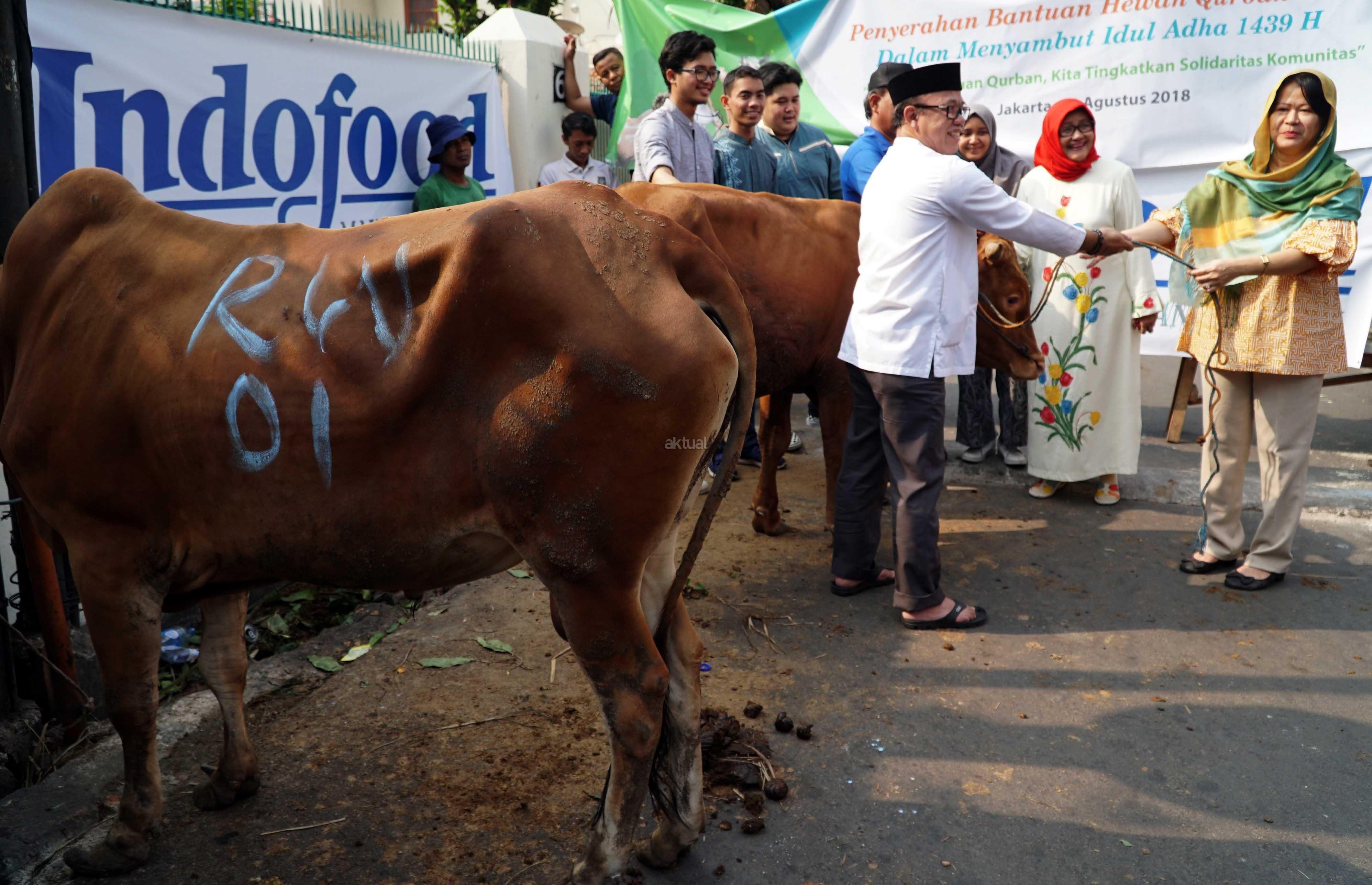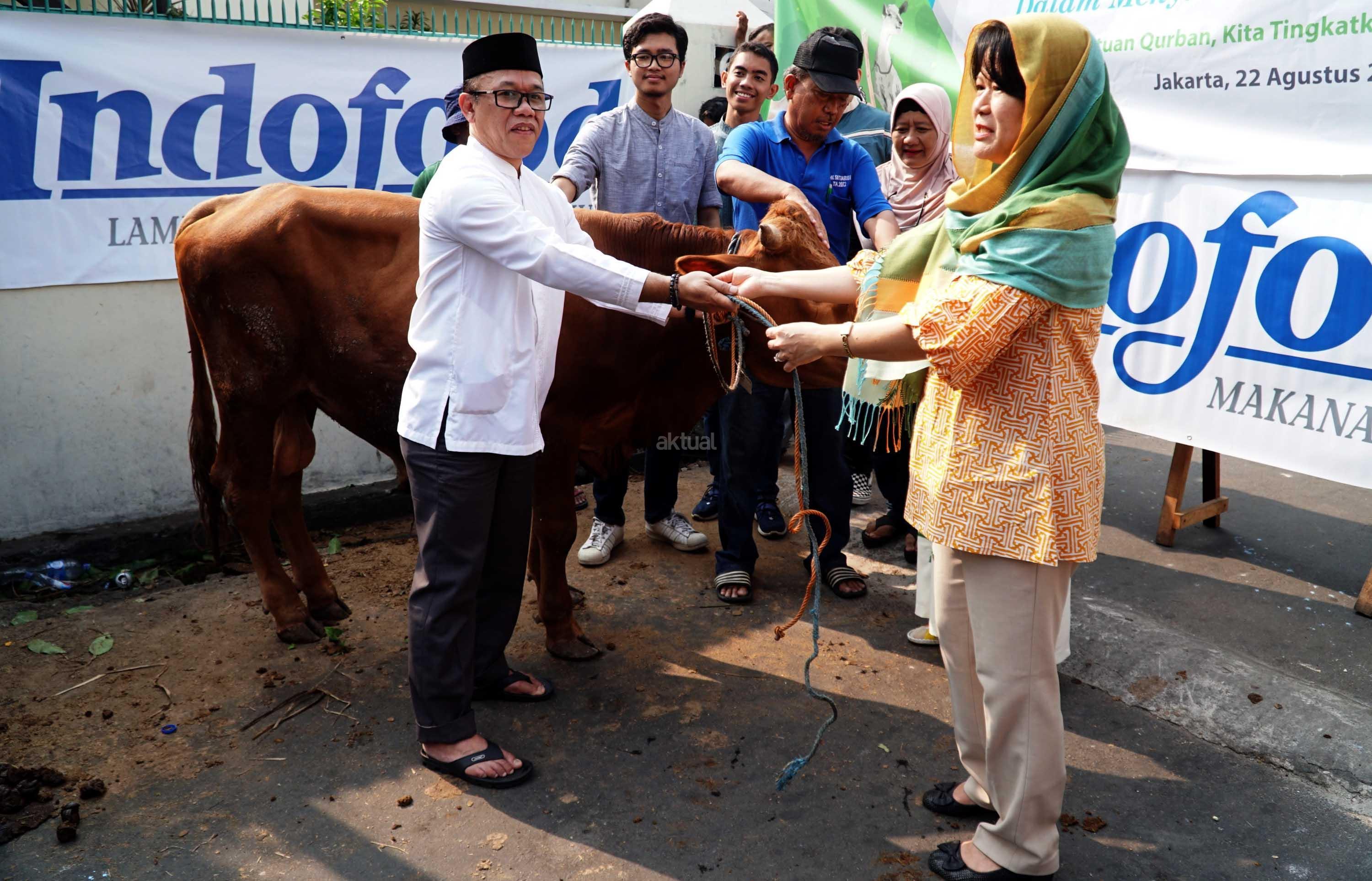 CSR Manager PT Indofood Sukses Makmur Tbk Patricia Lamidin (kanan) menyerahkan secara simbolis seekor sapi kepada Ketua RW 01, Kelurahan Setiabudi Dwisunu Irwantoro disaksikan perwakilan masyrakat yang berdomisili di 3 RW, Kelurahan Setiabudi, Jakarta, Rabu (22/8). PT Indofood Sukses Makmur Tbk memberikan bantuan hewan kurban sebanyak 85 sapi dan 219 kambing.Bantuan tersebut antara lain diberikan kepada masyarakat di sekitar kantor, pabrik dan perkebunan Grup Indofood yang tersebar di Indonesia. Kegiatan ini adalah salah satu bentuk program CSR Indofood yang selalu dilaksanakan setiap tahunnya. Program ini diharapkan dapat menjalin tali silahturahmi dan memupuk kepekaan sosial antar sesama manusia.Di Jakarta, bantuan hewan kurban berupa 3 ekor sapi di Kelurahan setiabudi. AKTUAL/Eko S Hilman