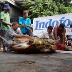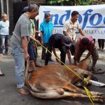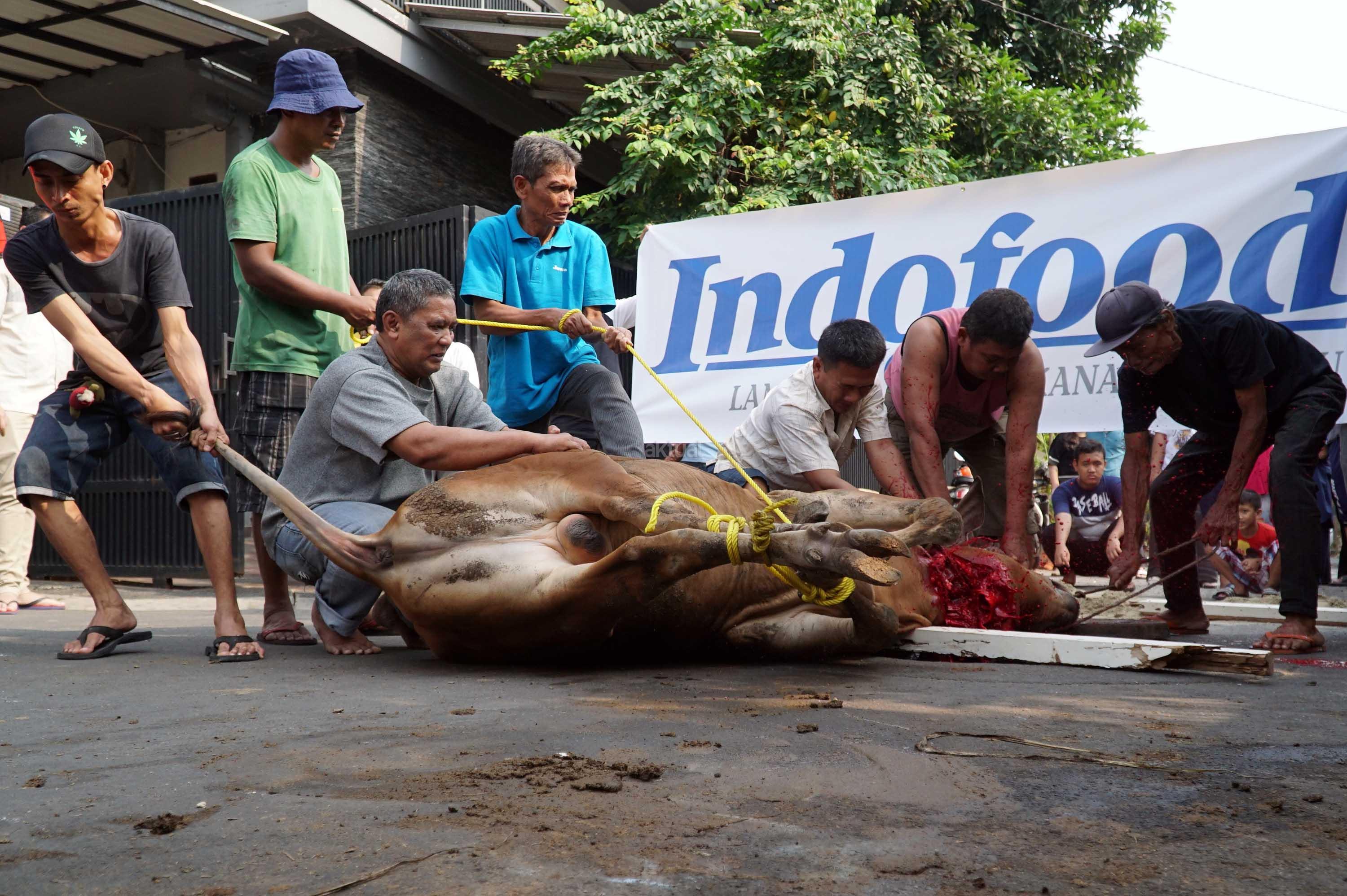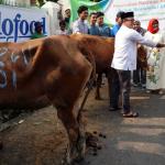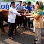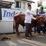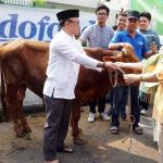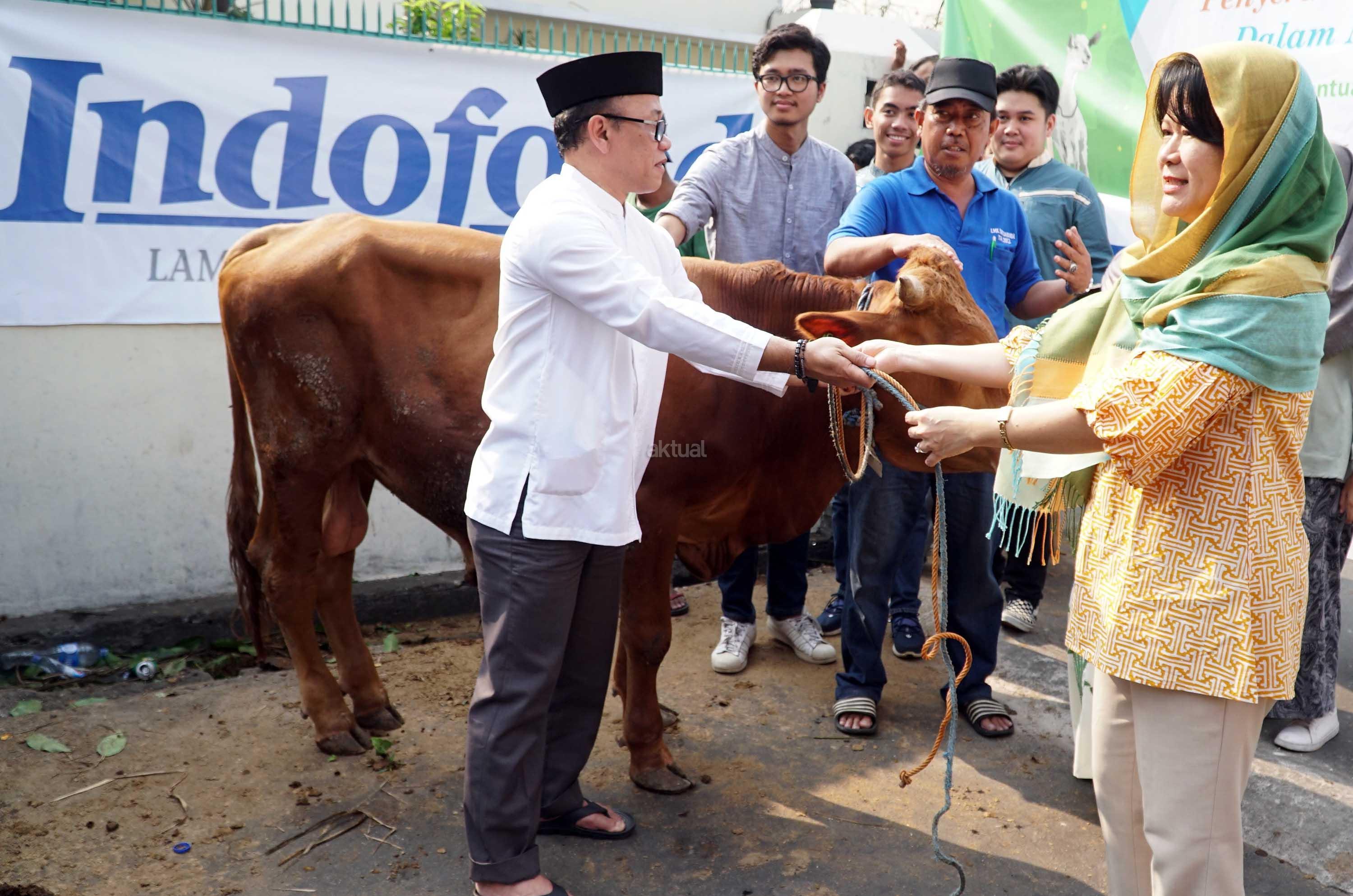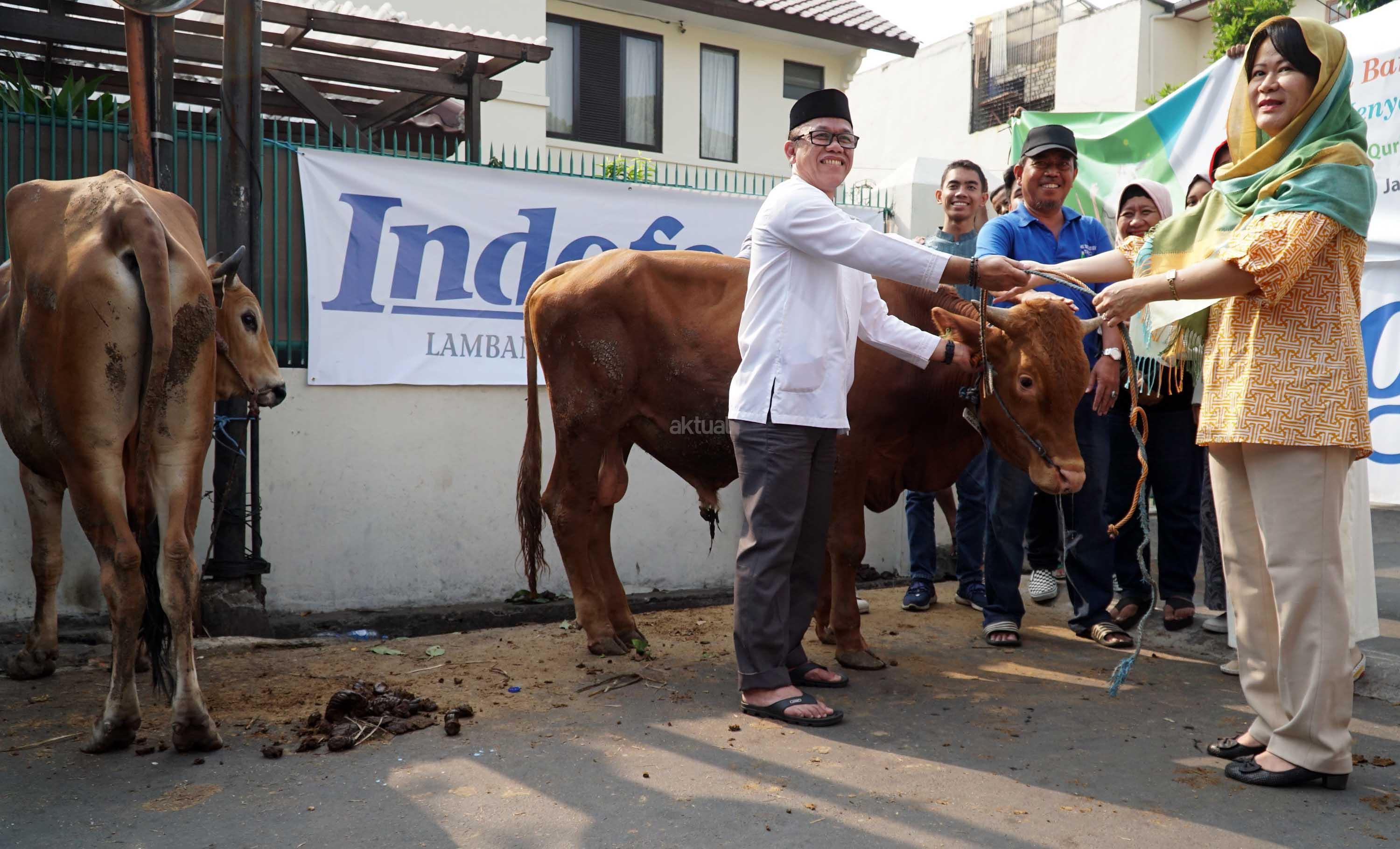 CSR Manager PT Indofood Sukses Makmur Tbk Patricia Lamidin (kanan) menyerahkan secara simbolis seekor sapi kepada Ketua RW 01, Kelurahan Setiabudi Dwisunu Irwantoro disaksikan perwakilan masyrakat yang berdomisili di 3 RW, Kelurahan Setiabudi, Jakarta, Rabu (22/8). PT Indofood Sukses Makmur Tbk memberikan bantuan hewan kurban sebanyak 85 sapi dan 219 kambing.Bantuan tersebut antara lain diberikan kepada masyarakat di sekitar kantor, pabrik dan perkebunan Grup Indofood yang tersebar di Indonesia. Kegiatan ini adalah salah satu bentuk program CSR Indofood yang selalu dilaksanakan setiap tahunnya. Program ini diharapkan dapat menjalin tali silahturahmi dan memupuk kepekaan sosial antar sesama manusia.Di Jakarta, bantuan hewan kurban berupa 3 ekor sapi di Kelurahan setiabudi. AKTUAL/Eko S Hilman