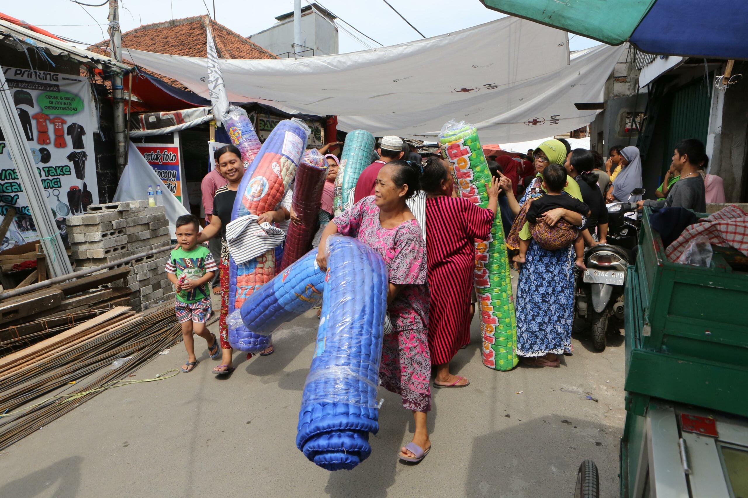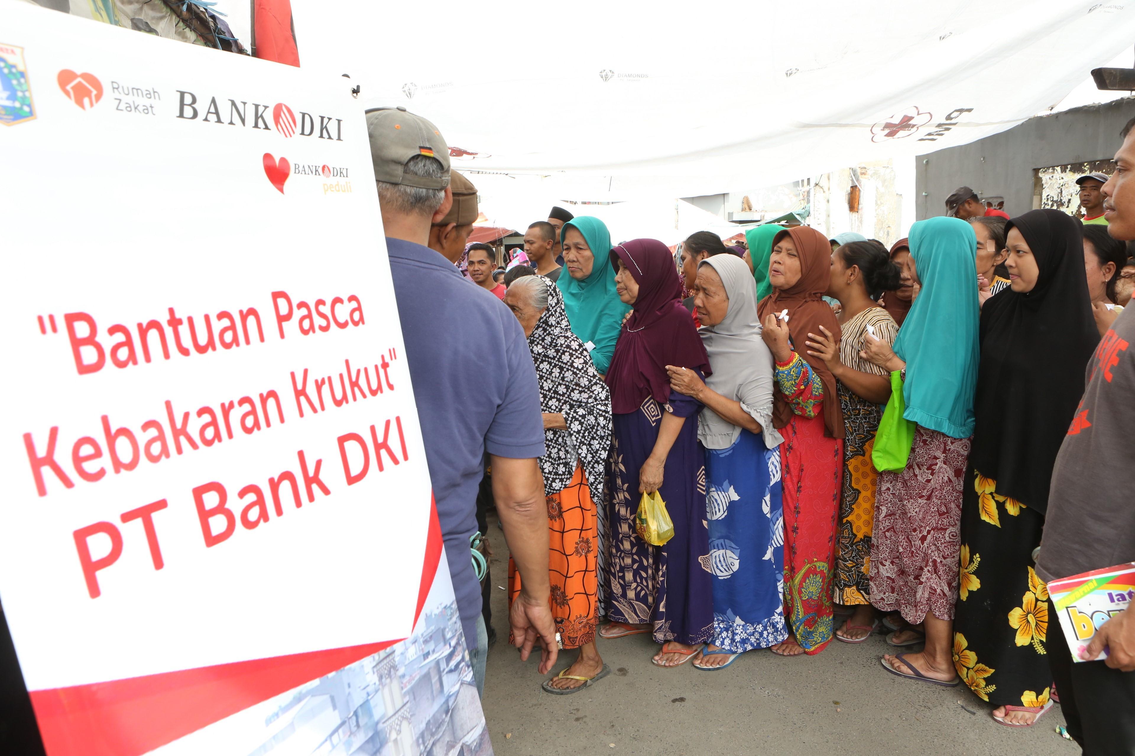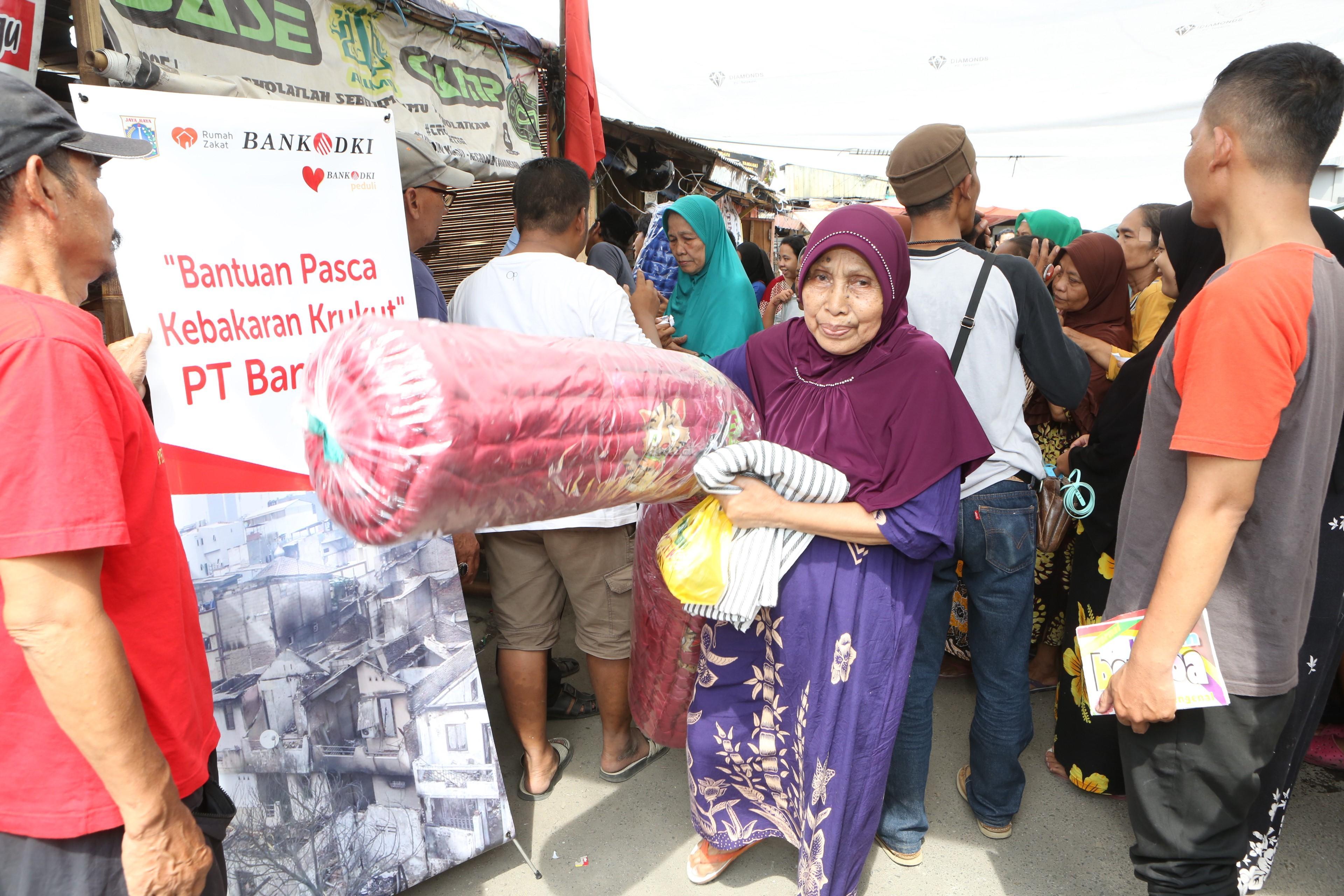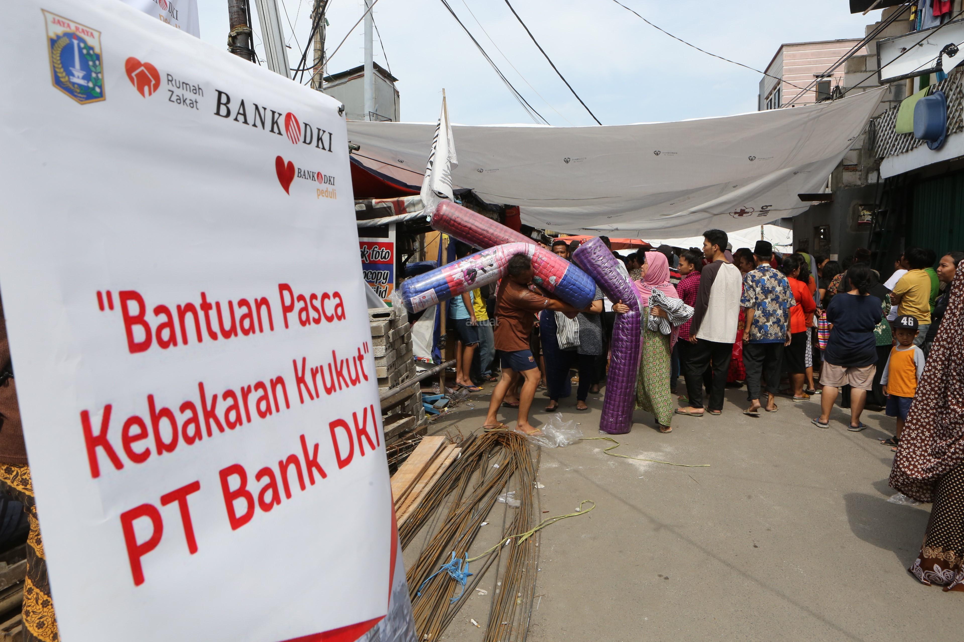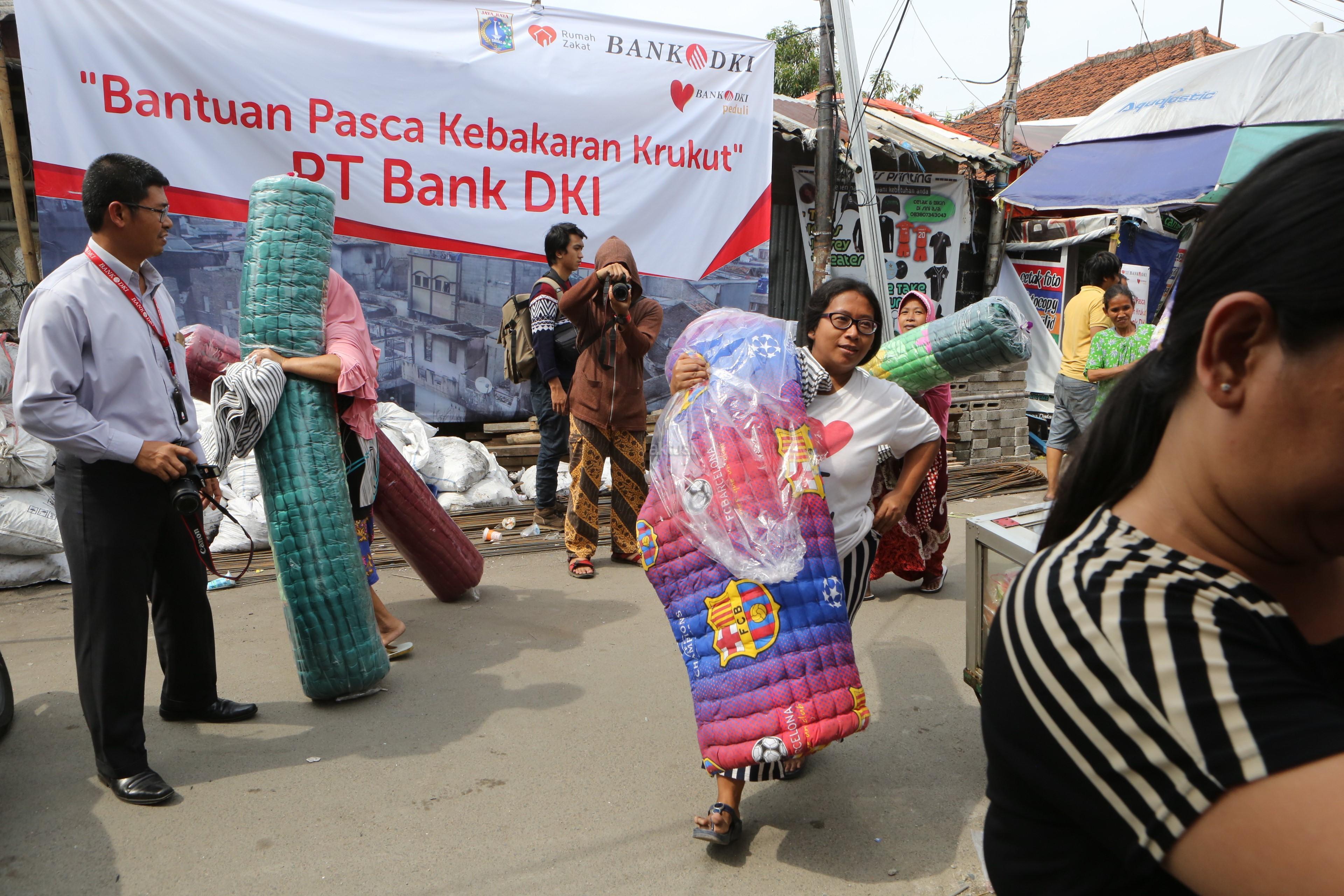 Warga mendapat bantuan kemanusian senilai Rp100 juta dalam bentuk alas tidur dan selimut dari Bank DKI untuk korban bencana kebakaran di Krukut, Jakarta, Selasa (27/02/2018). Sebelumnya Bank DKI juga menyerahkan bantuan korban kemanusiaan untuk bencana banjir di Jakarta. AKTUAL/Eko S Hilman