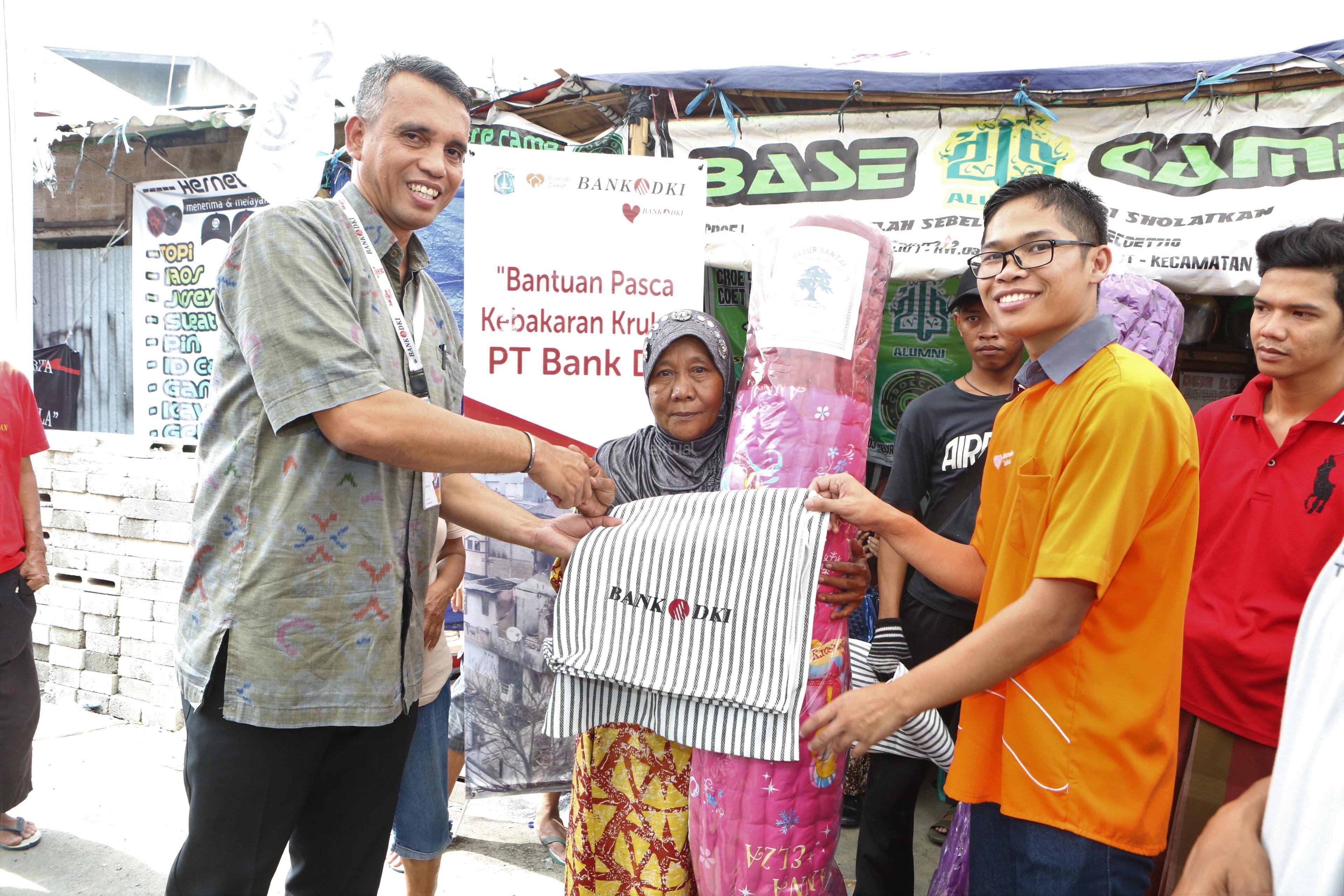 Corporate Secretary Bank DKI, Zulfarshah (kiri) menyerahkan bantuan kemanusian senilai Rp100 juta dalam bentuk alas tidur dan selimut kepada korban bencana kebakaran di Krukut, Jakarta, Selasa (27/02/2018). Sebelumnya Bank DKI juga menyerahkan bantuan korban kemanusiaan untuk bencana banjir di Jakarta. AKTUAL/Eko S Hilman
