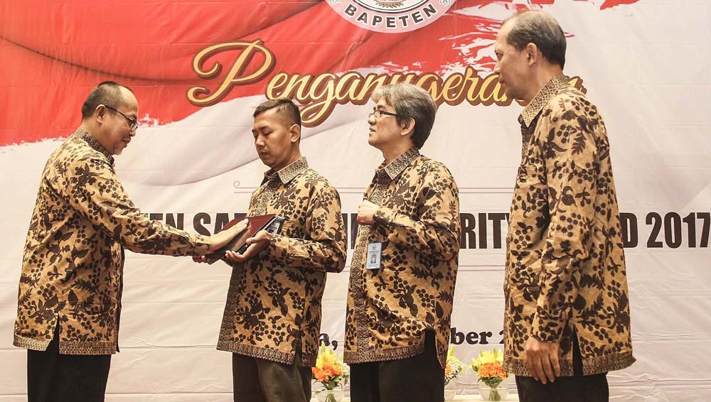 Kepala Badan Pengawas Tenaga Nuklir (Bapeten) Jazi Eko Istiyanto (tengah) menyerahkan penghargaan kepada penerima BSSA bidang Kesehatan saat launching Sistem Informasi Pelaporan dan Pengaduan (Sippaten) dan penganugerahan Bapeten Safety and Security Award (BSSA) tahun 2017 di Jakarta, Kamis (27/10/17). BSSA Bapeten bertujuan meningkatkan kesadaran hukum pengguna tenaga nuklir untuk menimbulkan budaya keselamatan dan pemanfaatan dengan sangat baik. AKTUAL/HO