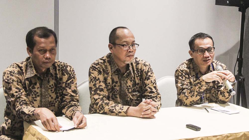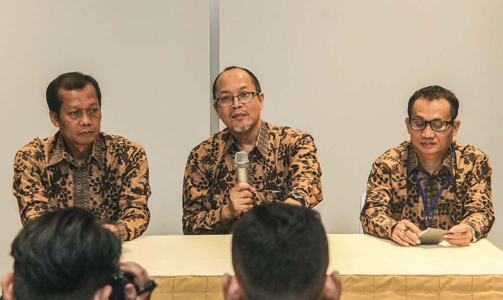 Kepala Badan Pengawas Tenaga Nuklir (Bapeten) Jazi Eko Istiyanto (tengah) bersama Direktur Inspeksi Fasilitas Radiasi dan Zat Radioaktif Bepeten Sugeng Sumbarjo (kanan) dan Deputi Perizinan dan Inspeksi Bapeten Khoirul Huda memberikan keterangan pers saat launching Sistem Informasi Pelaporan dan Pengaduan (Sippaten) dan penganugerahan Bapeten Safety and Security Award (BSSA) tahun 2017 di Jakarta, Kamis (27/10/17). BSSA Bapeten bertujuan meningkatkan kesadaran hukum pengguna tenaga nuklir untuk menimbulkan budaya keselamatan dan pemanfaatan dengan sangat baik. AKTUAL/HO