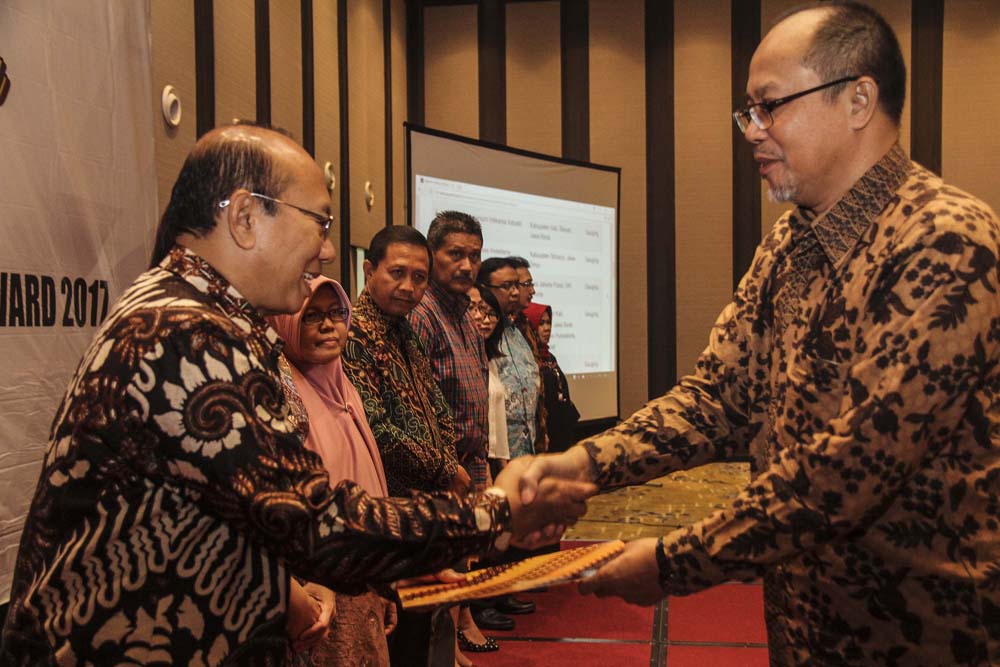 Kepala Badan Pengawas Tenaga Nuklir (Bapeten) Jazi Eko Istiyanto (kanan) menyerahkan penghargaan kepada penerima BSSA bidang Kesehatan saat launching Sistem Informasi Pelaporan dan Pengaduan (Sippaten) dan penganugerahan Bapeten Safety and Security Award (BSSA) tahun 2017 di Jakarta, Kamis (27/10/17). BSSA Bapeten bertujuan meningkatkan kesadaran hukum pengguna tenaga nuklir untuk menimbulkan budaya keselamatan dan pemanfaatan dengan sangat baik. AKTUAL/HO