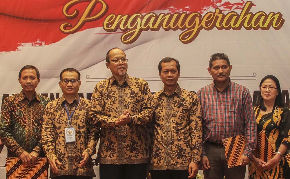 Kepala Badan Pengawas Tenaga Nuklir (Bapeten) Jazi Eko Istiyanto (ketiga kiri) bersama Direktur Inspeksi Fasilitas Radiasi dan Zat Radioaktif Bepeten Sugeng Sumbarjo (kedua kiri) dan Deputi Perizinan dan Inspeksi Bapeten Khoirul Huda (ketiga kanan) foto bersama penerim BSSA saat launching Sistem Informasi Pelaporan dan Pengaduan (Sippaten) dan penganugerahan Bapeten Safety and Security Award (BSSA) tahun 2017 di Jakarta, Kamis (27/10/17). BSSA Bapeten bertujuan meningkatkan kesadaran hukum pengguna tenaga nuklir untuk menimbulkan budaya keselamatan dan pemanfaatan dengan sangat baik. AKTUAL/HO