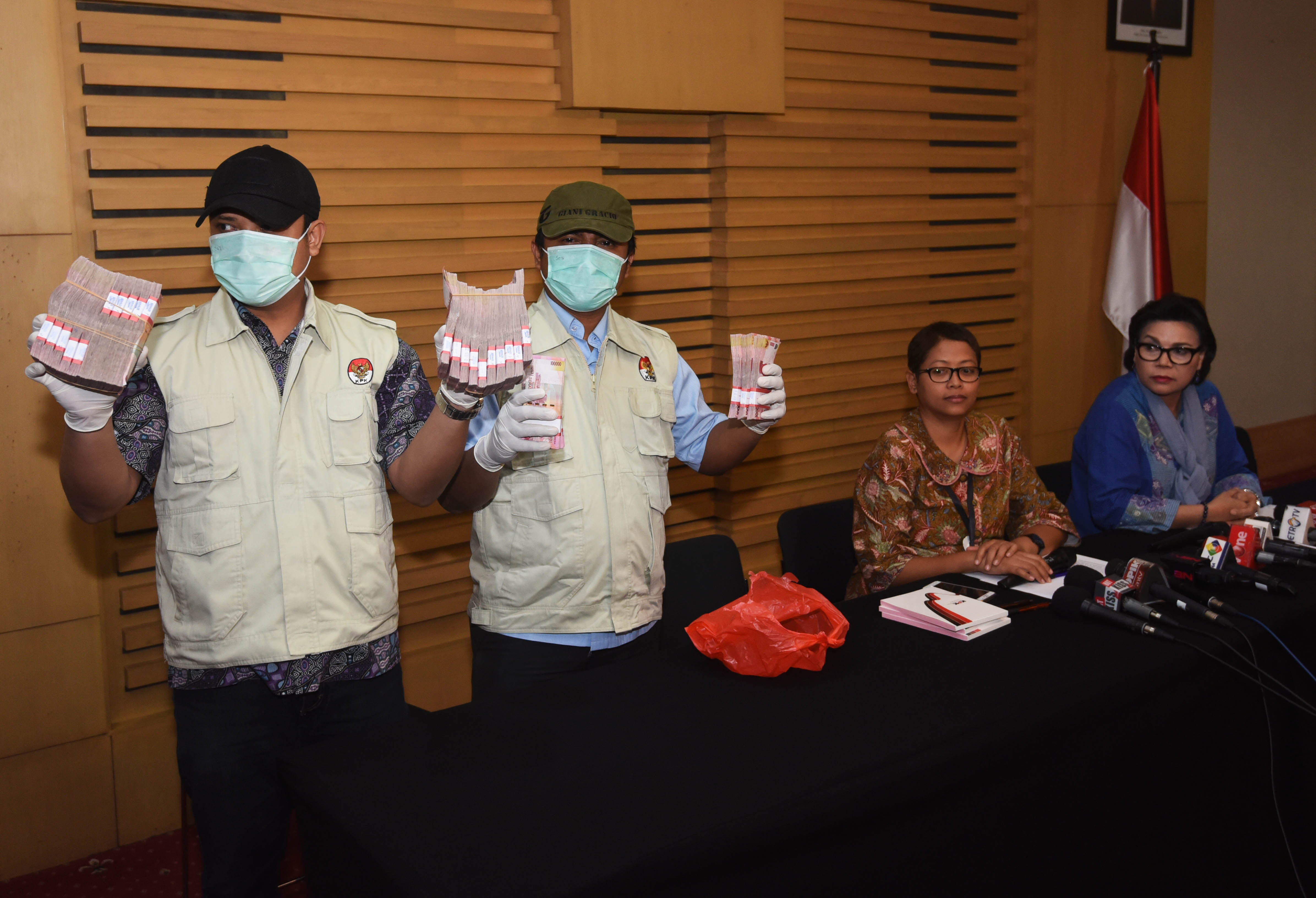 Wakil Ketua KPK Basaria Panjaitan (kanan) didampingi Plh Kabiro Humas Yuyuk Andriati (kedua kanan) memperhatikan barang bukti yang disita dari hasil operasi tangkap tangan kasus suap panitera PN Jakarta Utara di Jakarta, Kamis (16/6). Dalam OTT tersebut KPK menetapkan empat tersangka yaitu Panitera PN Jakarta Utara, dua pengacara dan seorang penyuap beserta uang Rp250 Juta yang diduga sebagai suap untuk mengurangi masa hukuman artis Saiful Jamil dalam kasus pencabulan terhadap anak. ANTARA FOTO/Akbar Nugroho Gumay/ama/16