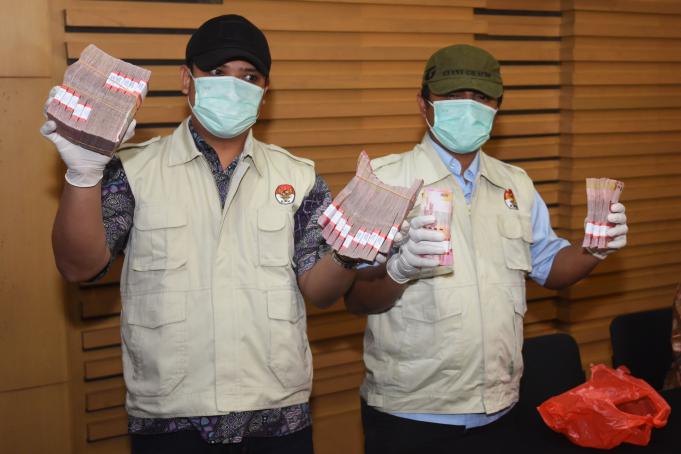 Petugas menunjukkan uang barang bukti yang disita dari operasi tangkap tangan kasus suap panitera PN Jakarta Utara di Jakarta, Kamis (16/6). Dalam OTT tersebut KPK menetapkan empat tersangka yaitu Panitera PN Jakarta Utara, dua pengacara dan seorang penyuap beserta uang Rp250 Juta yang diduga sebagai suap untuk mengurangi masa hukuman artis Saiful Jamil dalam kasus pencabulan terhadap anak. ANTARA FOTO/Akbar Nugroho Gumay/ama/16