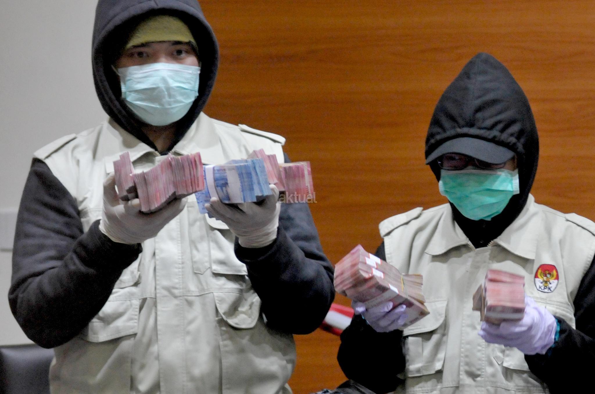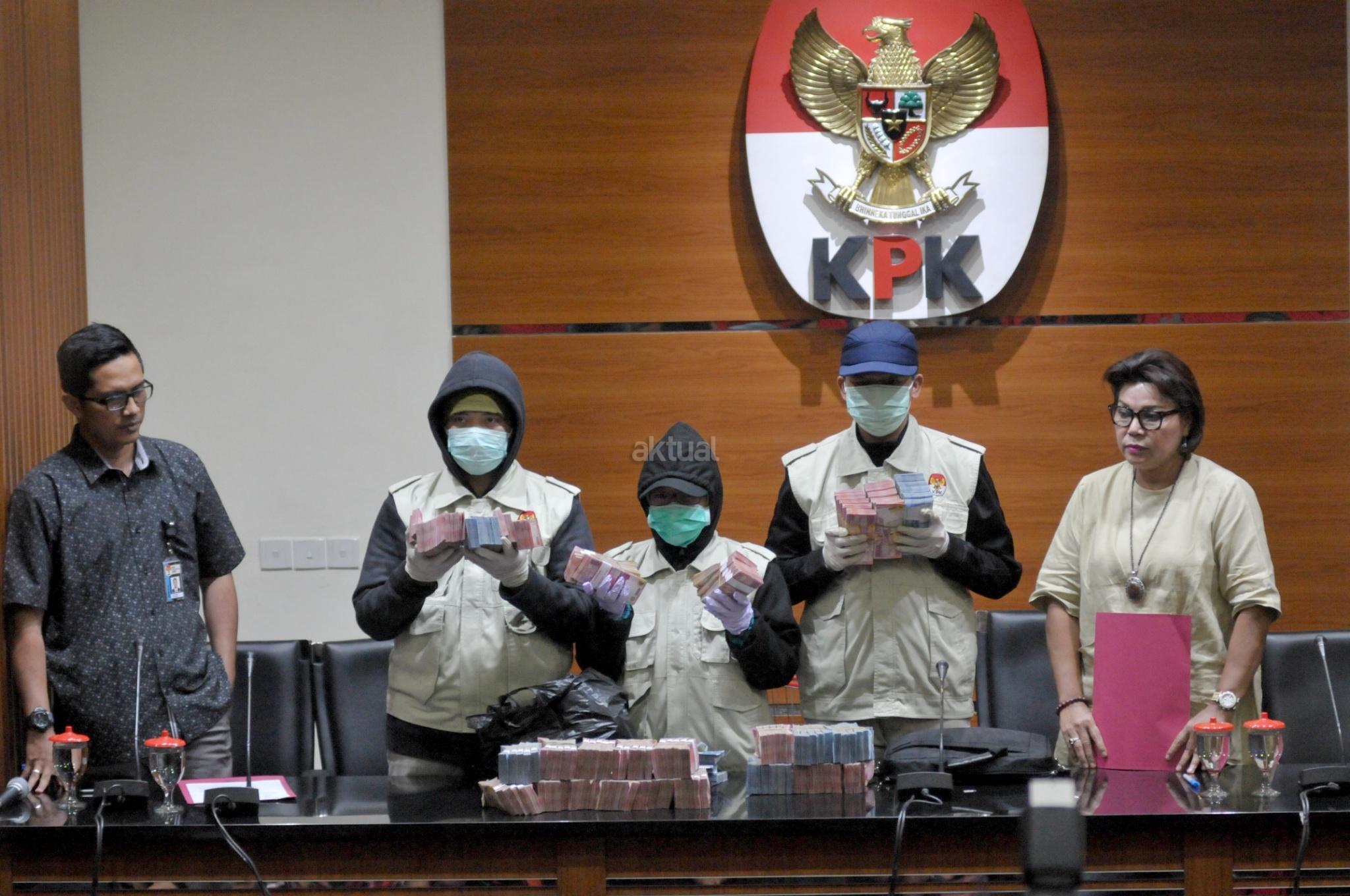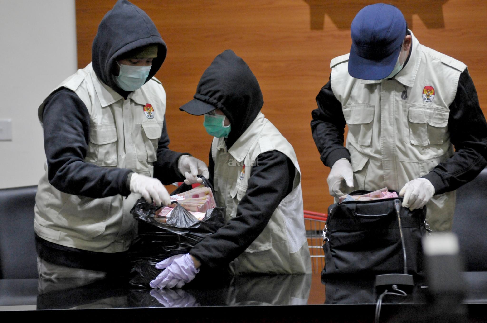 Penyidik KPK memperlihatkan barang bukti terkait OTT Suap Walikota Cilegon di Gedung KPK, Jakarta, Sabtu (23/9). KPK menetapkan enam orang tersangka yang terjaring Operasi Tangkap Tangan (OTT) salah satunya Wali Kota Cilegon Tubagus Iman Ariyadi atas dugaan suap analisa mengenai dampak lingkungan (Amdal) proyek Transmart dengan total uang disita menjadi barang bukti KPK sebesar Rp 1,1 Miliar serta KPK menyebut suap tersebut merupakan modus baru karena melalui Corporate Social Responsibility (CSR). AKTUAL/Tino Oktaviano