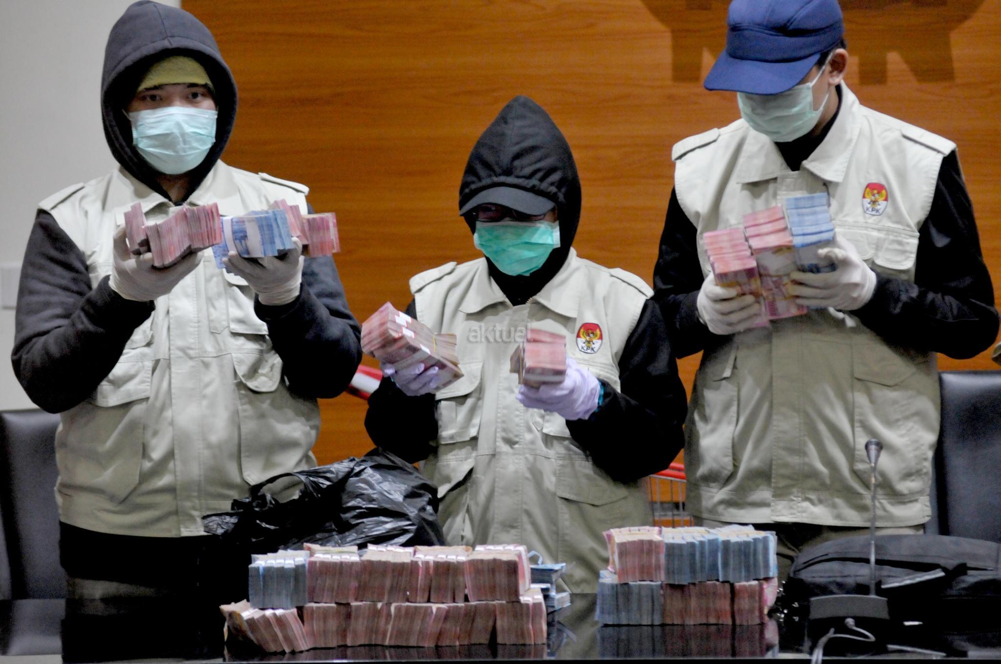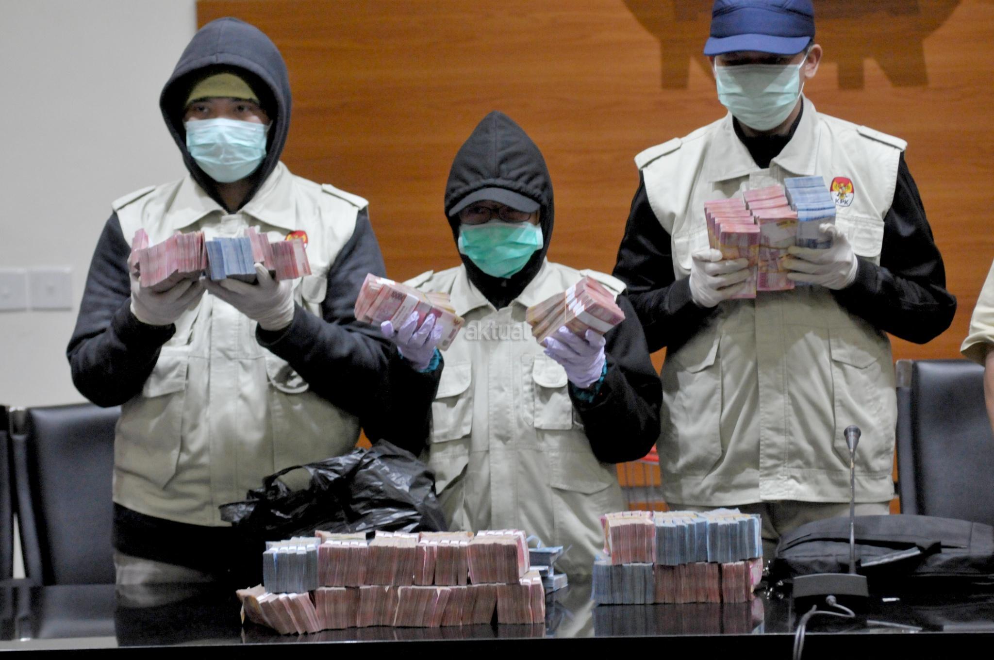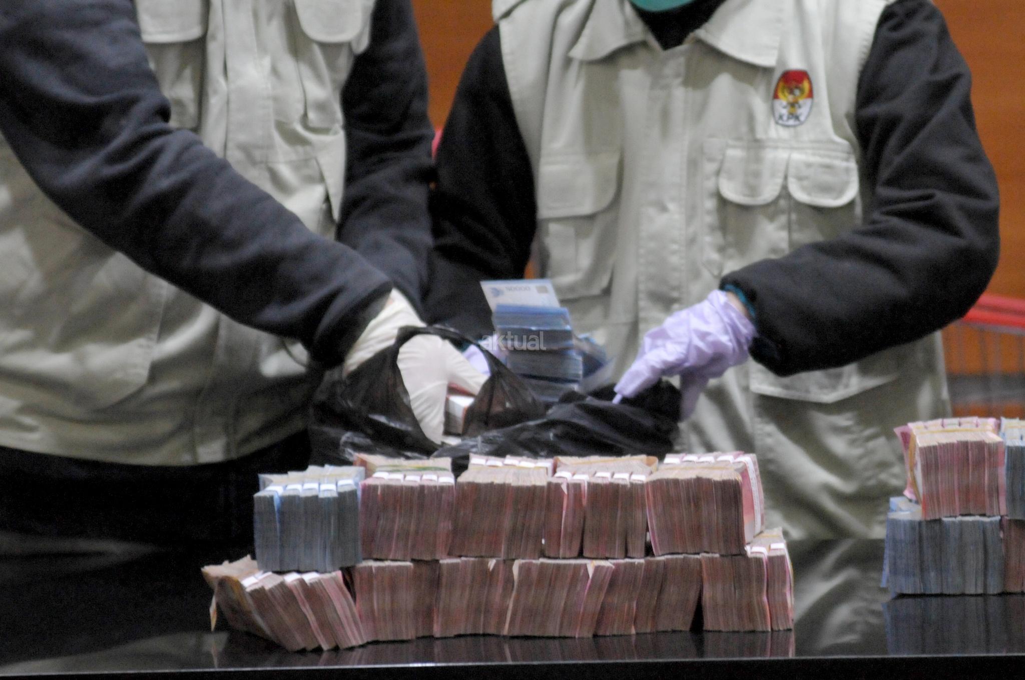 Penyidik KPK memperlihatkan barang bukti terkait OTT Suap Walikota Cilegon di Gedung KPK, Jakarta, Sabtu (23/9). KPK menetapkan enam orang tersangka yang terjaring Operasi Tangkap Tangan (OTT) salah satunya Wali Kota Cilegon Tubagus Iman Ariyadi atas dugaan suap analisa mengenai dampak lingkungan (Amdal) proyek Transmart dengan total uang disita menjadi barang bukti KPK sebesar Rp 1,1 Miliar serta KPK menyebut suap tersebut merupakan modus baru karena melalui Corporate Social Responsibility (CSR). AKTUAL/Tino Oktaviano