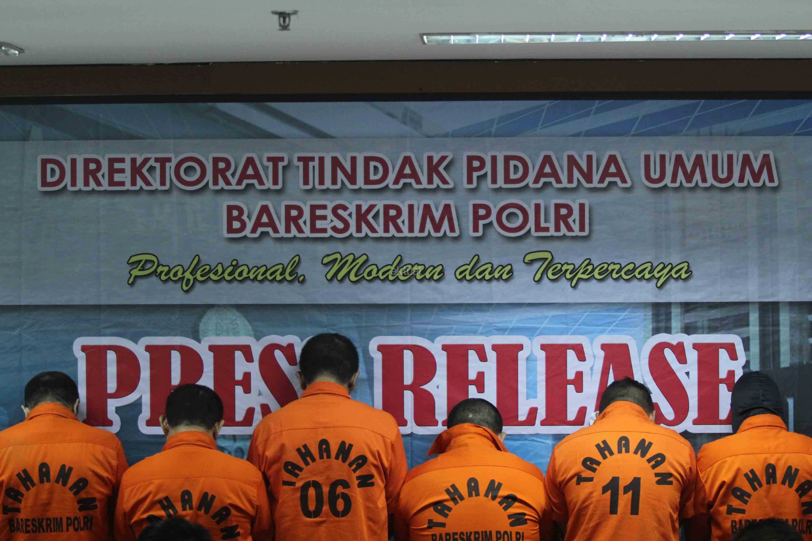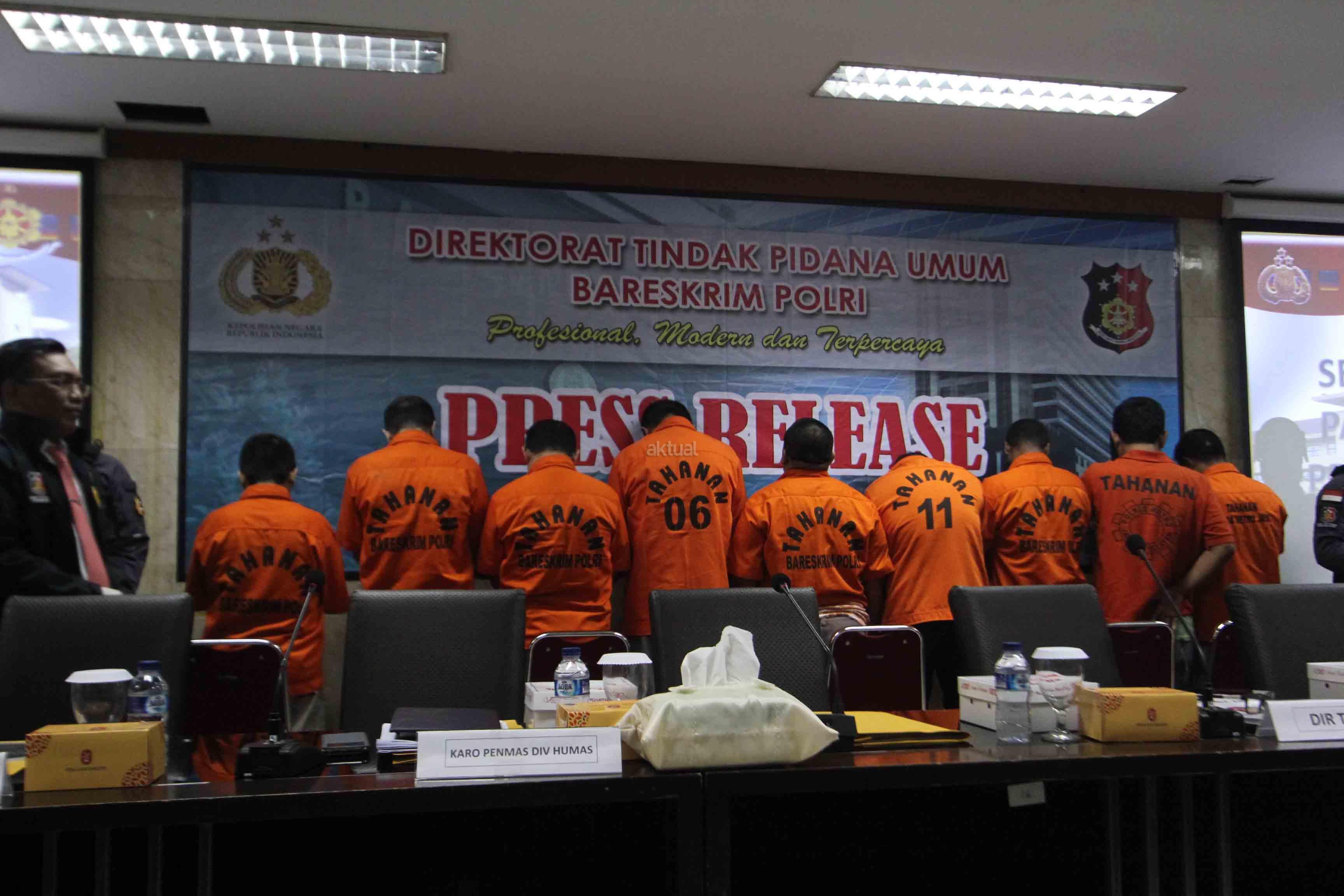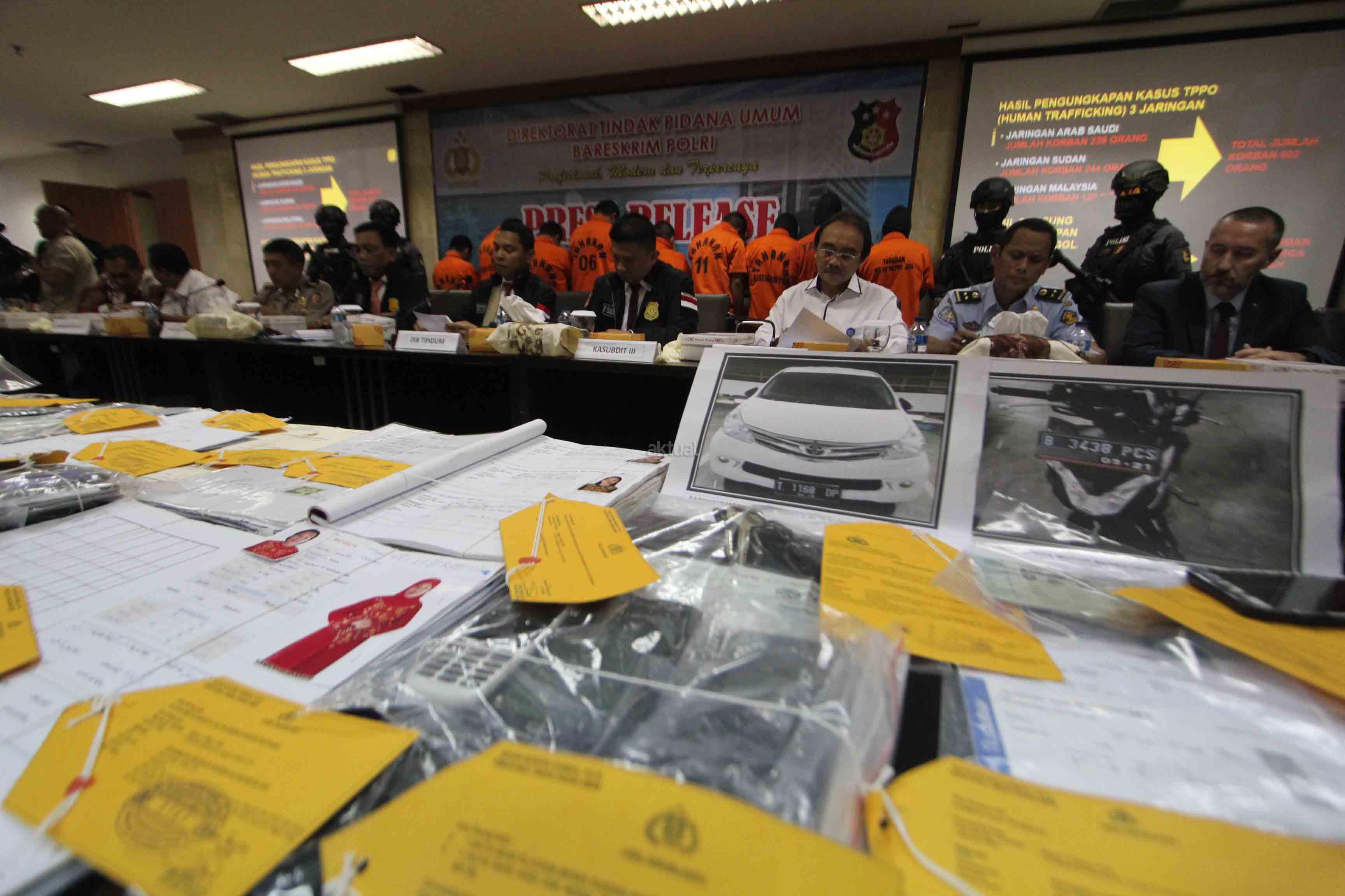Bareskrim Mabes Polri berhasil melakukan pengungkapan tindak pidana perdagangan orang jaringan Arab Saudi, Sudan, Malaysia dan penyelundupan orang jalur Papua dengan mengamankan 9 orang tersangka dan sejumlah barang bukti. AKTUAL/Tino Oktaviano