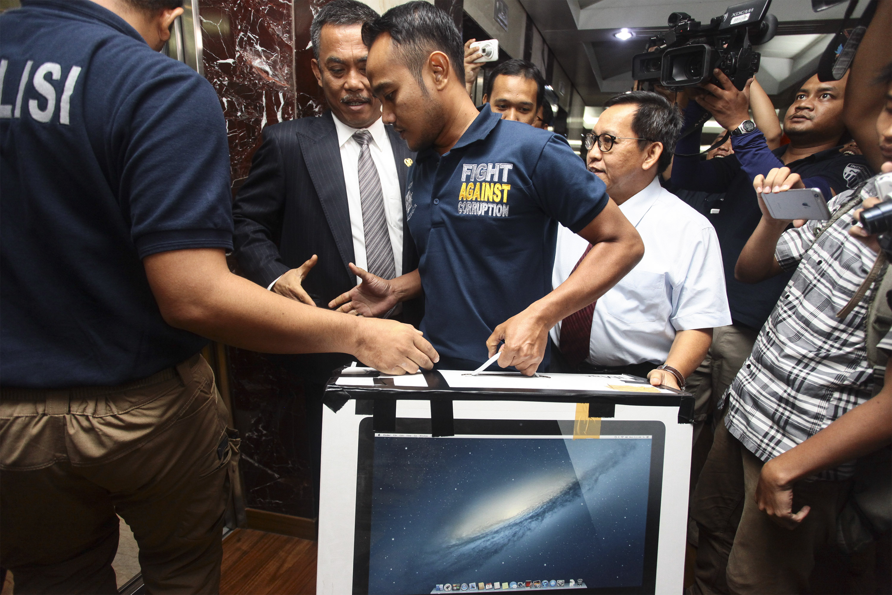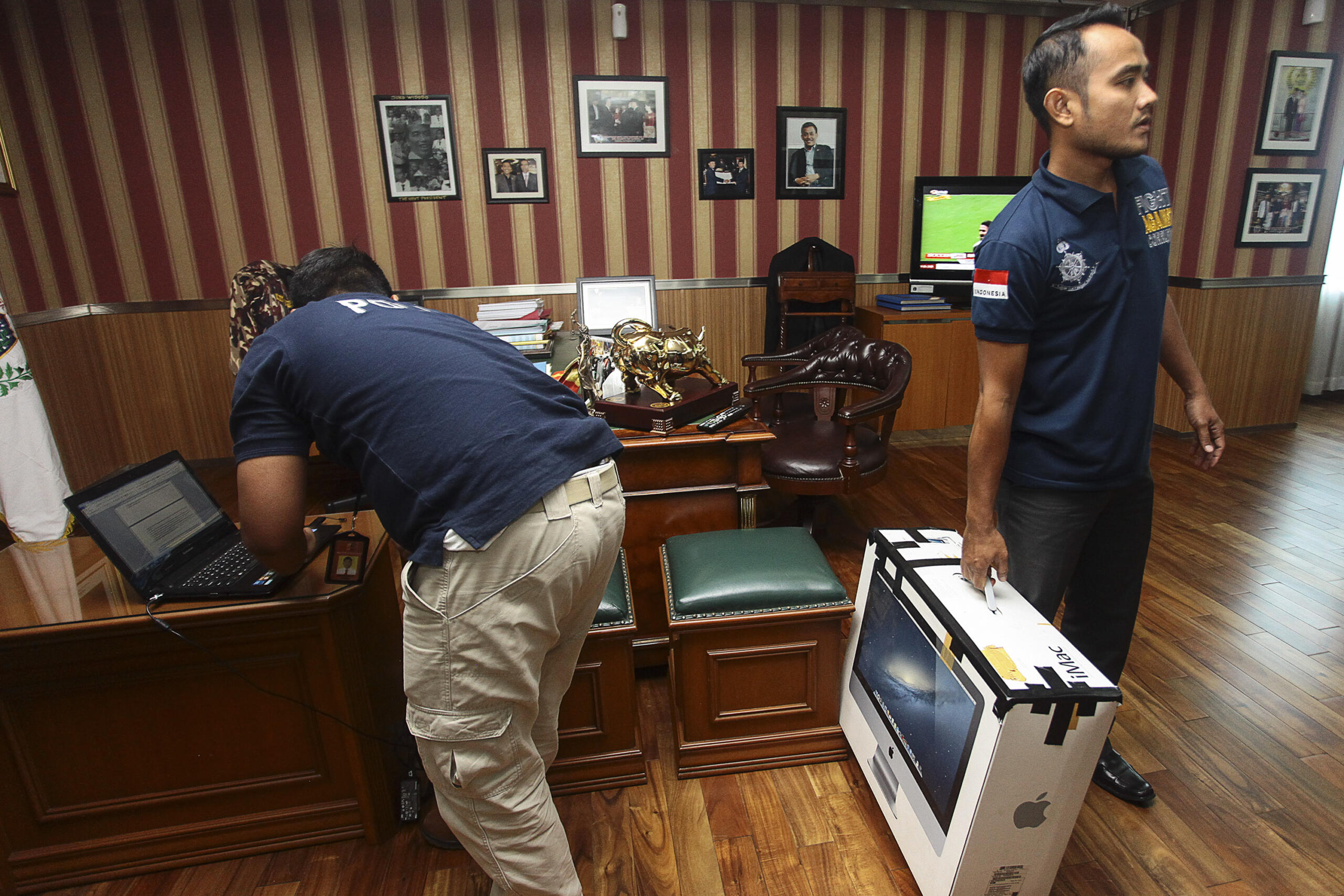 Petugas Badan Reserse dan Kriminal (Bareskrim) Polri membawa komputer usai melakukan penggeledahan di ruang kerja Ketua DPRD DKI Jakarta Prasetio Edi Marsudi di kantor DPRD DKI Jakarta, Kamis (3/3). Penggeledahan tersebut terkait kasus dugaan korupsi pengadaan Uninterruptible Power Supply (UPS) di sejumlah sekolah di Jakarta. ANTARA FOTO/Muhammad Adimaja/aww/16.