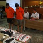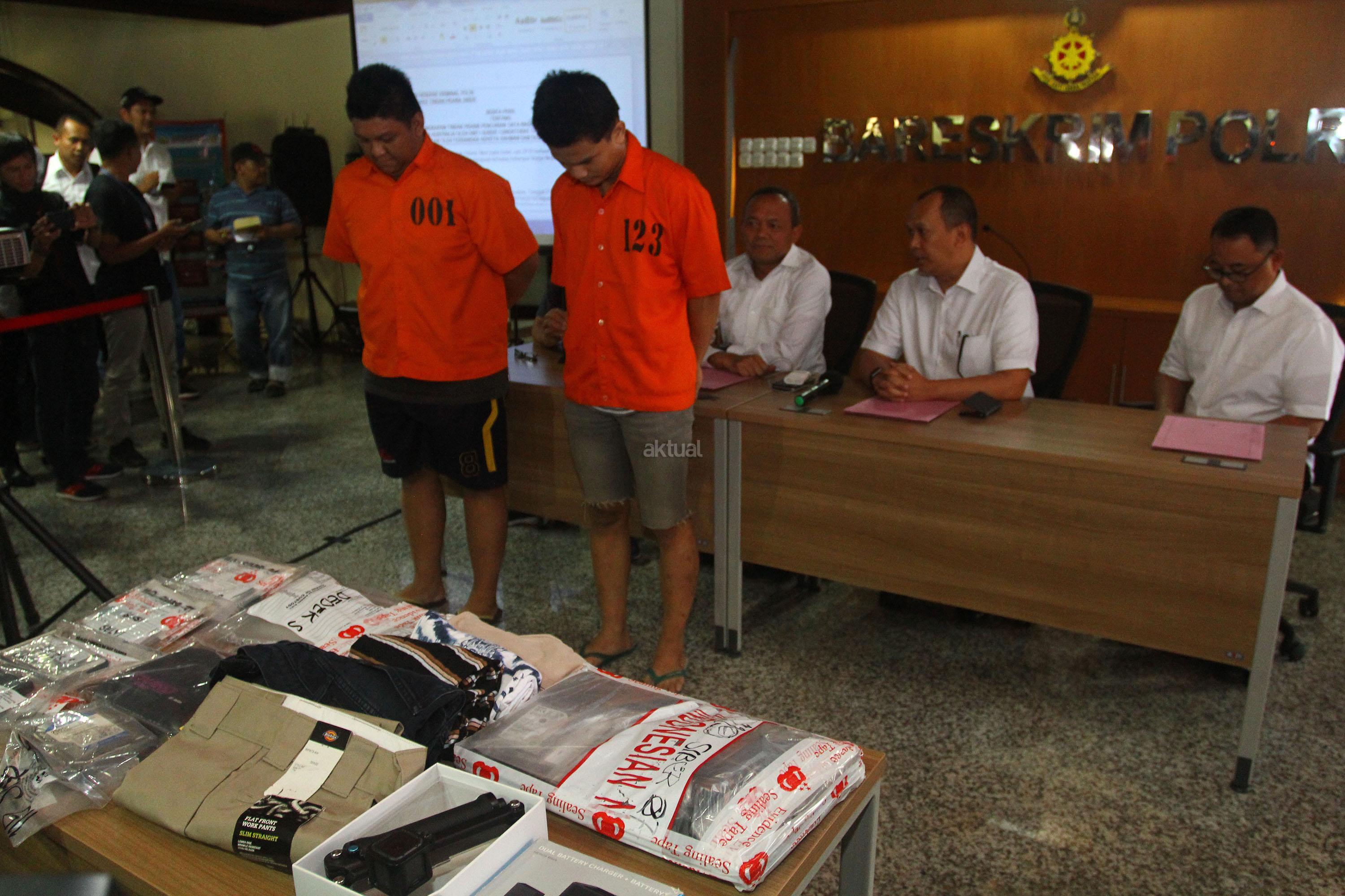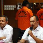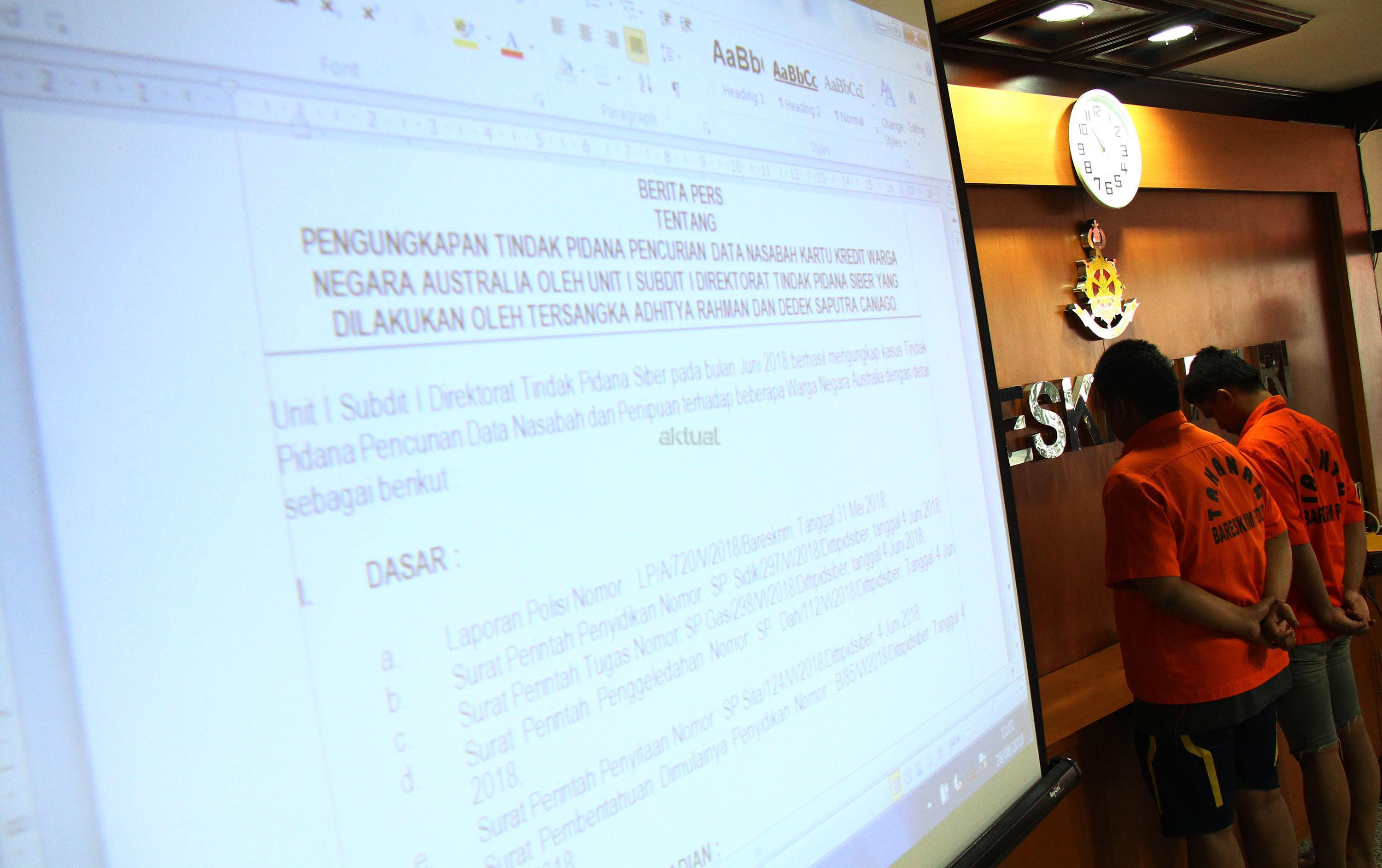 Kabareskrim Irjen Pol Areif Sulistyanto (kanan) dan Direktur Tindak Pidana Siber Bareskrim Polri Brigjen Pol Albertus Rachmad Wibowo (kedua kanan) menghadirkan tersangka dalam rilis pengungkapan tindak pidana pencurian data nasabah kartu kredit warga negara Australia, di Direktorat Tindak Pidana Siber Bareskrim Polri, Jakarta, Selasa (28/8/2018). Unit I Subdit Direktorat Tindak Pidana Siber Bareskrim Polri berhasil mengamankan dua tersangka terkait kasus tersebut dengan barang bukti diantaranya satu “action camera”, peralatan komputer dan buku tabungan beserta kartu ATM. AKTUAL/Tino Oktaviano