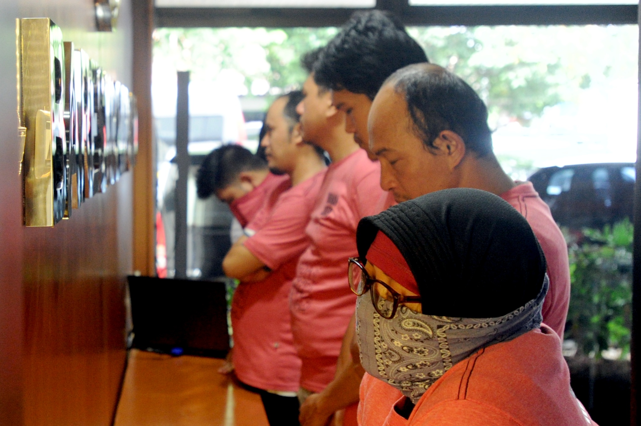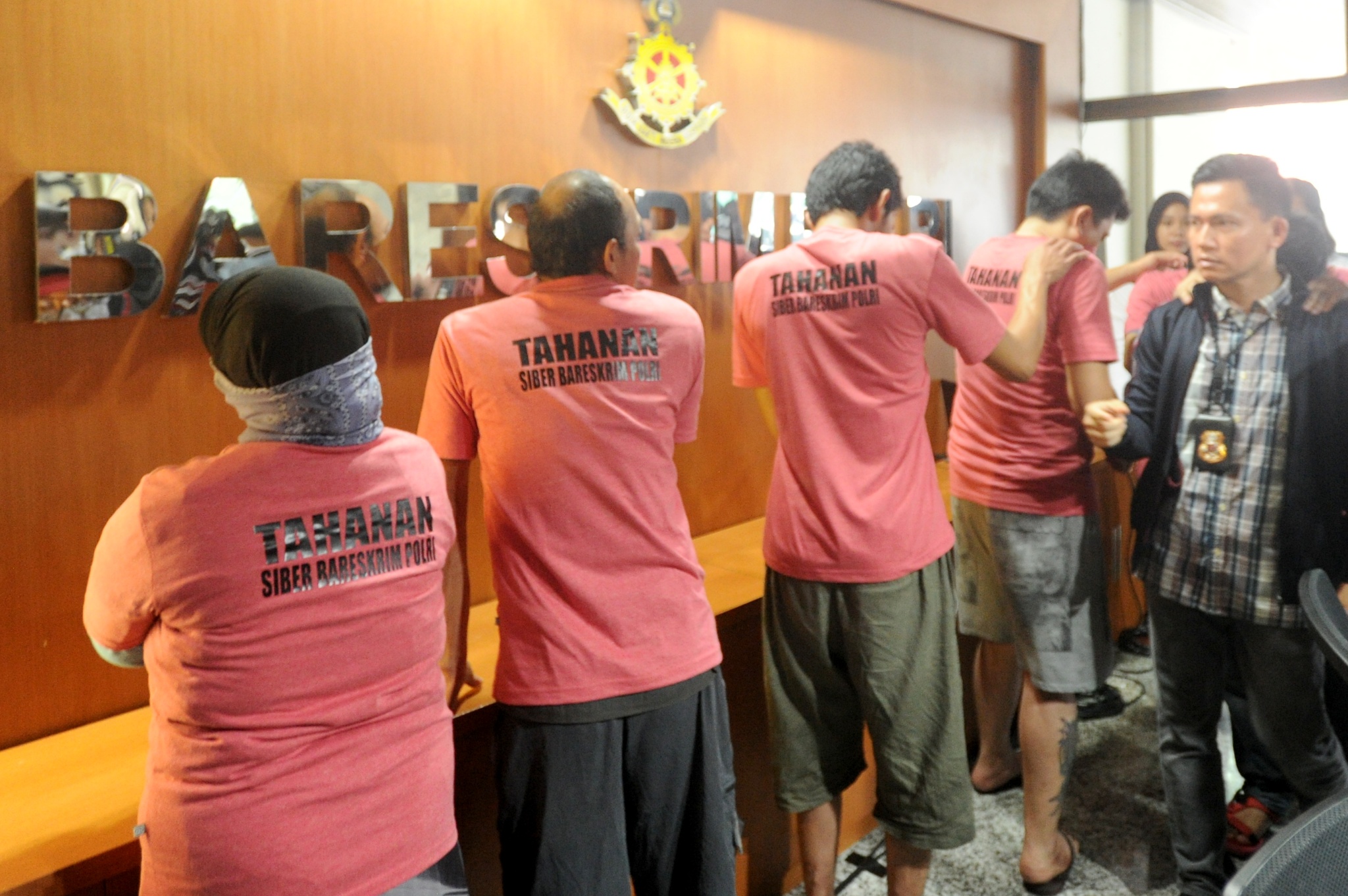 Ekspresi tertunduk enam anggota The Family Muslim Cyber Army yang menyebarkan ujaran kebencian saat rilis di Direktorat Tindak Pidana Siber Bareskrim Polri, Jakarta, Rabu (28/2). AKTUAL/Tino Oktaviano