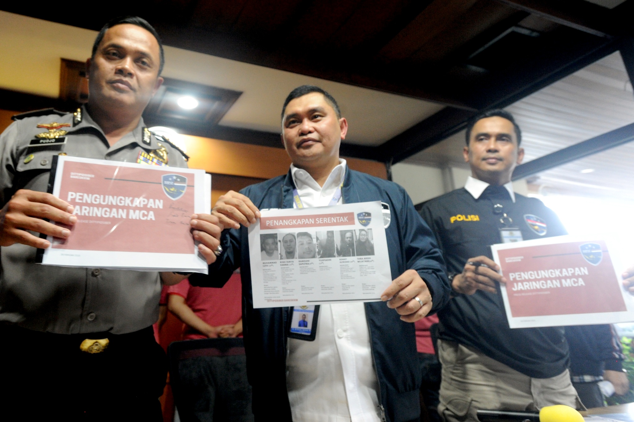 Polisi menunjukkan bukti dan foto keenam anggota The Family Muslim Cyber Army yang menyebarkan ujaran kebencian saat rilis di Direktorat Tindak Pidana Siber Bareskrim Polri, Jakarta, Rabu (28/2). AKTUAL/Tino Oktaviano
