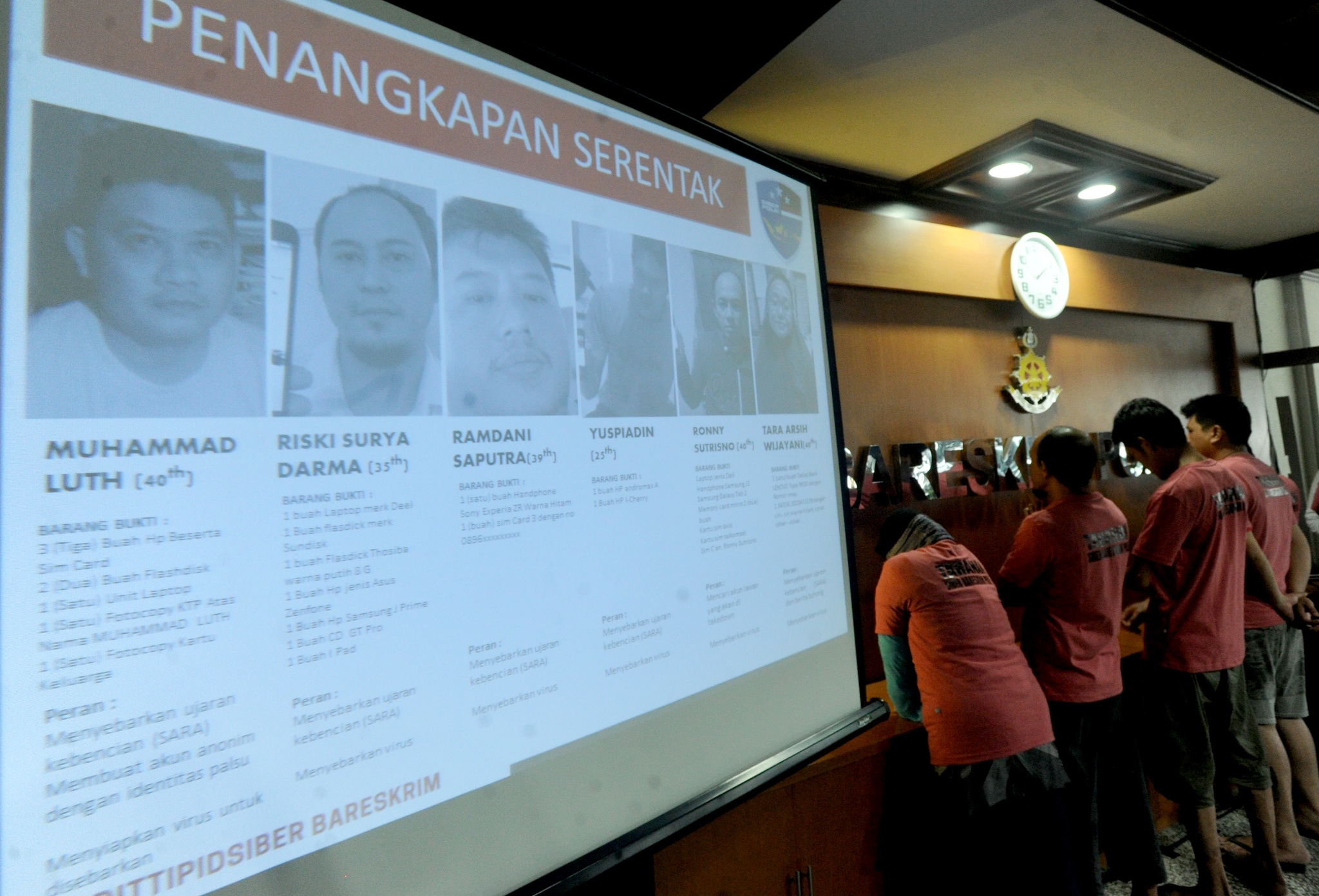 Petugas menunjukkan wajah keenam anggota The Family Muslim Cyber Army yang menyebarkan ujaran kebencian saat rilis di Direktorat Tindak Pidana Siber Bareskrim Polri, Jakarta, Rabu (28/2/18). Dari 6 tersangka yang ditangkap, 1 di antaranya adalah wanita. AKTUAL/Tino Oktaviano
