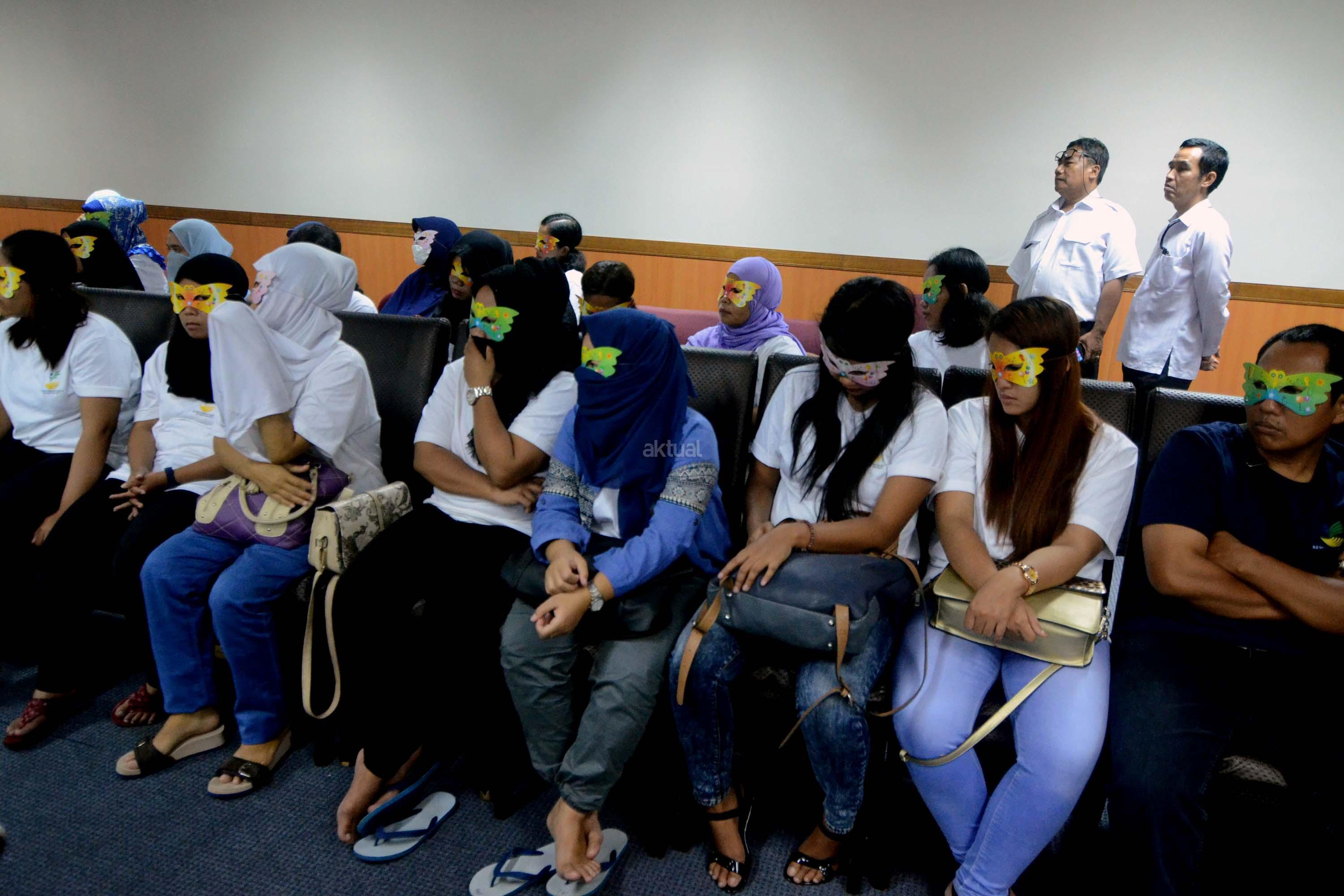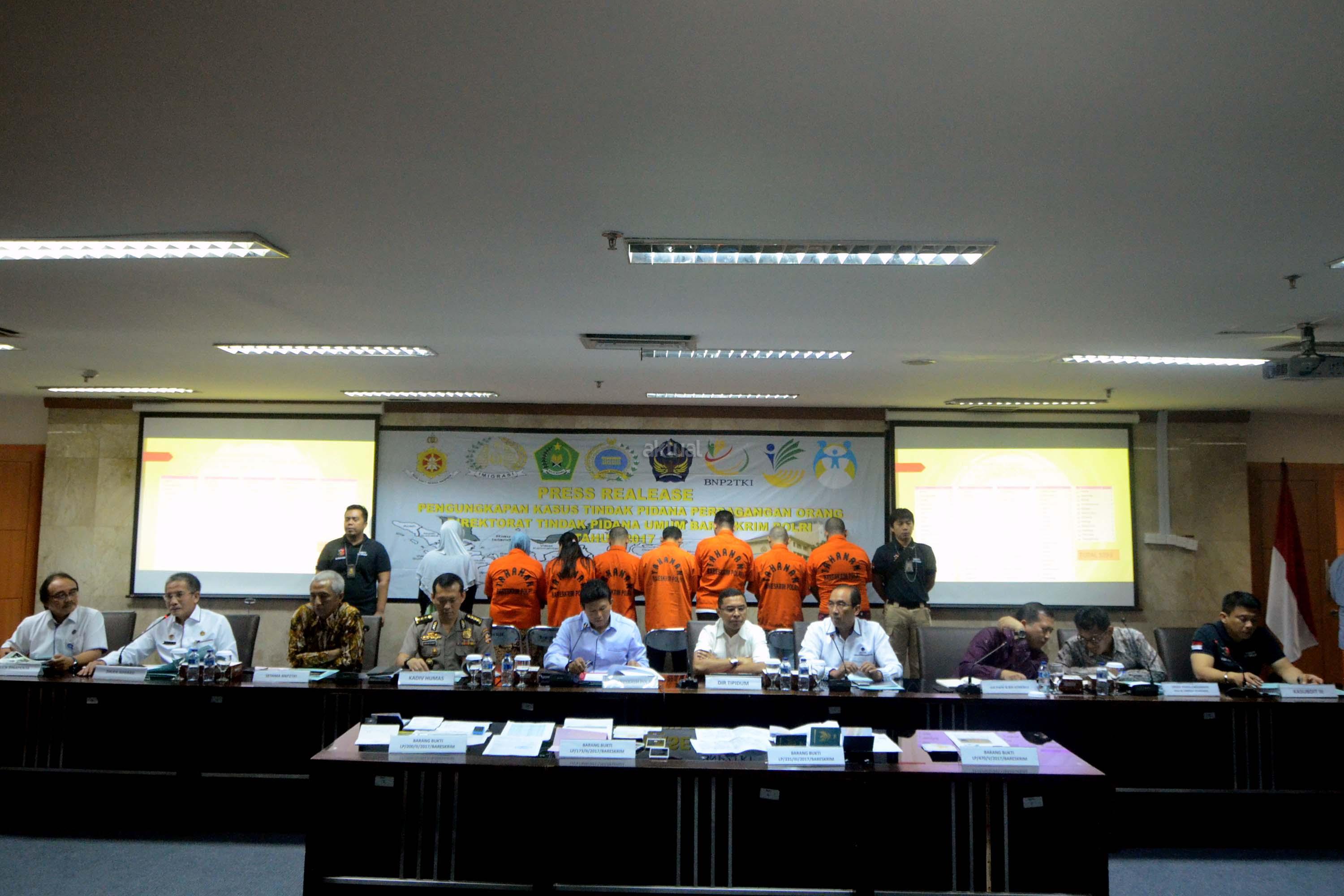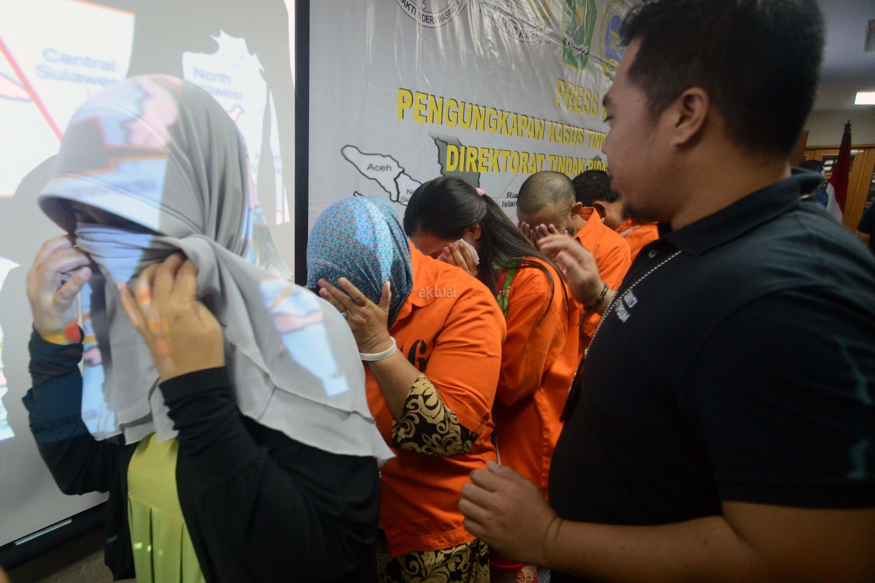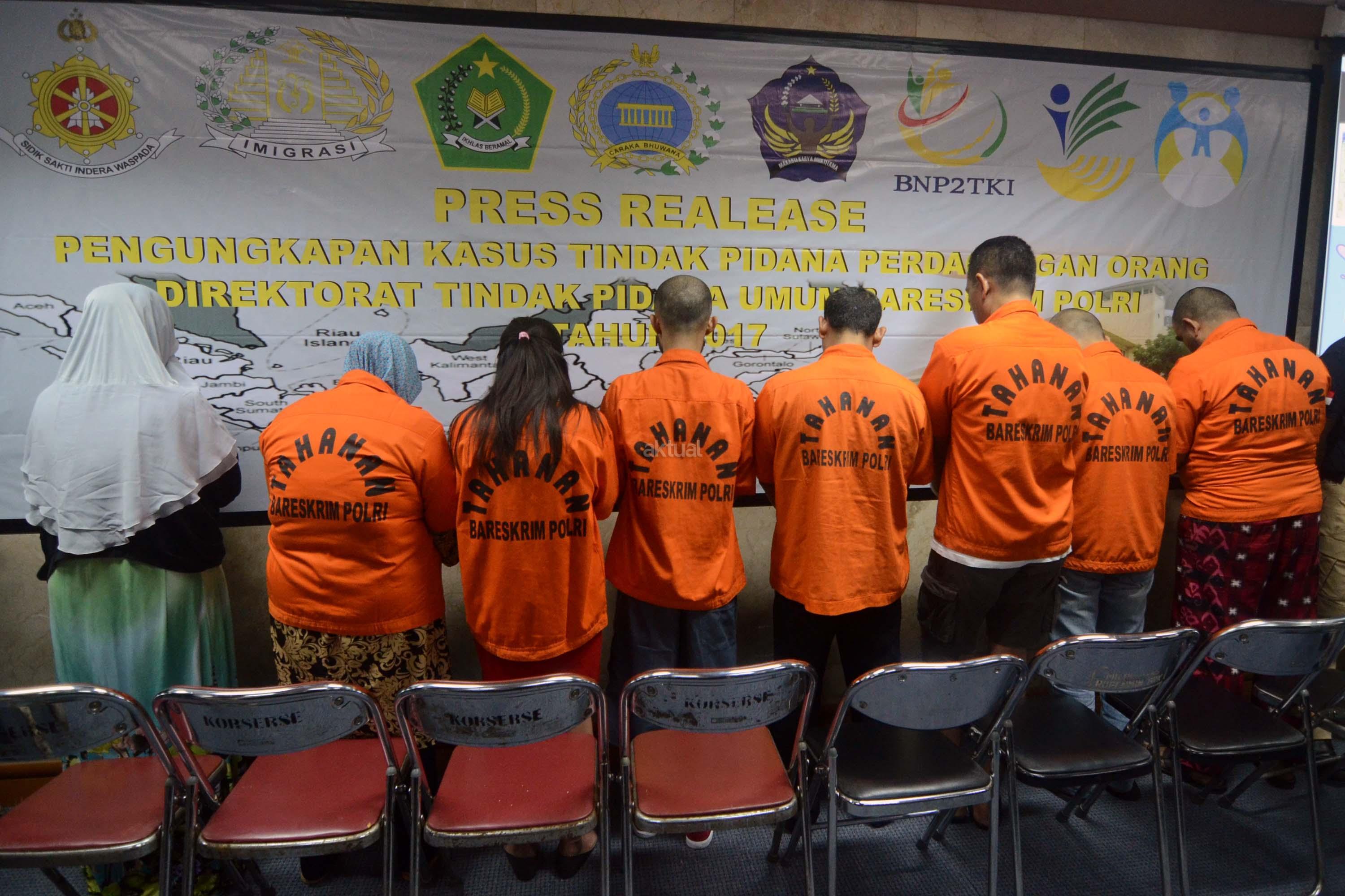 Sejumlah korban dihadirkan saat konferensi pers mengenai pengungkapan kasus tindak pidana perdagangan orang di Bareskrim Polri, Jakarta, Rabu (17/5/2017). Kepolisian menangkap 10 tersangka kasus tindak pidana perdagangan orang dengan jumlah korban yang berhasil diselamatkan sebanyak 80 orang, serta barang bukti yang berhasil diamankan terdiri dari 11 unit hp, 17 paspor, lima buku rekening berikut ATM, dan tiket pesawat. AKTUAL/Munzir