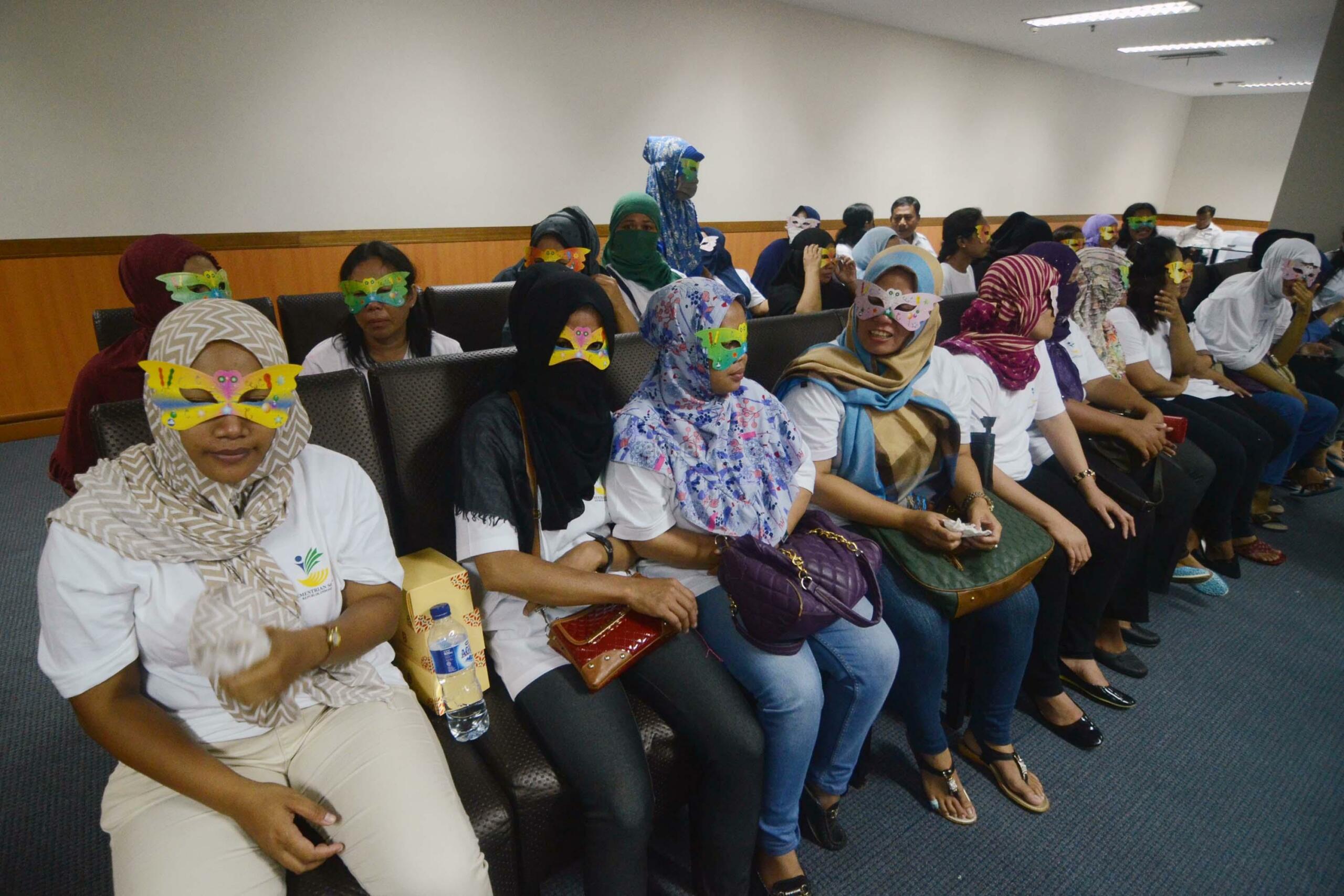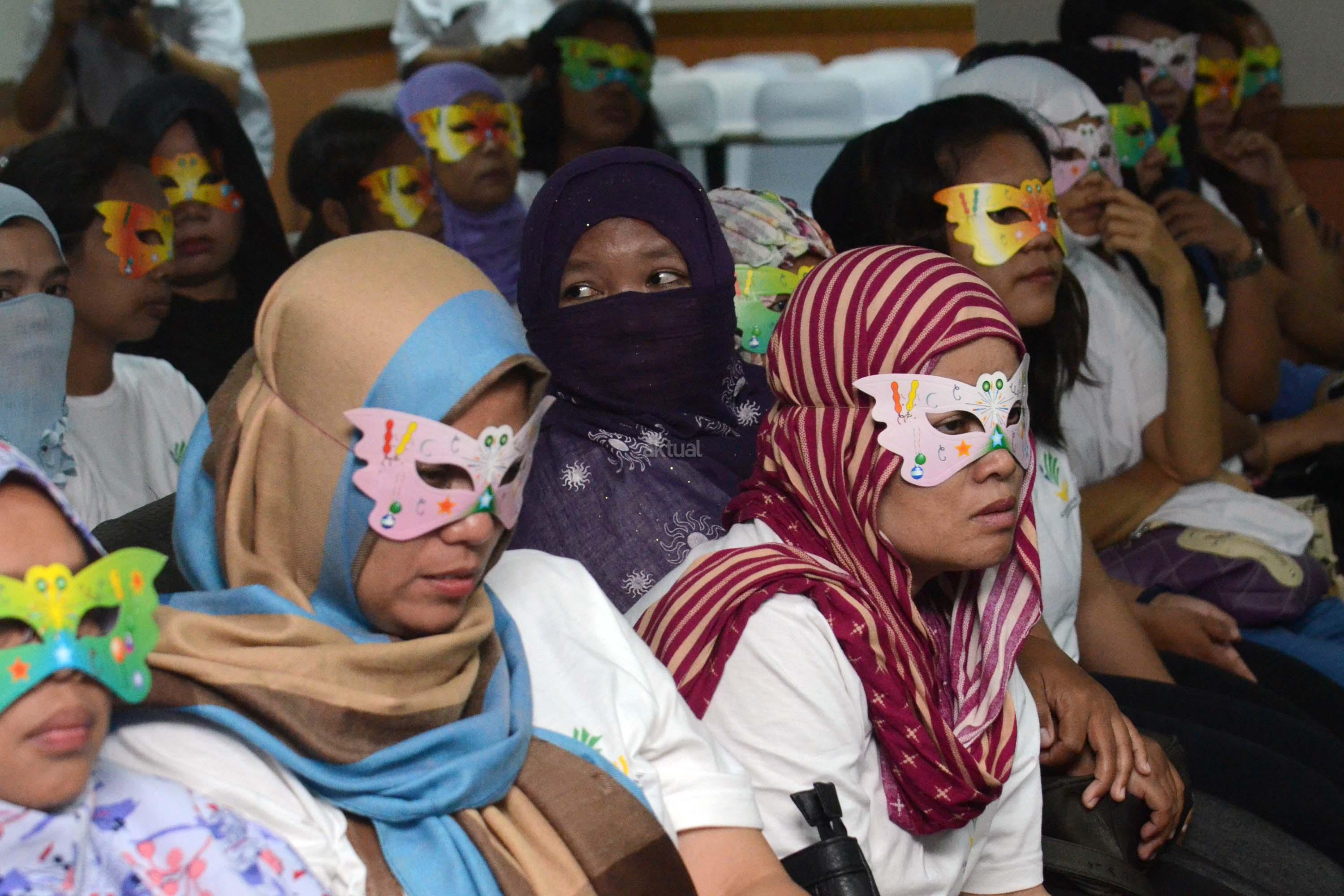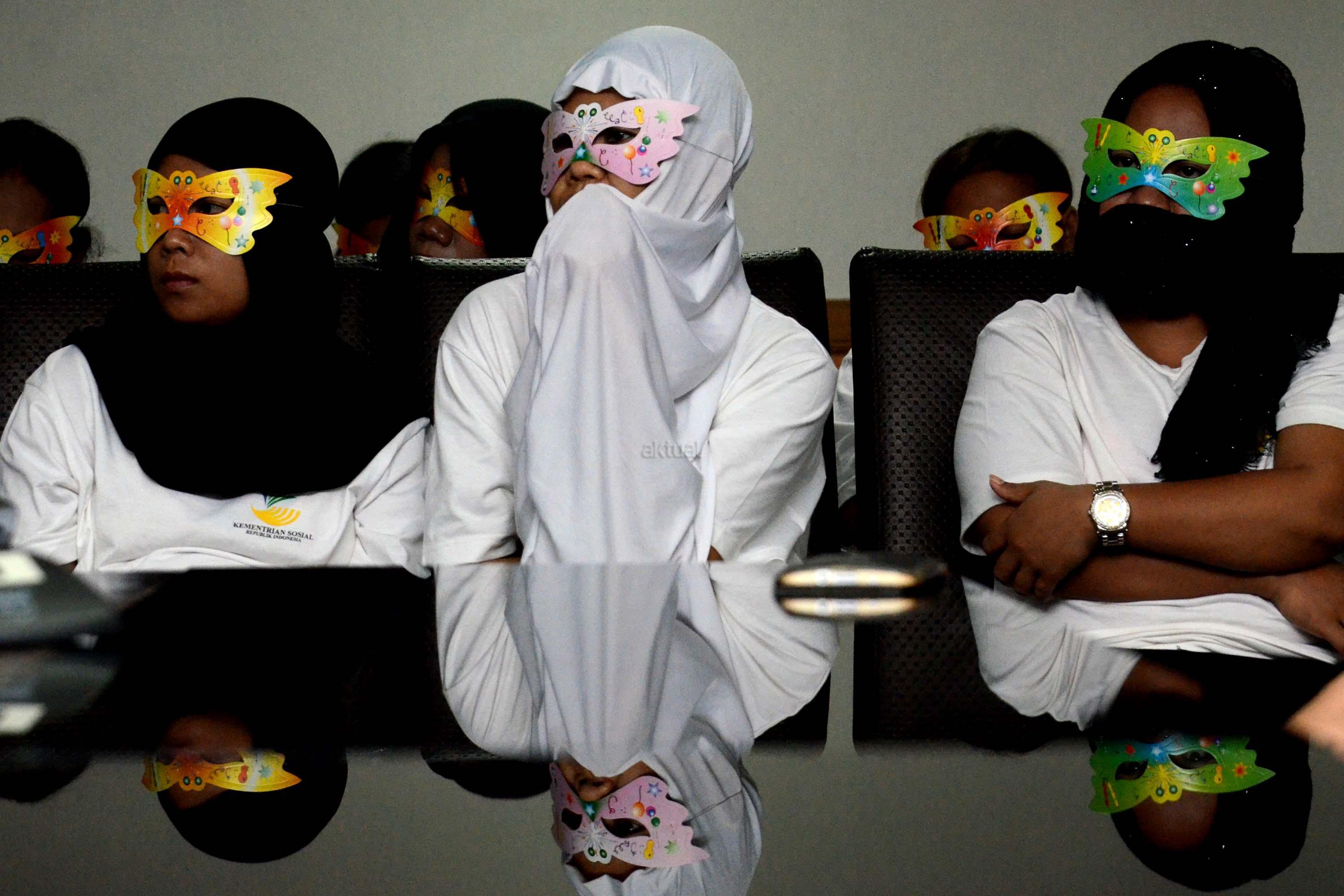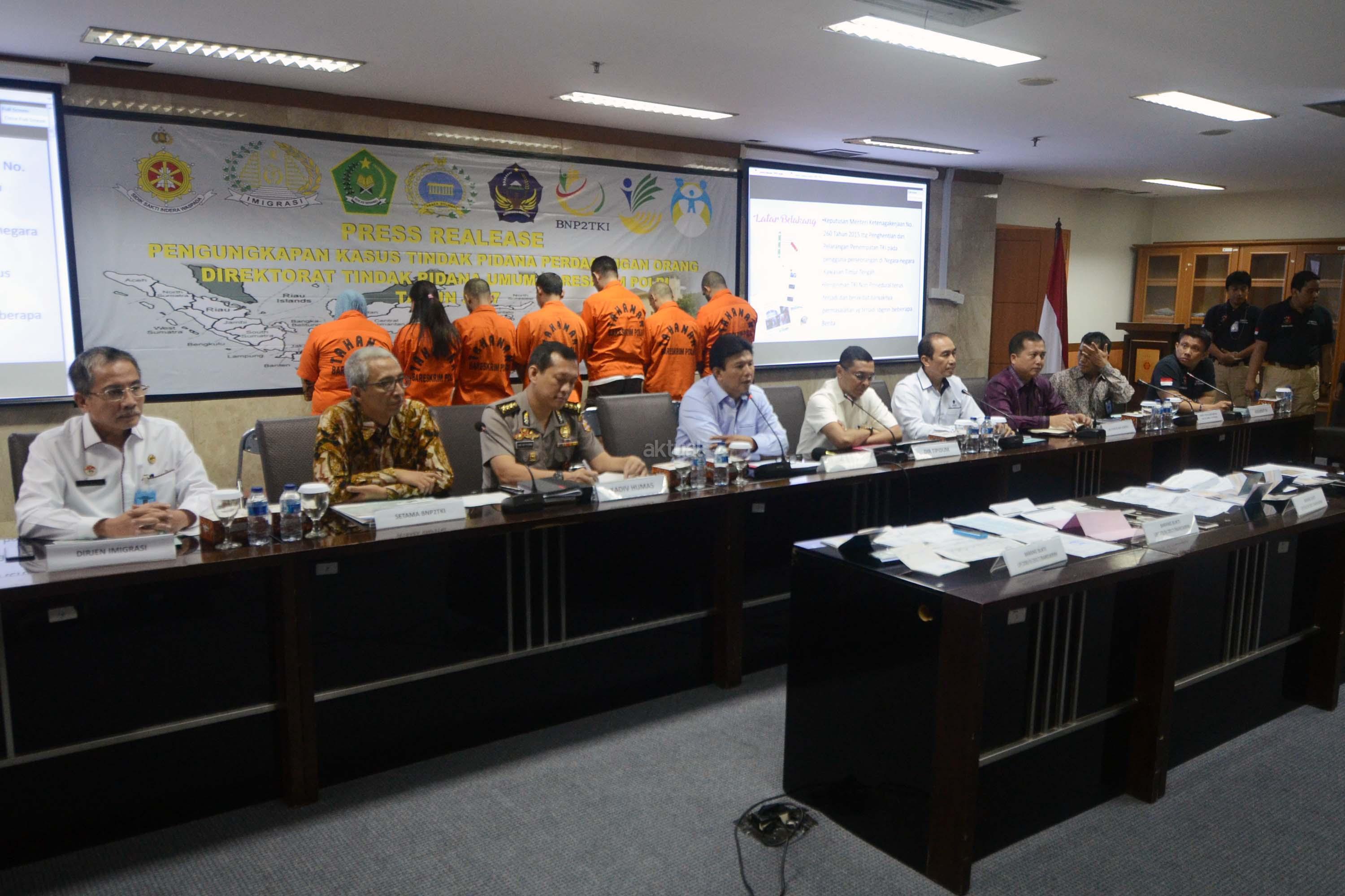 Sejumlah korban dihadirkan saat konferensi pers mengenai pengungkapan kasus tindak pidana perdagangan orang di Bareskrim Polri, Jakarta, Rabu (17/5/2017). Kepolisian menangkap 10 tersangka kasus tindak pidana perdagangan orang dengan jumlah korban yang berhasil diselamatkan sebanyak 80 orang, serta barang bukti yang berhasil diamankan terdiri dari 11 unit hp, 17 paspor, lima buku rekening berikut ATM, dan tiket pesawat. AKTUAL/Munzir
