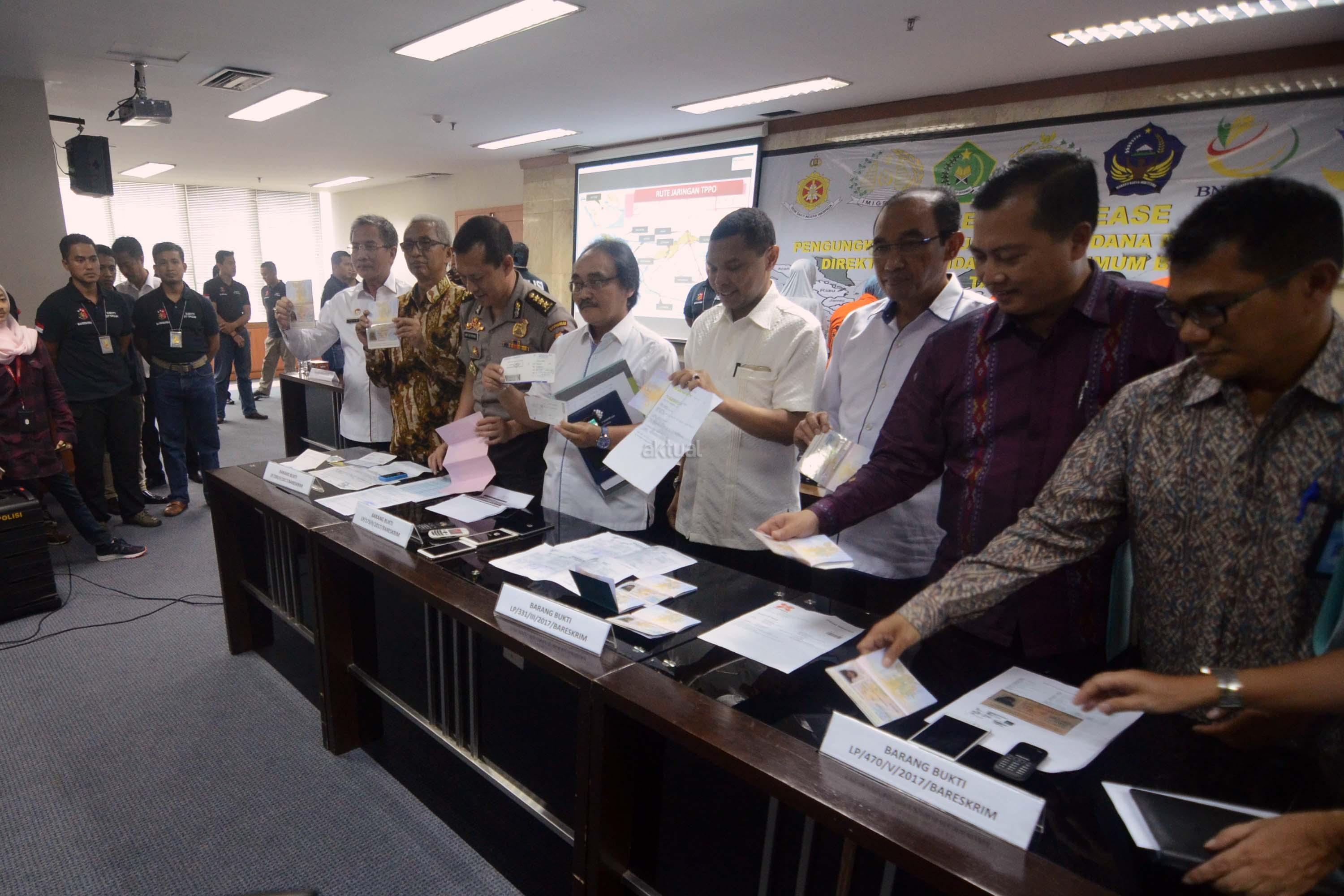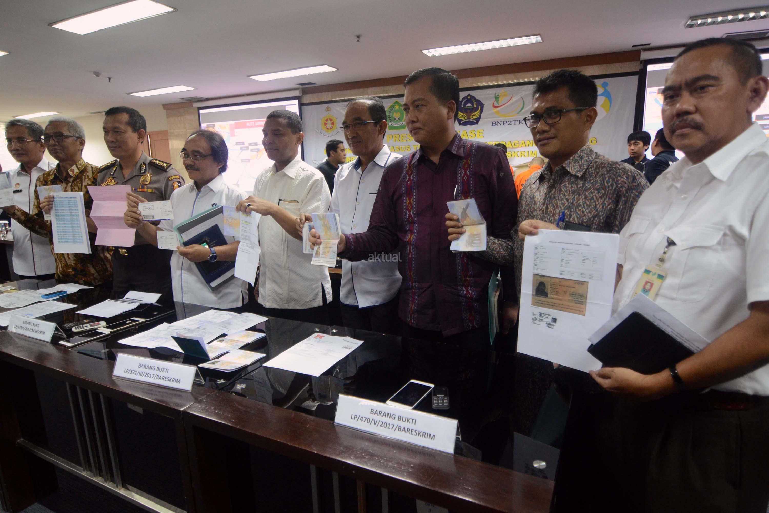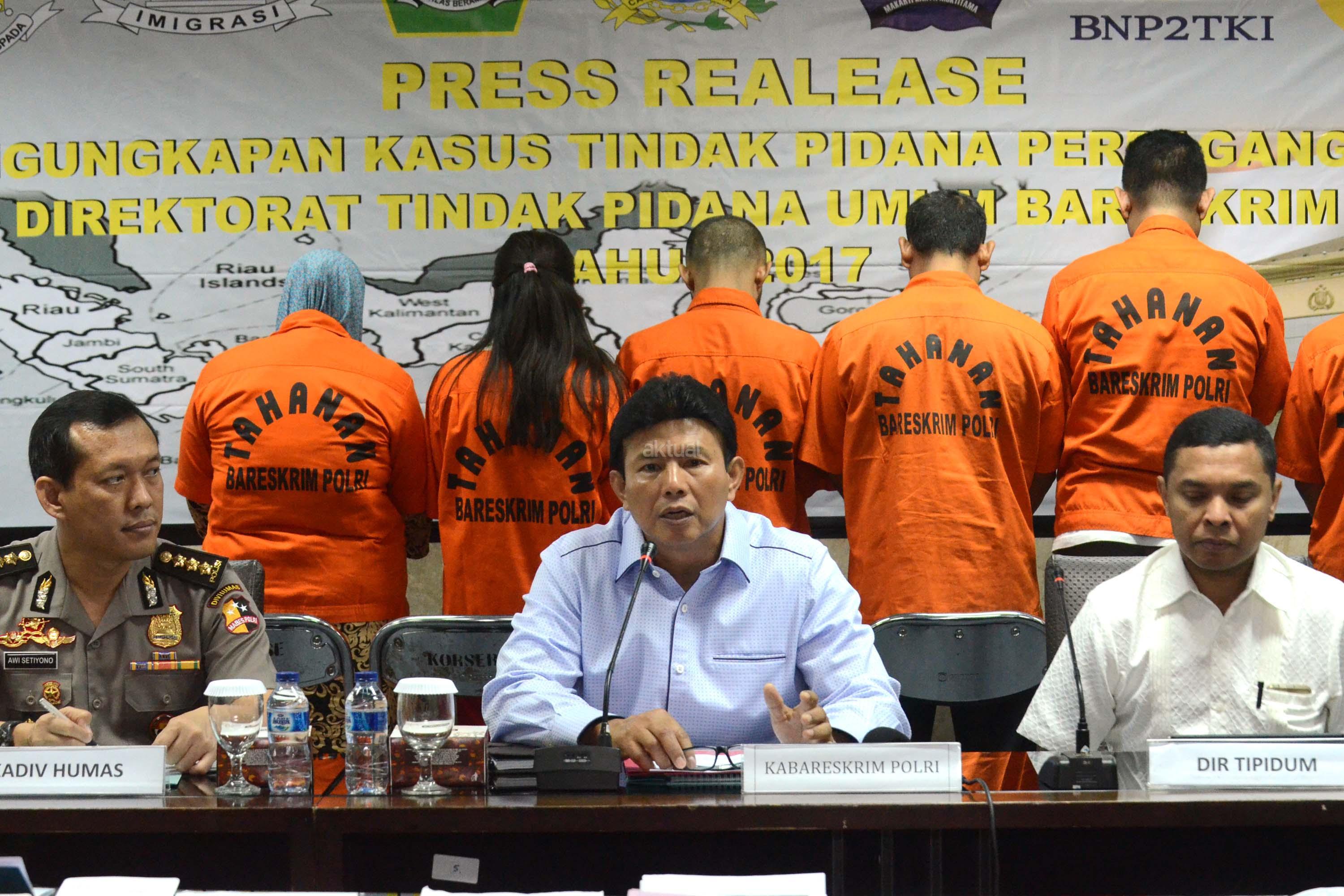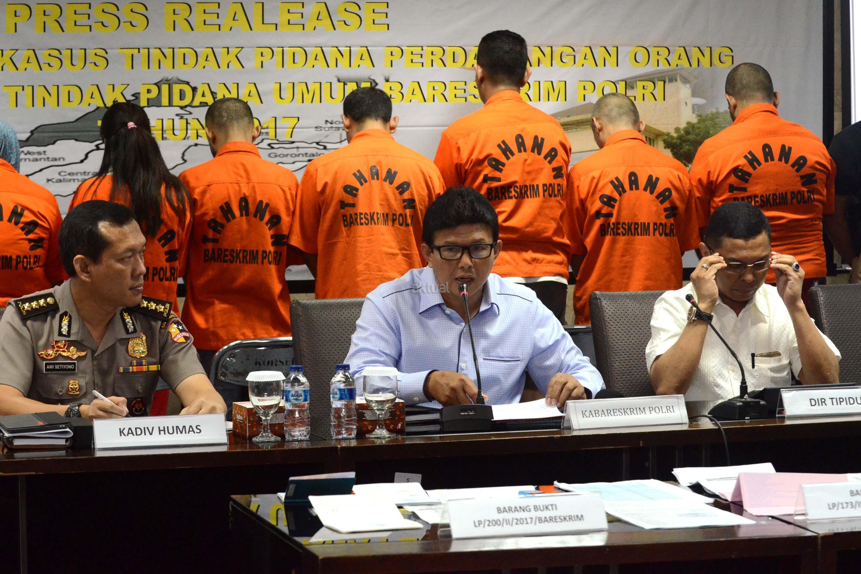 Kabareskrim Polri Komjen Pol Ari Dono Sukmanto (tengah) didampingi Kabag Mitra Biro Penmas Divisi Humas Polri Kombes Pol Awi Setiyono (kiri) saat jumpa pers terkait pengungkapan kasus perdagangan orang, Jakarta, Rabu (17/5/2017). Kepolisian menangkap 10 tersangka kasus tindak pidana perdagangan orang dengan jumlah korban yang berhasil diselamatkan sebanyak 80 orang, serta barang bukti yang berhasil diamankan terdiri dari 11 unit hp, 17 paspor, lima buku rekening berikut ATM, dan tiket pesawat. AKTUAL/Munzir