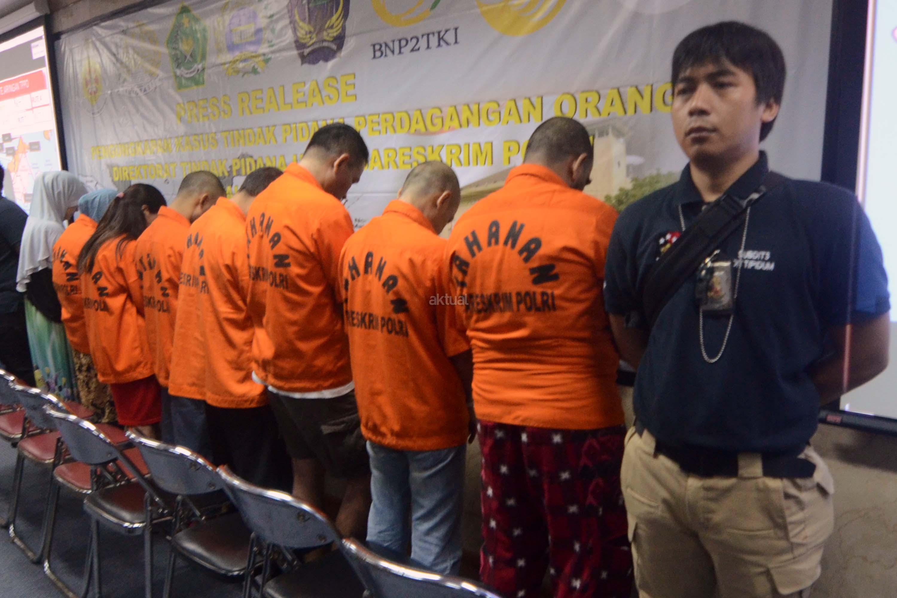 Kepolisian menangkap 10 tersangka kasus tindak pidana perdagangan orang dengan jumlah korban yang berhasil diselamatkan sebanyak 80 orang, serta barang bukti yang berhasil diamankan terdiri dari 11 unit hp, 17 paspor, lima buku rekening berikut ATM, dan tiket pesawat. AKTUAL/Munzir