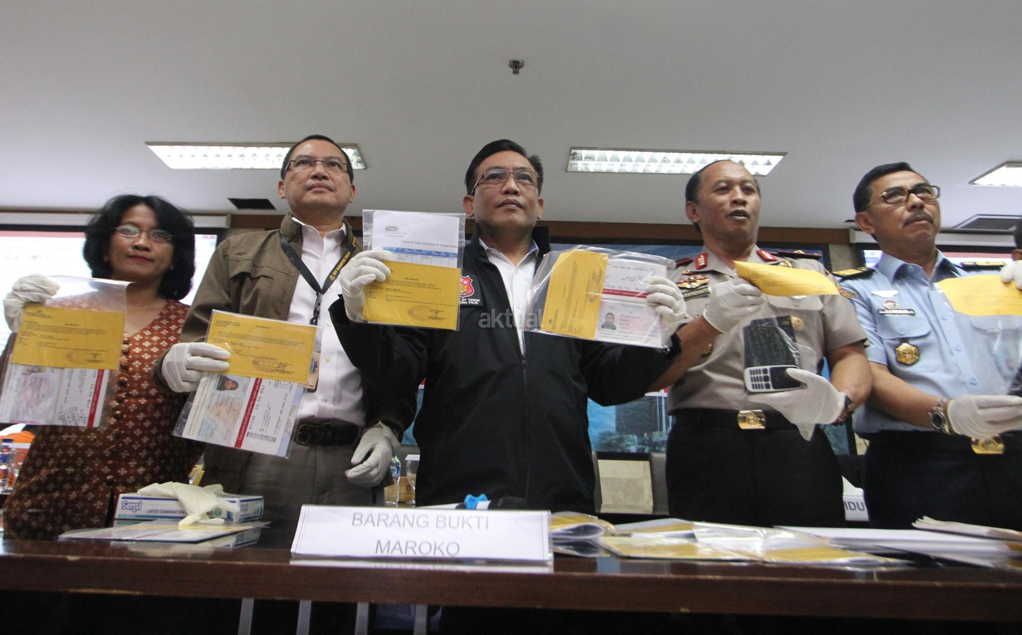 Petugas kepolisian menunjukan barang bukti saat rilis pengungkapan tindak pidana perdagangan orang di Bareskrim Polri, Jakarta, Kamis (13/9). Bareskrim Polri berhasil melakukan pengungkapan perdagangan orang jaringan Malaysia dengan modus penempatan Pekerja Migran Indonesia dan mengamankan delapan orang tersangka beserta sejumlah barang bukti yang digunakan untuk menjalankan aksinya. AKTUAL/Tino Oktaviano
