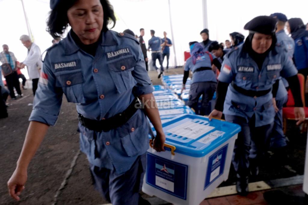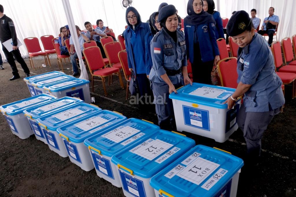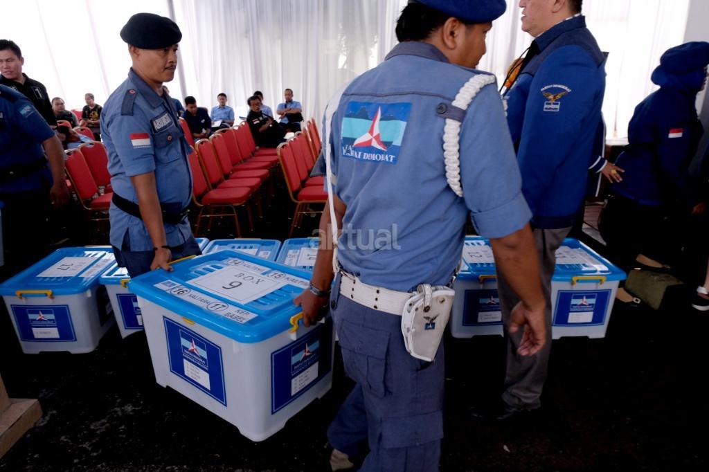Sejumlah kotak berisi berkas yang dibawa Partai Demokrat saat mendaftarkan diri ke Komisi Pemilihan Umum (KPU) Jakarta, Senin (16/10). Partai Demokrat membawa 17 kotak berisi dokumen sebagai syarat pendaftaran. AKTUAL/Tino Oktaviano