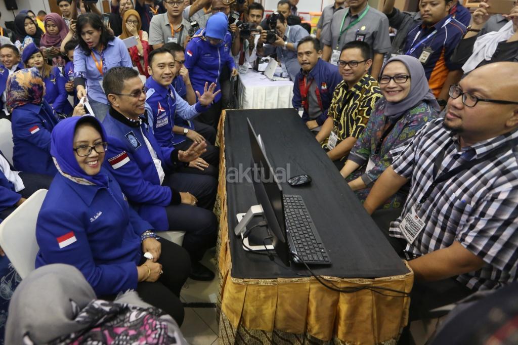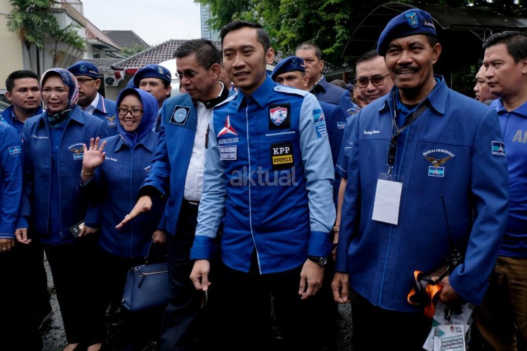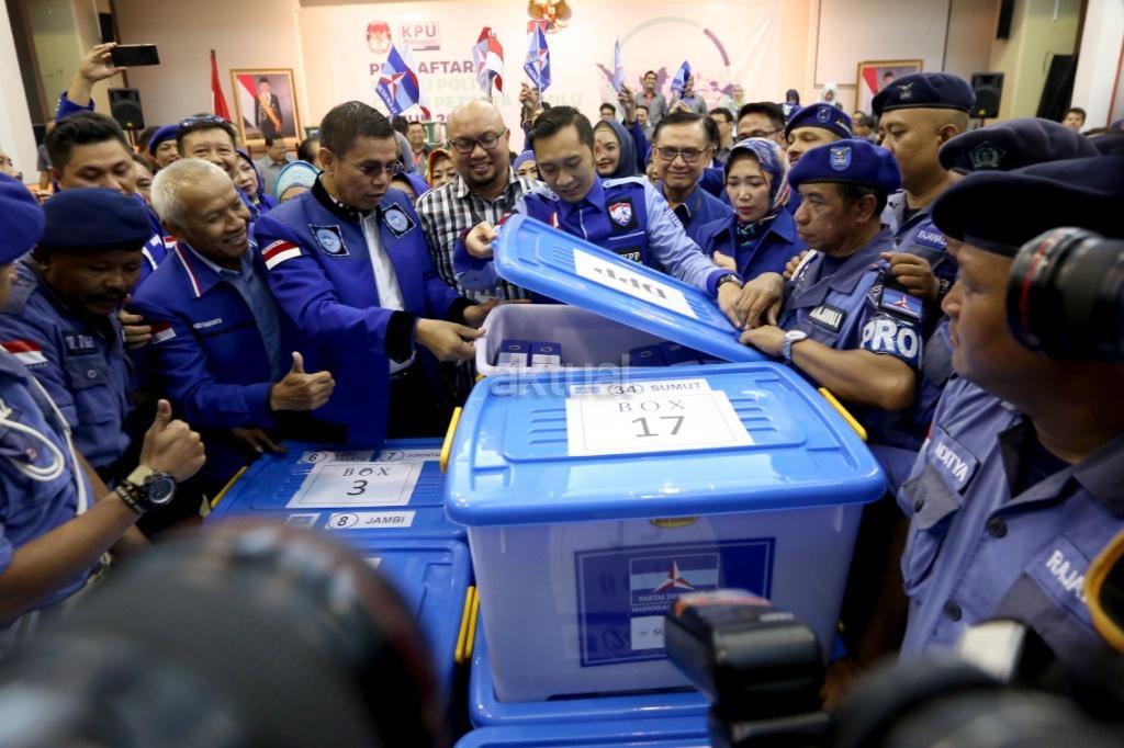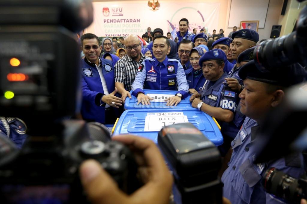 Partai Demokrat yang diwakili oleh Sekjen Hinca Panjaitan dan Badan Pemenangan Pemilu Partai Demokrat Ibas Edhie Baskoro Yudhoyono mendaftarkan partainya ke Komisi Pemilihan Umum (KPU) Jakarta, Senin (16/10). AKTUAL/Tino Oktaviano
