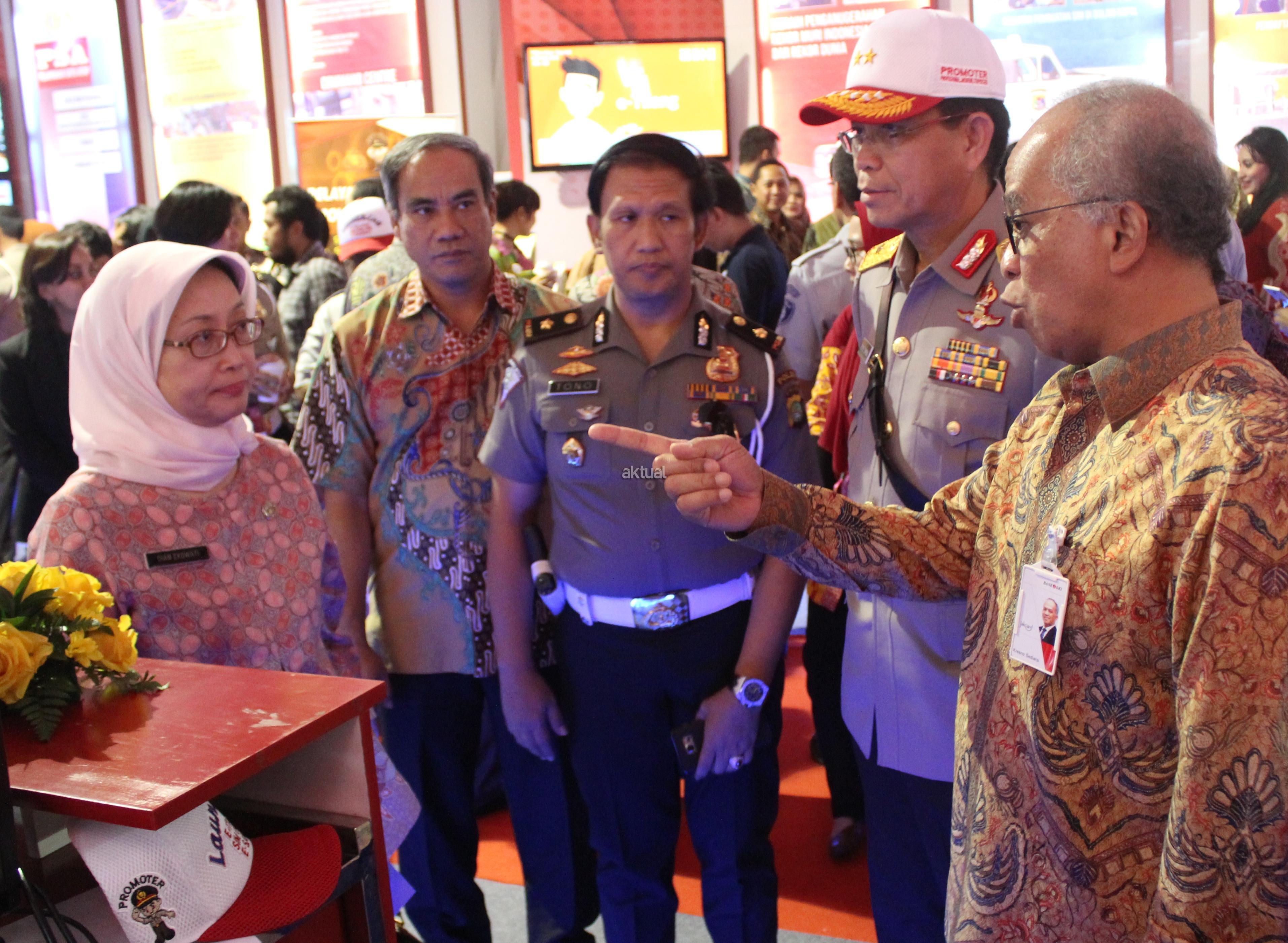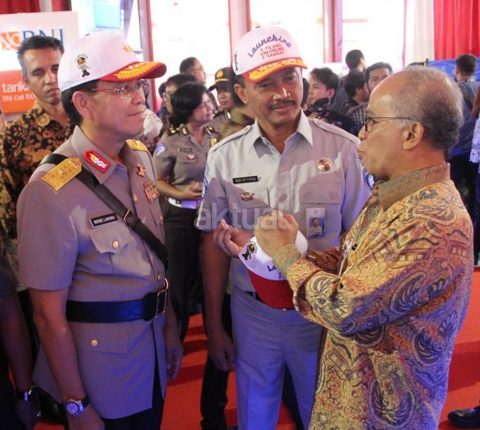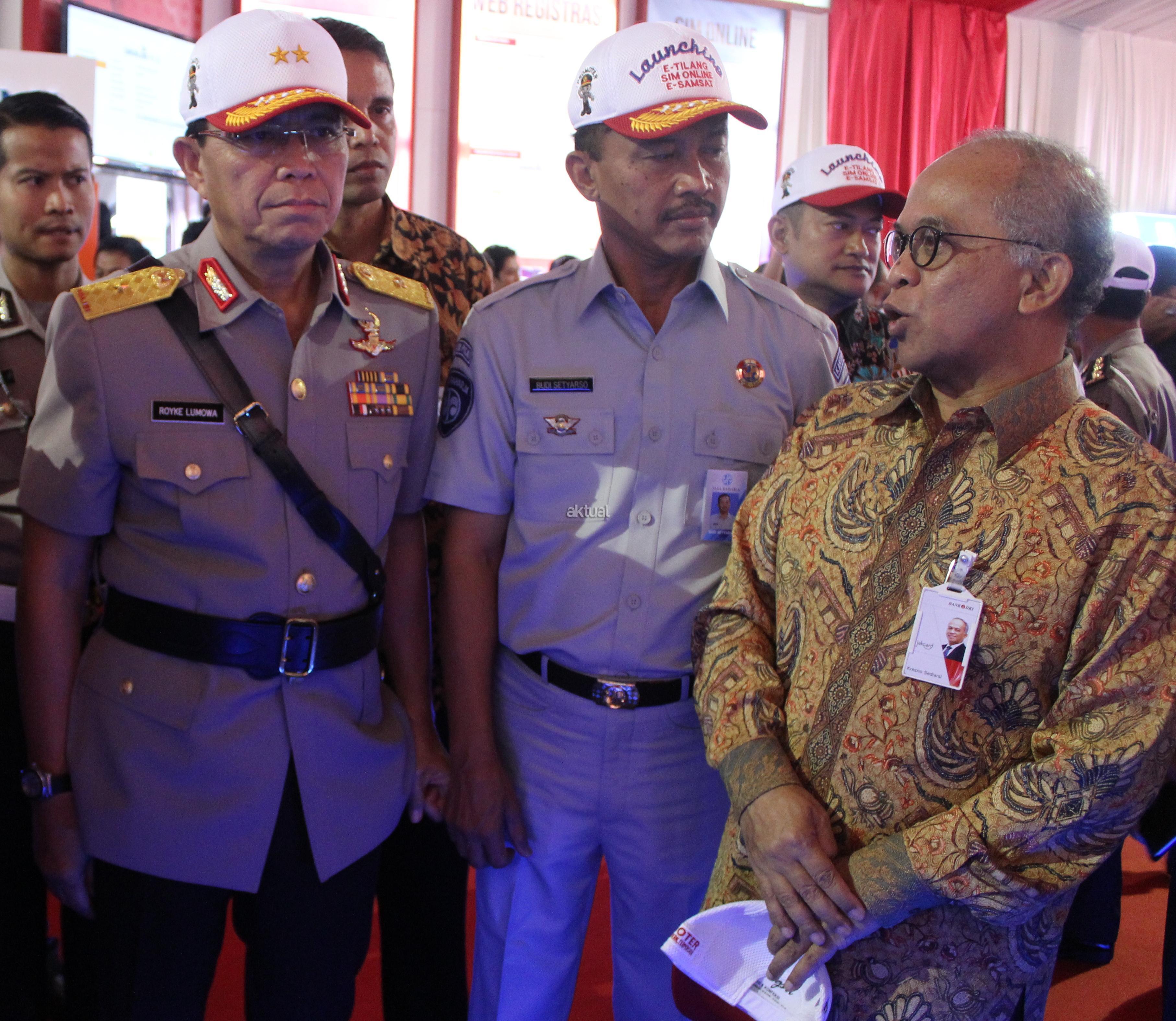 Direktur Utama Bank DKI, Kresno Sediarsi (kanan) berbincang dengan Kakorlantas Polri Royke Lumowa (kiri) dan Direktur Utama Jasa Raharja Budi Setyarso usai peresmian E-Samsat di Jakarta, Jumat (16/12). E-Samsat merupakan layanan penerimaan pembayaran Pajak Kendaraan Bermotor (PKB), Bea Balik Nama Kendaraan Bermotor (BBNKB), dan pembayaran Sumbangan Wajib Dana Kecelakaan Lalu Lintas Jalan (SWDKLLJ) yang dapat dilakukan melalui e-channel Bank DKI seperti ATM Bank DKI. AKTUAL/Eko S Hilman