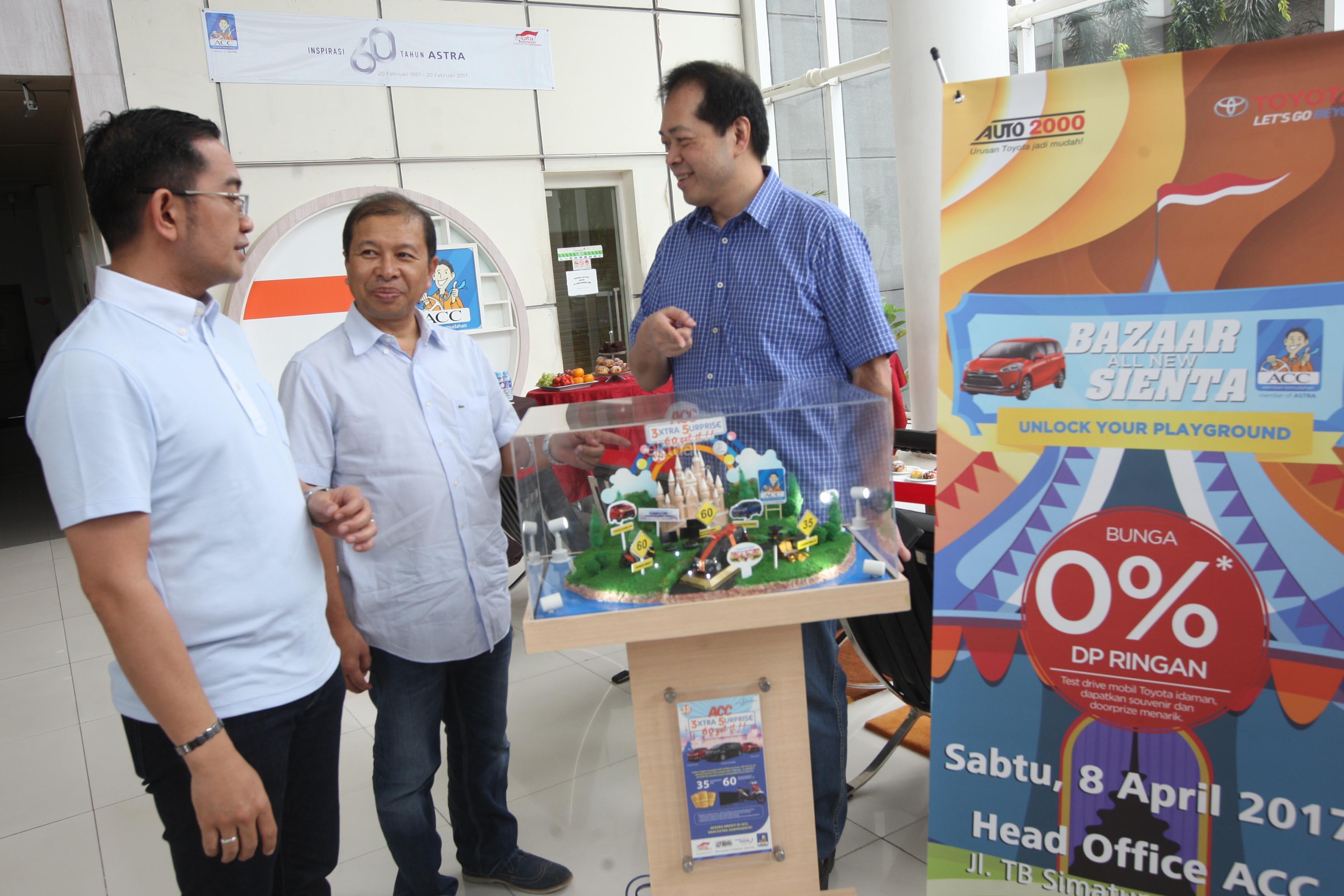 Chief Executive Officer ACC Jodjana Jody (kanan) berbincang dengan Deputy Chief Sales Officer ACC Ezar Kumendong (kiri) dan Operation Manager Mobil88 Arsya pada acara Bazaar Sienta di Kantor Pusat Astra Credit Companies di Jakarta, Sabtu (8/4/2017). Auto 2000 kembali digandeng pada bazaar kali ketiga ini. Selain paket bunga nol persen untuk tenor satu hingga dua tahun tadi, ACC juga memberikan paket kredit VIP ACCess dan juga trade in mobil Toyota Sienta. Bagi yang disetujui kreditnya pada bazaar tersebut, akan mendapatkan kesempatan ikut program undian ACC 3Xtra Suprise yang berhadiah utama satu buah mobil Toyota Alphard. AKTUAL/Eko S Hilman
