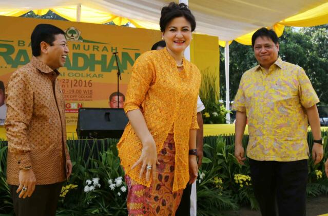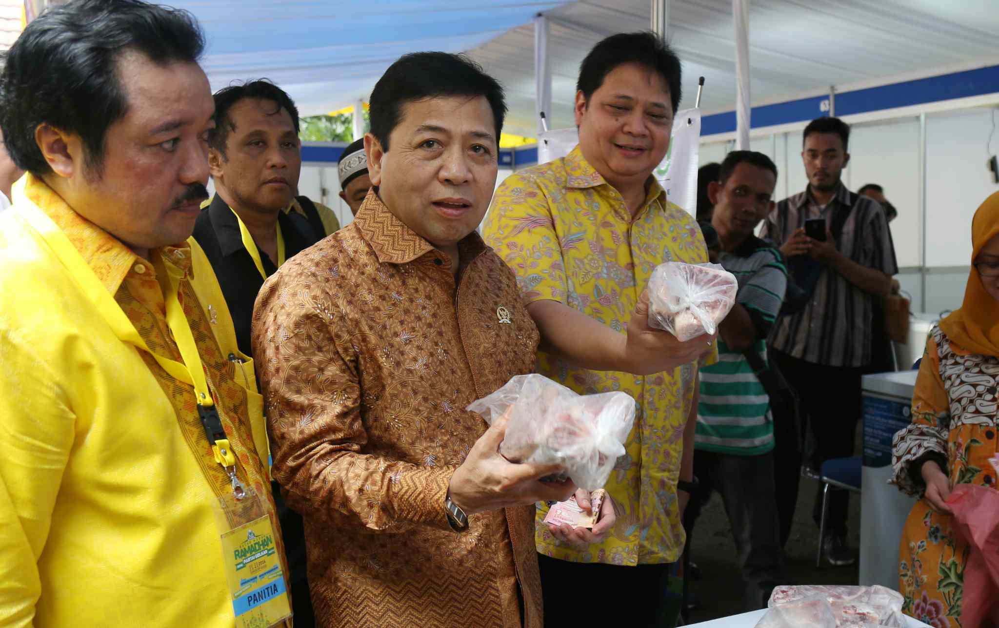 Ketua Umum Partai Golkar Setya Novanto (kiri) mendampingi Ketua Ikatan istri DPP Partai Golkar Deistri Setya Novanto (kedua kiri), Ketua Koordinator Perekonomian DPP Golkar Airlangga Hartato (kedua kanan) dan Ketua Bidang Koperasi Wirausaha dan UKM, Idris Laena (kanan) membuka bazar dan pasar murah yang digelar di kantor DPP Partai Golkar di jalan Anggrek Neli Murni, Slipi, Jakarta Barat, Rabu (22/6). Bazar dan pasar murah Ramadan Partai Golkar yang digelar selama 2 hari tersebut dilakukan sebagai bentuk keberpihakan terhadap para pelaku usaha kecil menengah (UKM). Selain itu juga sebagai upaya mencukupi kebutuhan pokok masyarakat menjelang hari Raya Idul Fitri. AKTUAL/TINO OKTAVIANO