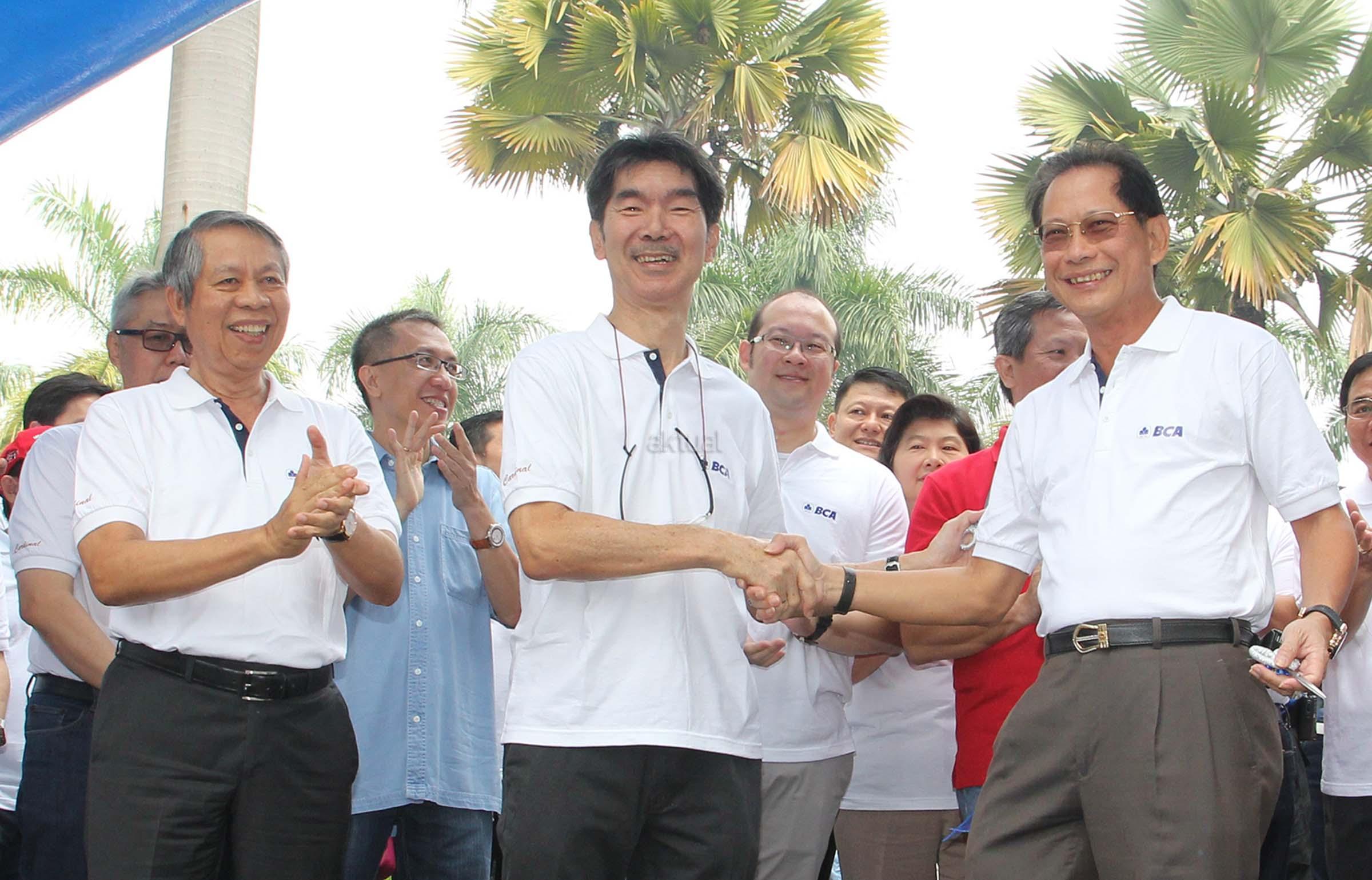 Presiden Direktur PT Bank Central Asia Tbk, Jahja Setiaatmadja ( kanan) berjabat tangan dengn Direktur Utama KBP, Sanusi Tanawi (tengah)seusai melakukan penguntingan pita sebagai simbolis dibukanya BCA Expo dan Autoshow 2016 di Bale Pare,Kota Baru Parahyangan (KBP),Bandung , Sabtu (22/10) disaksikan oleh Direktur BCA, Suwignyo Budiman ( kiri) ,Manajemen BCA dan perusahaan anak serta manajemen KBP. BCA Expo dan Autoshow yang digelar selama dua hari ,yakni tanggal 22 dan 23 Oktober 2016 ini bertujuan untuk memberikan kemudahan bagi nasabah memiliki kendaraan dan hunian idaman masa kini.