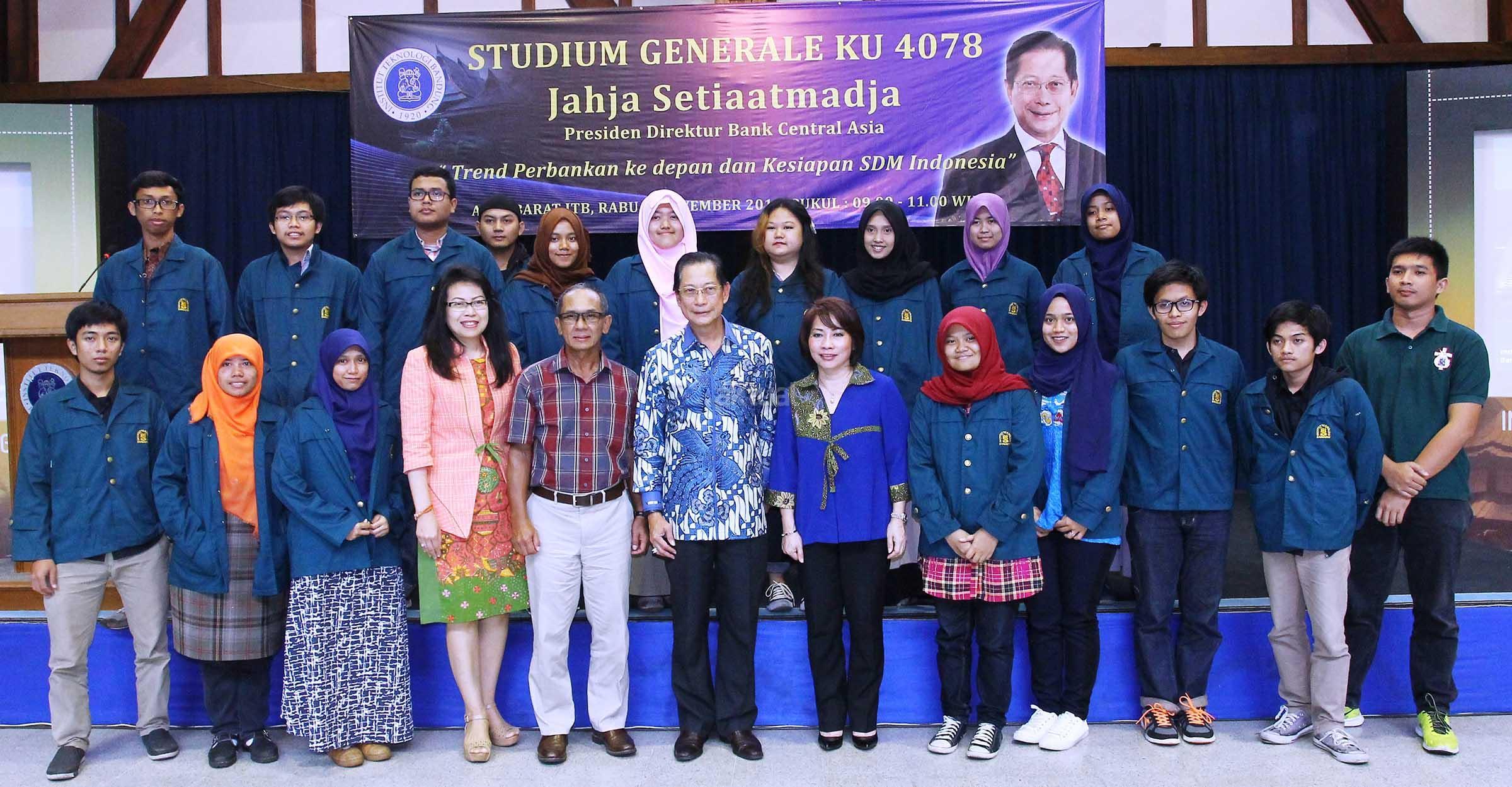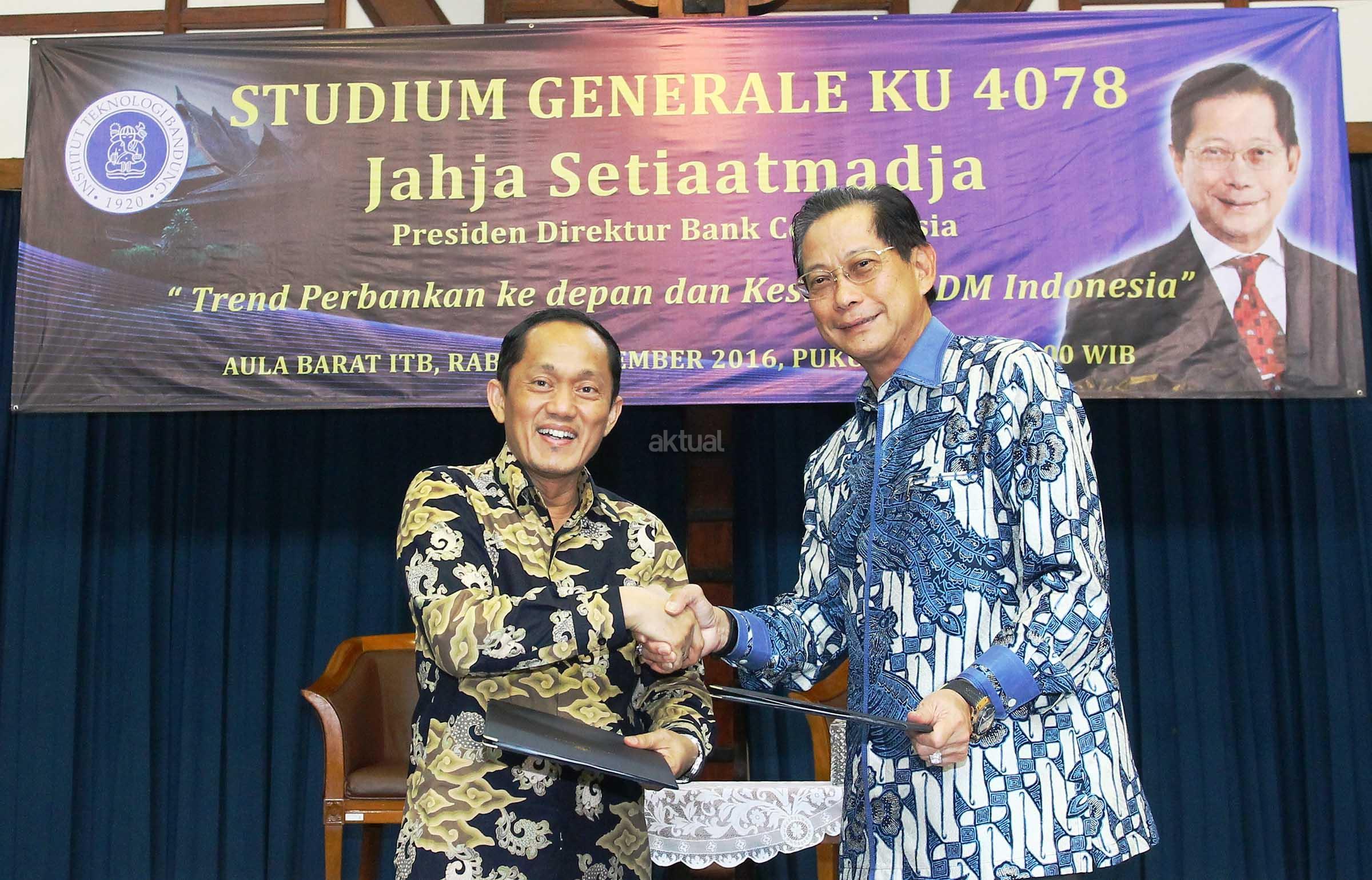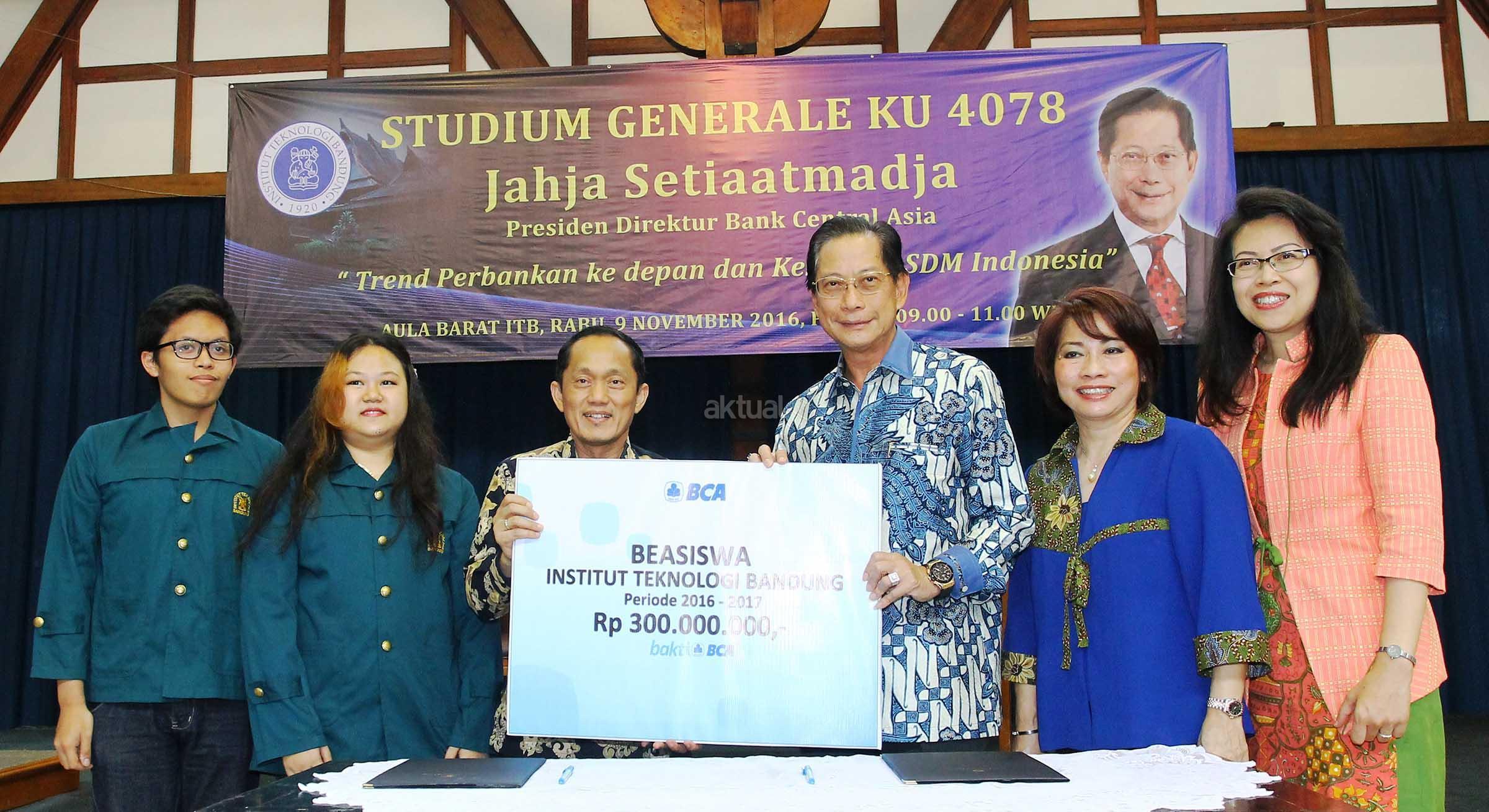 Presiden Direktur BCA Jahja Setiaatmadja (ketiga dari kanan) didampingi General Manager Corporate Social Responsibility BCA Inge Setiawati(kanan) dan Kepala Kantor Wilayah I BCA Allan Sriwulandari (kedua dari kanan) menyerahkan cinderamata untuk Rektor ITB, Kadarsah Suryadi (ketiga dari kiri) yang didampingi perwakilan mahaiswa disela Kuliah Umum di Aula Barat Kampus ITB, Bandung, Jawa Barat, Rabu (9/11). PT Bank Central Asia Tbk (BCA) kembali membuktikan komitmennya mendukung peningkatan kualitas sumber daya manusia. Kali ini, komitmen BCA dibuktikan dengan memberikan pembekalan melalui Kuliah Umum kepada 400 mahasiswa Institut Teknologi Bandung (ITB) dengan tema “Tren Perbankan ke Depan dan Kesiapan SDM Indonesia".Selain mengisi kuliah umum dan menyerahkan beasiswa Bakti BCA kepada Institut Teknologi Bandung, pada hari yang sama, BCA juga menyerahkan beasiswa kepada Universitas Padjadjaran (Unpad). BCA menyerahkan secara simbolis donasi beasiswa Bakti BCA tahun ajaran 2016-2017 kepada mahasiswa ITB senilai Rp300juta.