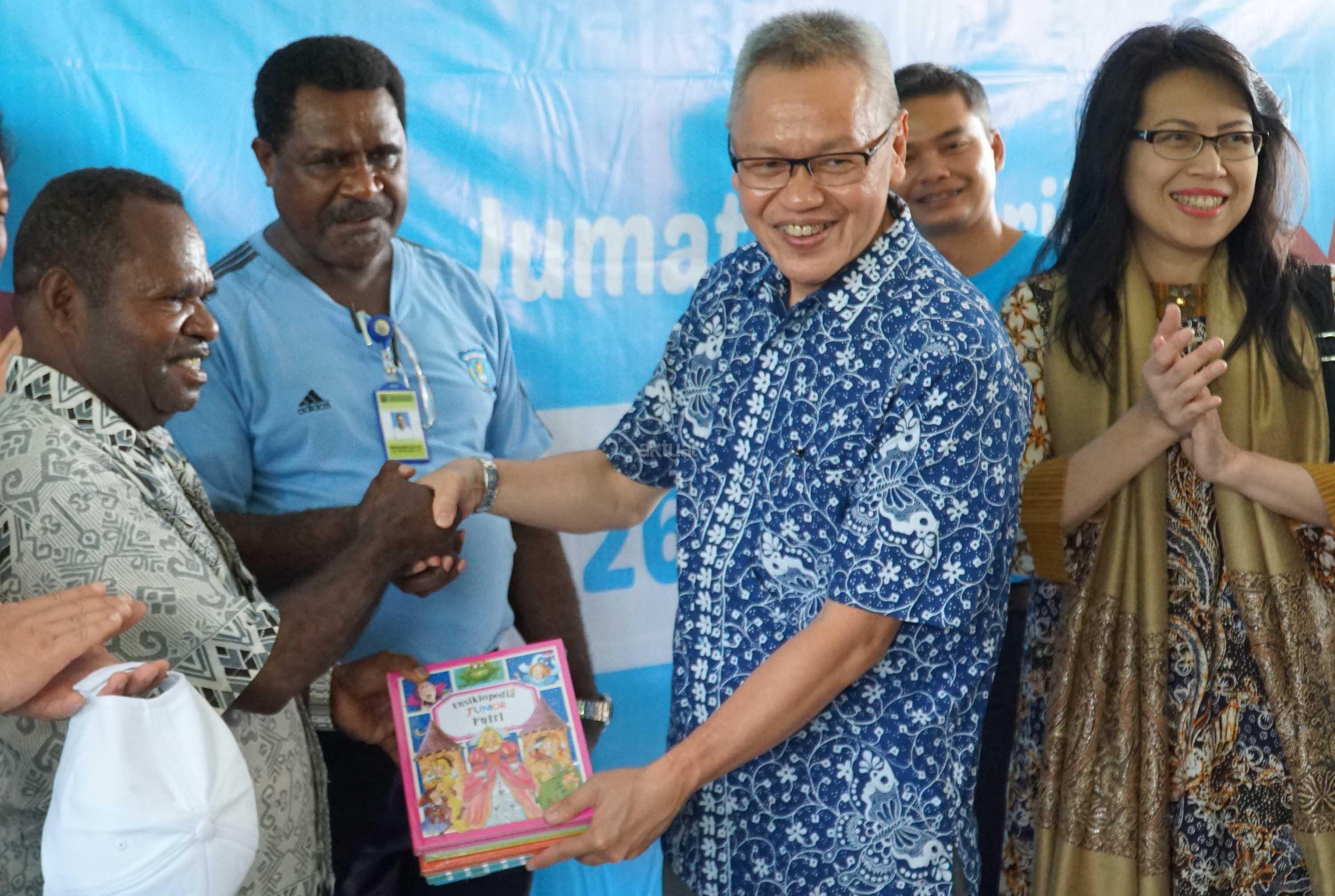 Direktur PT Bank Central Asia (BCA) Rudy Susanto didampingi General Manager Corporate Social Responsibility (CSR) BCA Inge Setiawati menyerahkan secara simbolis kaleng tabungan untuk para siswa siswi SD Negeri Inpres 26 Klamono, Sorong, Papua Barat, Jumat (21/4). BCA bekerjasama dengan United Nations International Children’s Fund (UNICEF) menyelenggarakan program edukasi literasi keuangan dan edukasi kesehatan bagi Papua. Selain melaksanakan edukasi mengenai literasi keuangan, BCA menyumbang sejumlah buku edukatif, buku panduan guru mengajar, alat peraga edukatif serta melaksanakan edukasi kesehatan mengenai pentingnya mencuci tangan bagi para siswa. AKTUAL/Eko S Hilman