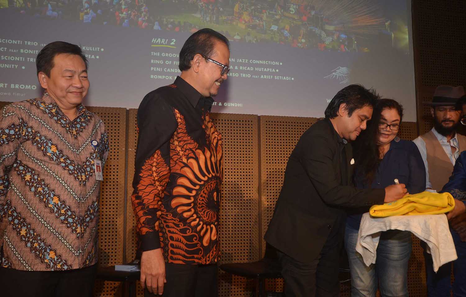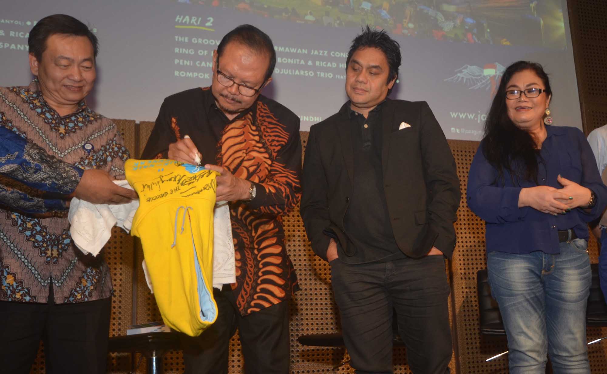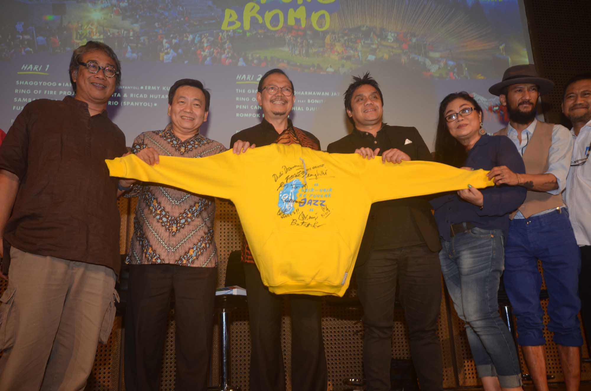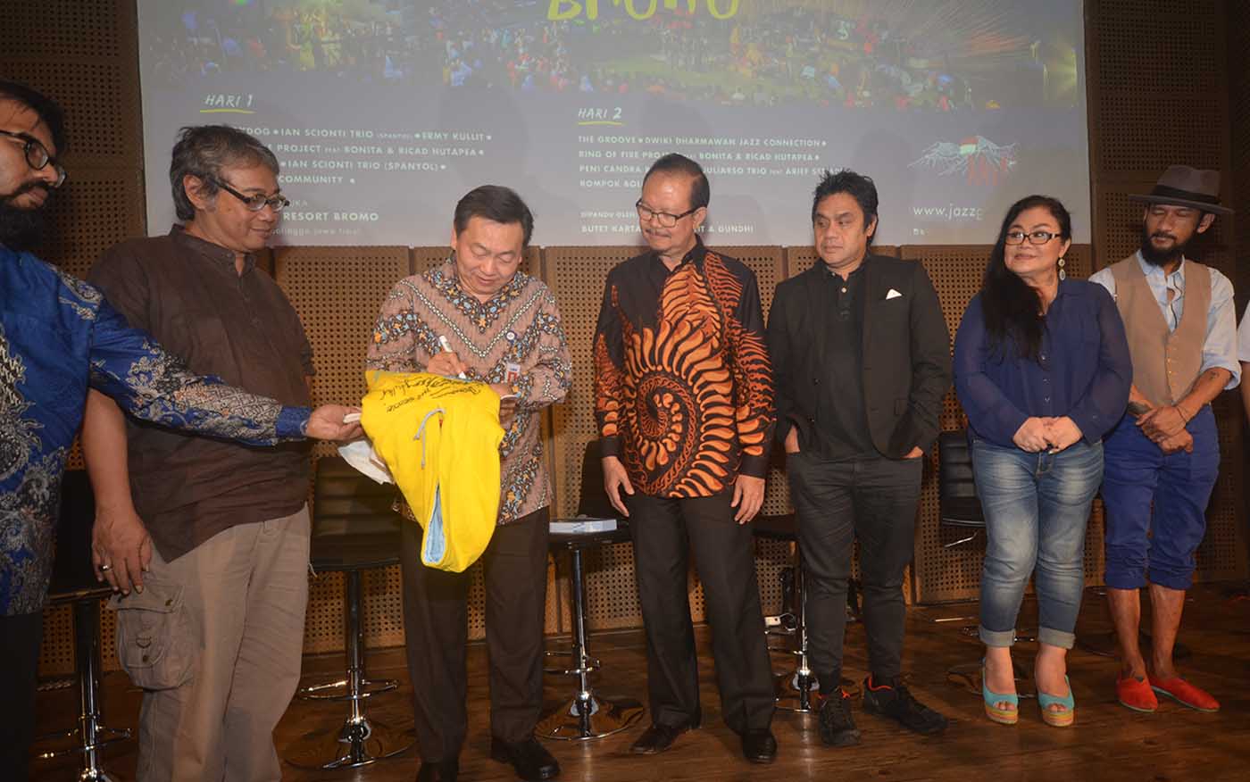 Direktur BCA, Santoso ( kiri) bersama Penggagas Jazz Gunung,Sigit Pramono (kedua dari kiri) menyaksikan para Musisi dan Performers Jazz Gung 2016 antara lain Dwiki Dharmawan, Ermy Kulit, The Groove menandatangani kaos gunung menandai komitmen BCA mempromosikan ,mengembangkan potensi Industri Kreatif dan pariwisata Indonesia dengan mendukung pagelaran musik Jazz usai jumpa pers di Galeri Kaya Indonesia, Jakarta, Kamis (11/8).Kali ini, BCA berpartisipasi dalam pergelaran Jazz Gunung Bromo yang akan digelar untuk kedelapan kalinya di Amfiteater Jiwa Jawa Resort Bromo,Desa Wonotoro,Kecamatan Sukapura,Kabupaten Probolinggo.Jazz Gunung Bromo merupakan festival jazz tahunan yang digagas Sigit Pramono, Butet Kartaredjasa,dan Djaduk Ferianto.Acara ini menjadi bentuk apresiasi terhadap musik jazz etnik Indonesia sebagai simbol asli Nusantara dan mengambil tema “Pesta Merdeka di Puncak Jazz” untuk tahun ini.