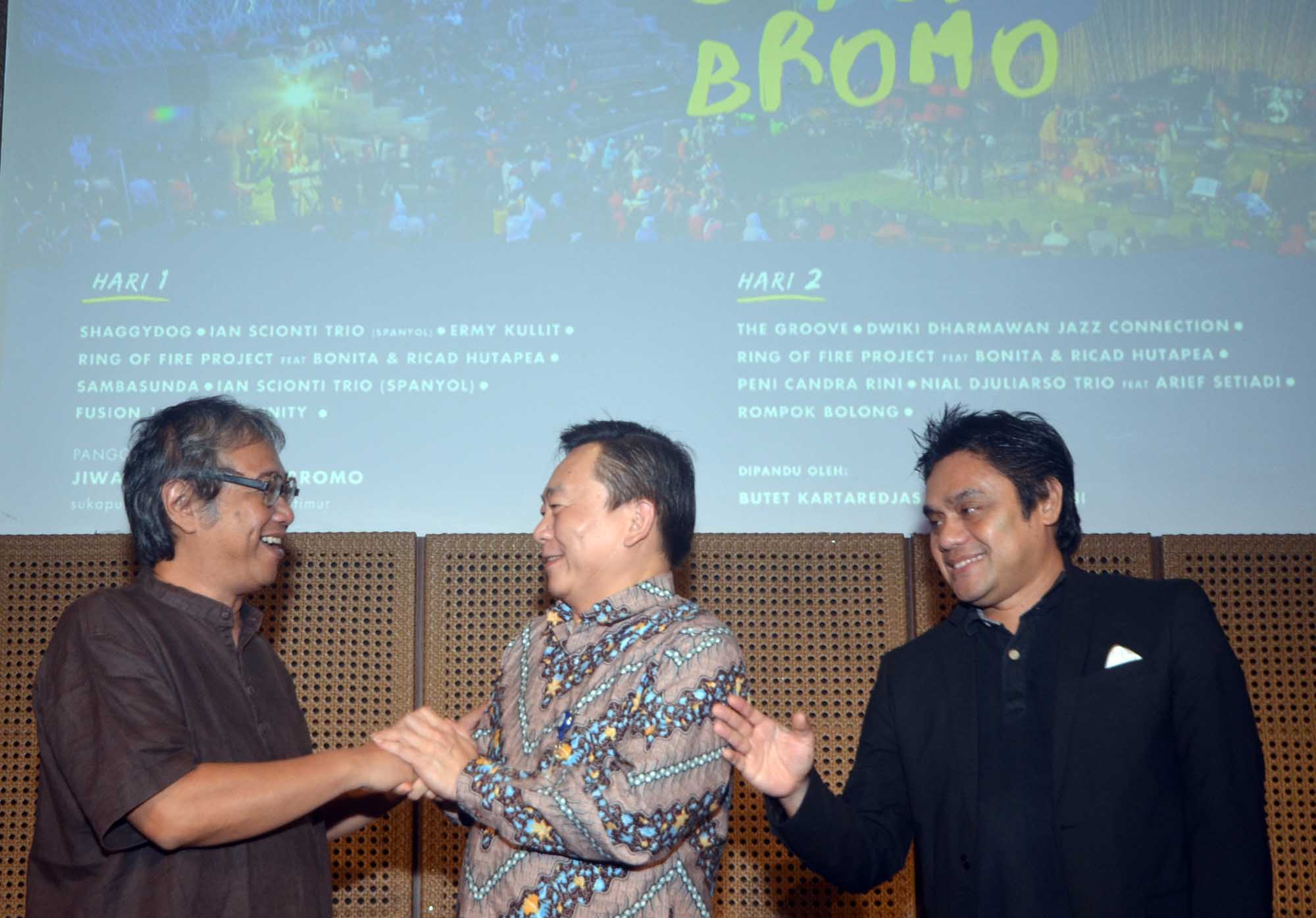 Direktur BCA, Santoso (tengah) berjabat tangan dengan para Musisi dan Performers Jazz Gung 2016 antara lain Butet Kartaredjasa (kiri) dan Dwiki Dharmawan seusai jumpa pers pagelaran musik Jazz di Galeri Kaya Indonesia, Jakarta, Kamis (11/8).Kali ini, BCA berpartisipasi dalam pergelaran Jazz Gunung Bromo yang akan digelar untuk kedelapan kalinya di Amfiteater Jiwa Jawa Resort Bromo,Desa Wonotoro,Kecamatan Sukapura,Kabupaten Probolinggo.Jazz Gunung Bromo merupakan festival jazz tahunan yang digagas Sigit Pramono, Butet Kartaredjasa,dan Djaduk Ferianto.Acara ini menjadi bentuk apresiasi terhadap musik jazz etnik Indonesia sebagai simbol asli Nusantara dan mengambil tema “Pesta Merdeka di Puncak Jazz” untuk tahun ini.