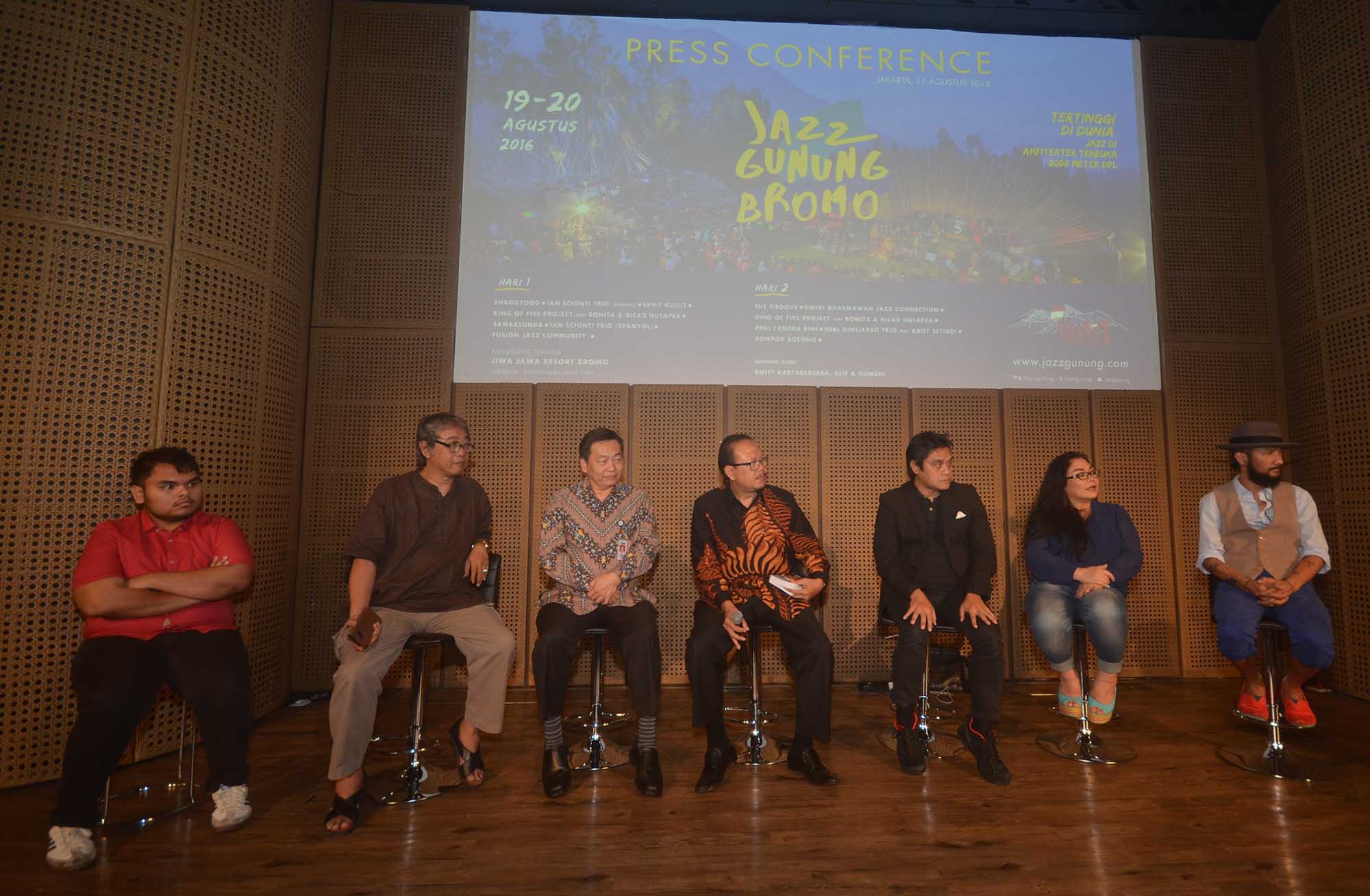 Direktur BCA, Santoso (kedua dari kiri) bersama Penggagas Jazz Gunung,Sigit Pramono (ketiga dari kiri) dan para Musisi dan Performers Jazz Gung 2016 antara lain (kiri ke kanan) Butet Kartaredjasa, Dwiki Dharmawan, Ermy Kulit, The Groove usai menandatangani kaos gunung yang menandai komitmen BCA mempromosikan ,mengembangkan potensi Industri Kreatif dan pariwisata Indonesia dengan mendukung pagelaran musik Jazz usai jumpa pers di Galeri Kaya Indonesia, Jakarta, Kamis (11/8).Kali ini, BCA berpartisipasi dalam pergelaran Jazz Gunung Bromo yang akan digelar untuk kedelapan kalinya di Amfiteater Jiwa Jawa Resort Bromo,Desa Wonotoro,Kecamatan Sukapura,Kabupaten Probolinggo.Jazz Gunung Bromo merupakan festival jazz tahunan yang digagas Sigit Pramono, Butet Kartaredjasa,dan Djaduk Ferianto.Acara ini menjadi bentuk apresiasi terhadap musik jazz etnik Indonesia sebagai simbol asli Nusantara dan mengambil tema "Pesta Merdeka di Puncak Jazz" untuk tahun ini.