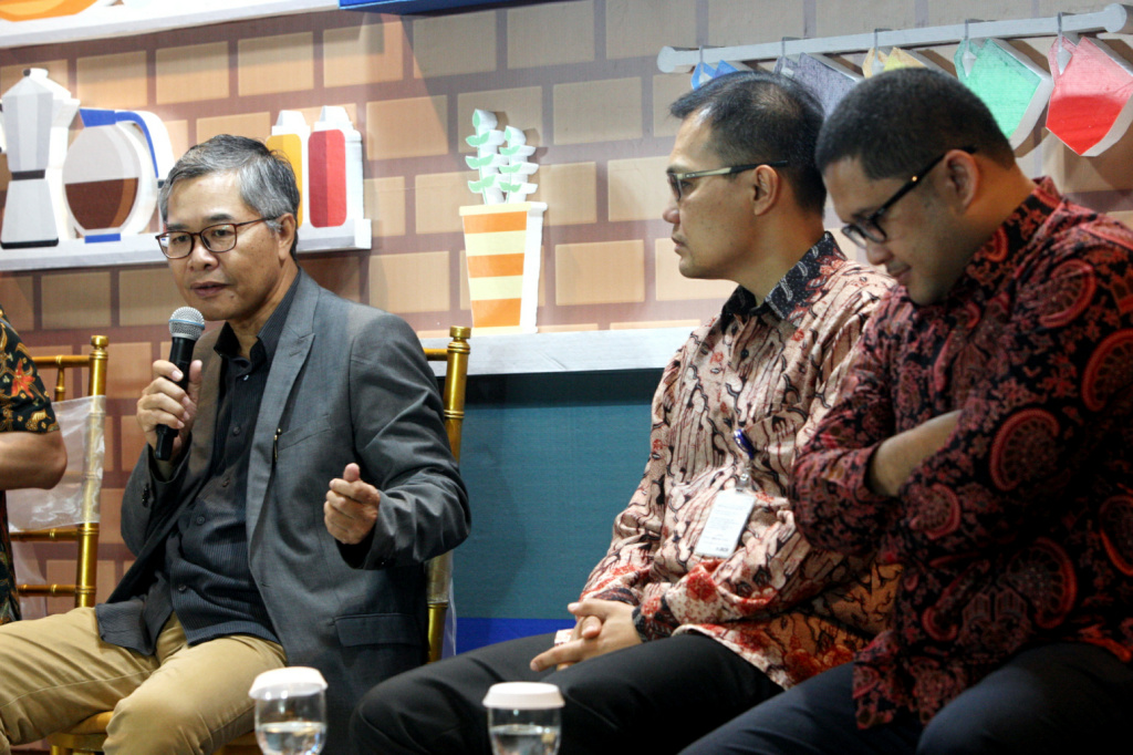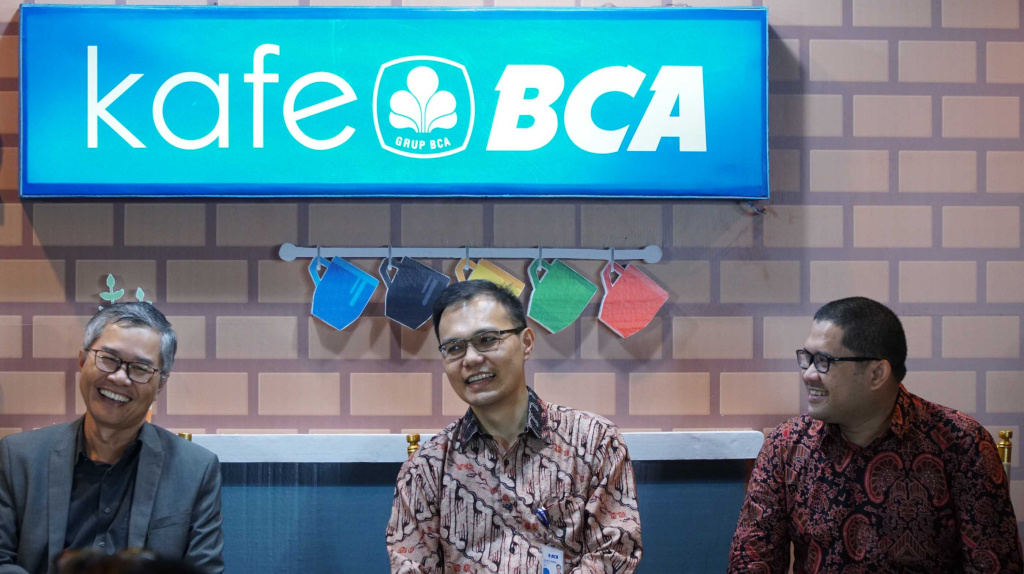 Sekretaris Perusahaan BCA Raymon Yonarto (kanan) bersama Kepala Ekonom BCA David Sumual (kedua kiri), Direktur Riset CORE Indonesia Piter Abdullah (kiri) dan Kepala Kajian Makro LPEM UI Febrio Nathan Kacaribu (kedua kanan) di sela-sela gelaran forum Kafe BCA di Jakarta, Jumat (18/10). Kafe BCA merupakan forum berbagi insight dan pemahaman yang secara rutin dilaksanakan guna mendukung visi BCA menjadi bank pilihan utama andalan masyarakat dan pilar penting perekonomian Indonesia. AKTUAL/STR-Eko S Hilman