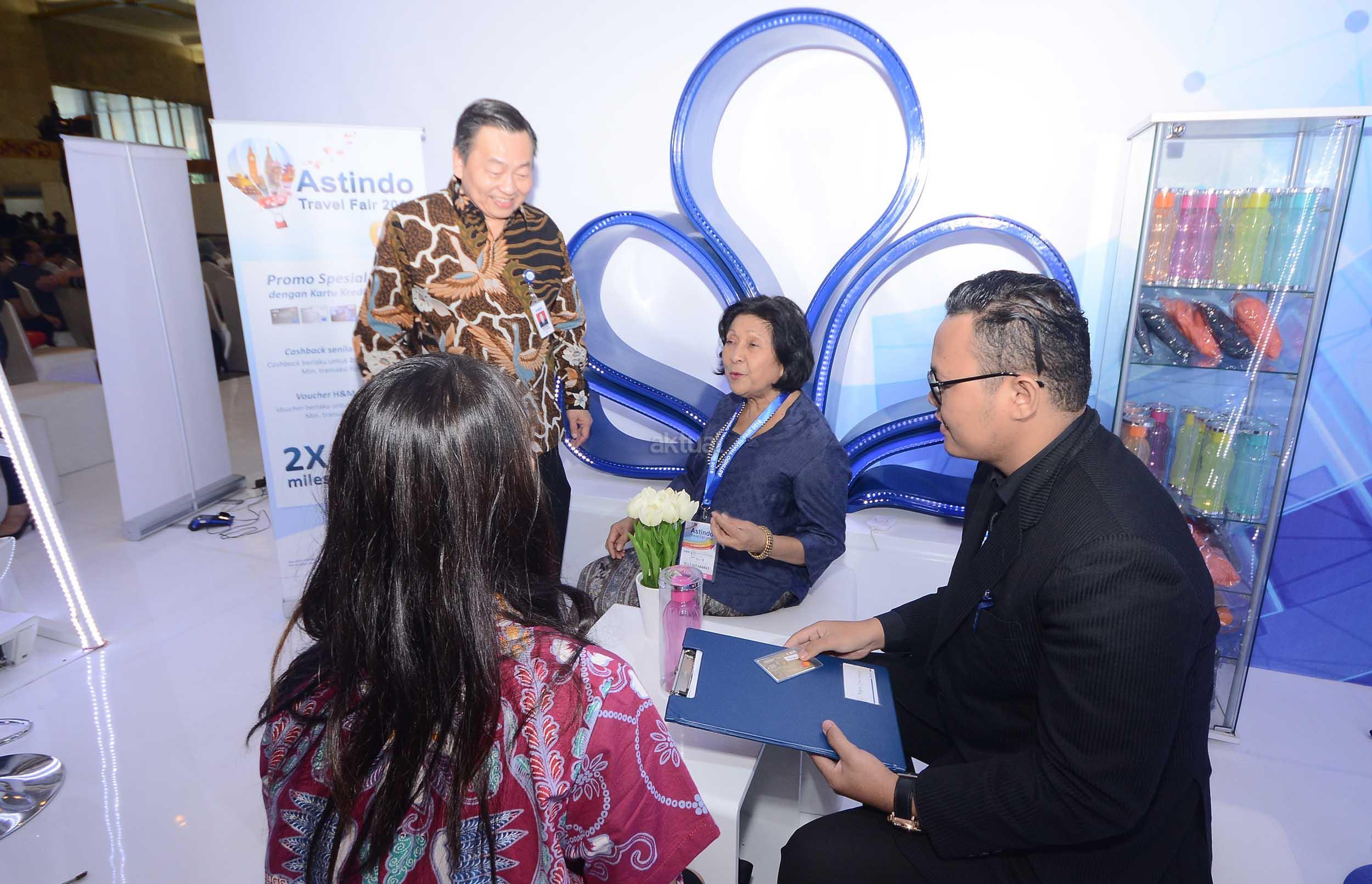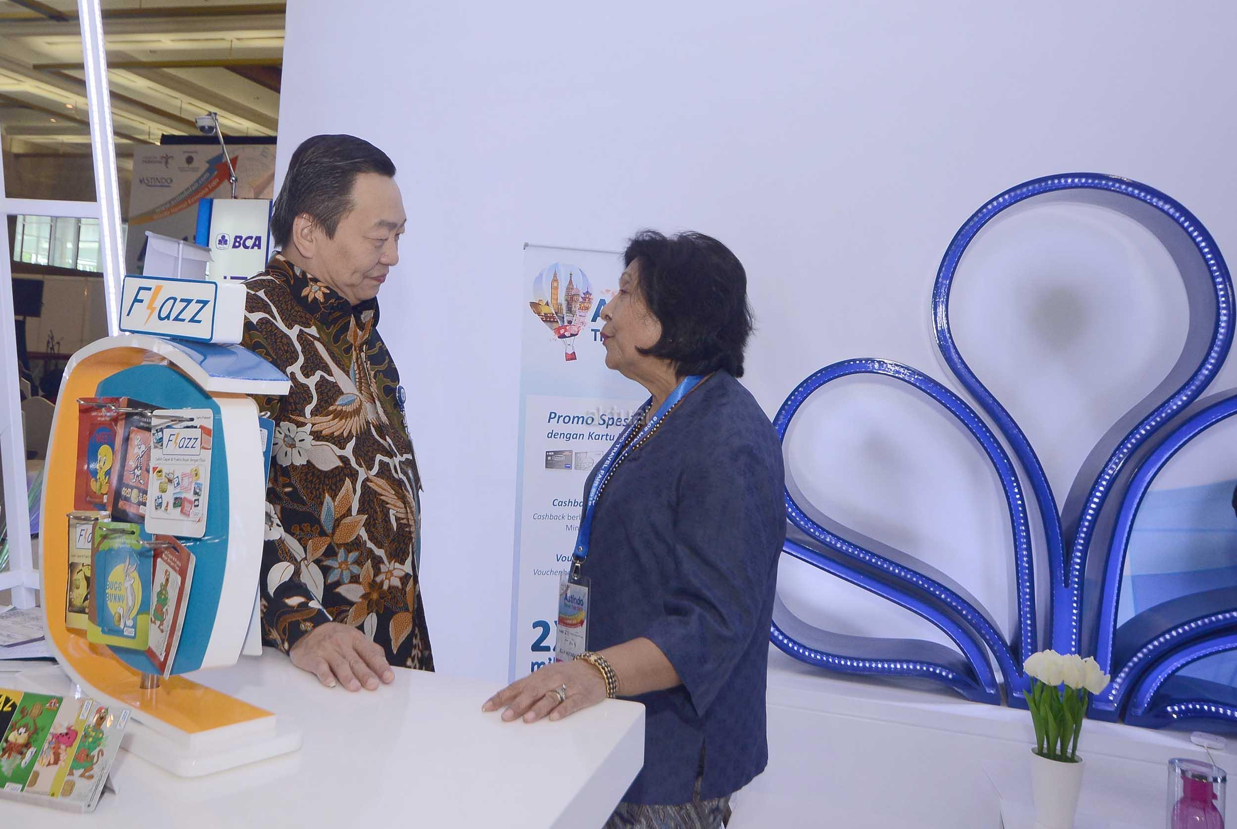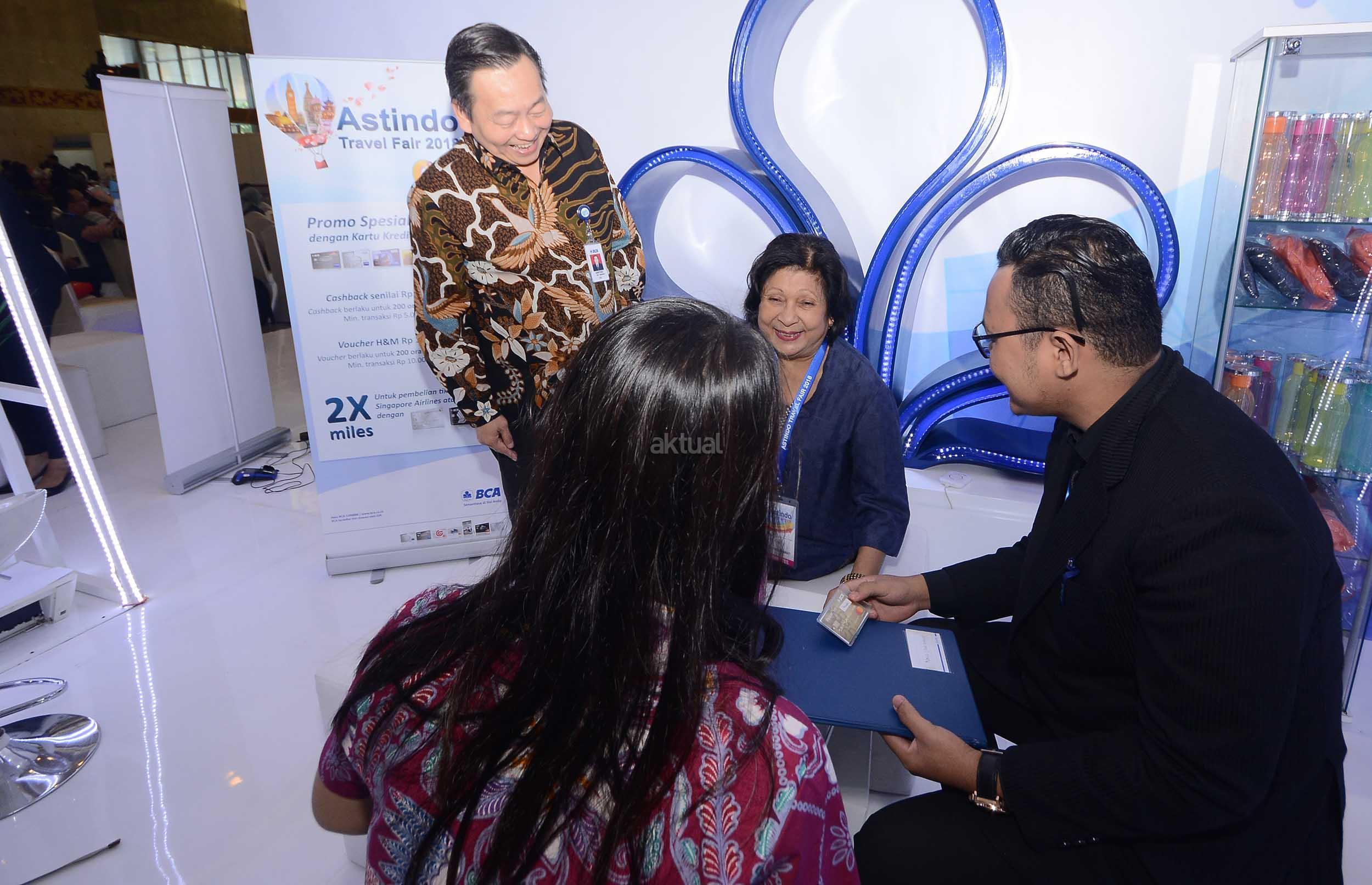 Direktur PT Bank Central Asia Tbk (BCA) Santoso bersama (kiri) dan Ketua Umum ASTINDO Elly Hutabarat berbincang dengan nasabah BCA seusai dibukanya Astindo Travel Fair 2018 yang berlangsung dari tanggal 2 hingga 4 Maret 2018 di Jakarta Convention Center, Jakarta, Jumat (2/3). BCA sebagai bank partner Astindo Travel Fair 2018 memberikan kesempatan bagi para Pemegang Kartu Kredit BCA untuk mewujudkan impian berwisata baik domestik maupun luar negeri melalui beragam promo menarik, seperti cicilan BCA 0% untuk jangka waktu 3 & 6 bulan, cashback Rp 500 ribu untuk 200 orang pertama, hingga promo 2x KrisFlyer miles. AKTUAL/Eko S Hilman