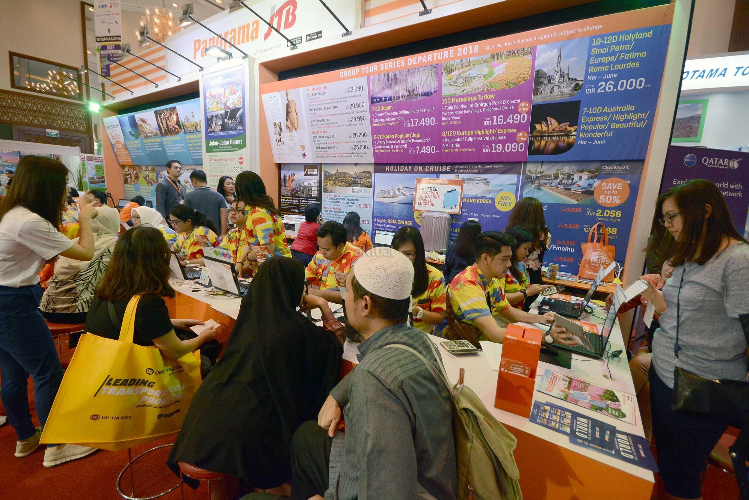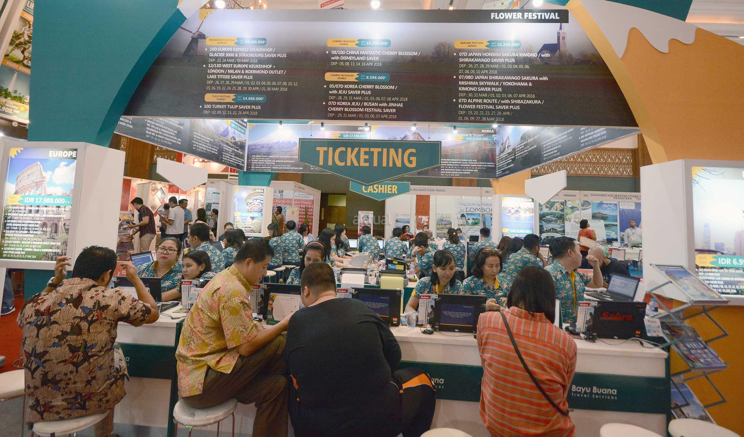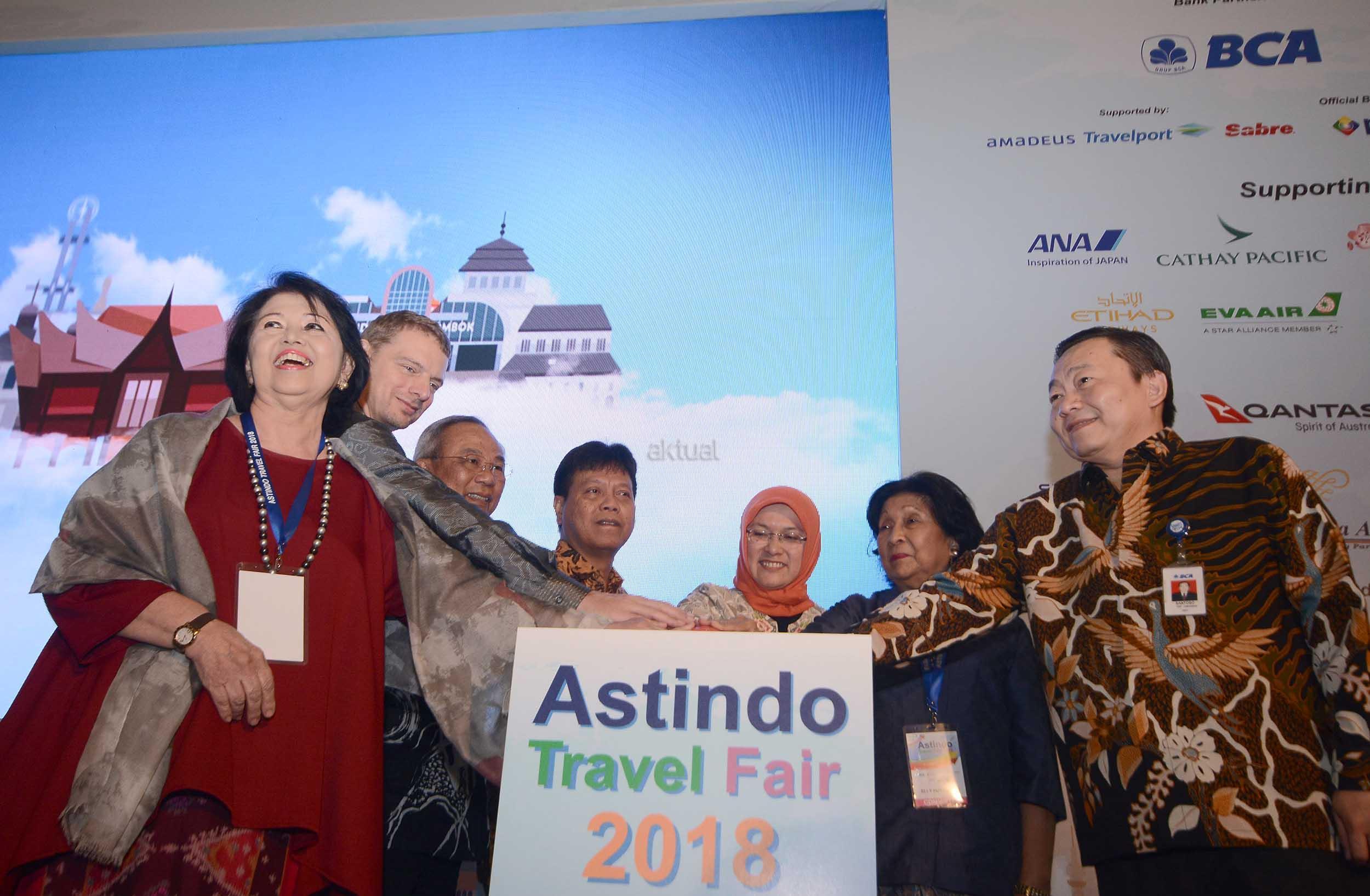 Direktur PT Bank Central Asia Tbk (BCA) Santoso bersama (kiri) dan Ketua Umum ASTINDO Elly Hutabarat berbincang dengan nasabah BCA seusai dibukanya Astindo Travel Fair 2018 yang berlangsung dari tanggal 2 hingga 4 Maret 2018 di Jakarta Convention Center, Jakarta, Jumat (2/3). BCA sebagai bank partner Astindo Travel Fair 2018 memberikan kesempatan bagi para Pemegang Kartu Kredit BCA untuk mewujudkan impian berwisata baik domestik maupun luar negeri melalui beragam promo menarik, seperti cicilan BCA 0% untuk jangka waktu 3 & 6 bulan, cashback Rp 500 ribu untuk 200 orang pertama, hingga promo 2x KrisFlyer miles. AKTUAL/Eko S Hilman