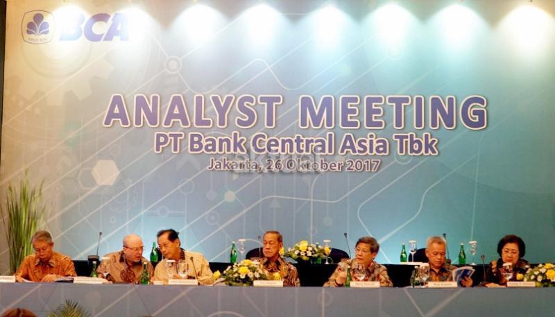 Presiden Direktur PT Bank Central Asia Tbk (BCA) Jahja Setiaatmadja (tengah) bersama jajaran Direksi dan Komisaris saat memberikan keterangan pers Hasil Kinerja Sembilan Bulan Pertama 2017 BCA di Jakarta, Kamis (26/10). Kinerja keuangan BCA sepanjang sembilan bulan pertama tahun 2017 mengalami peningkatan laba bersih sebesar 11,3 persen menjadi Rp16,8 triliun, dari Rp15,1 triliun pada periode yang sama tahun sebelumnya. AKTUAL/Eko S Hilman