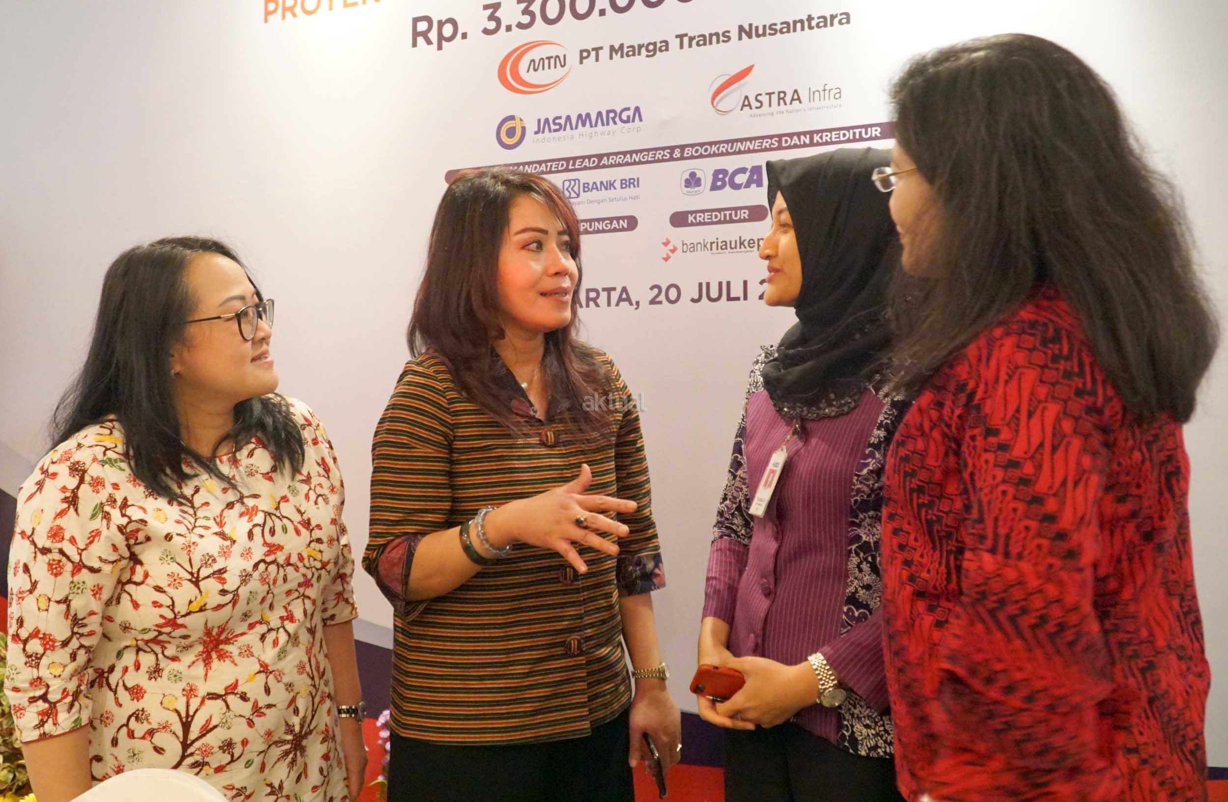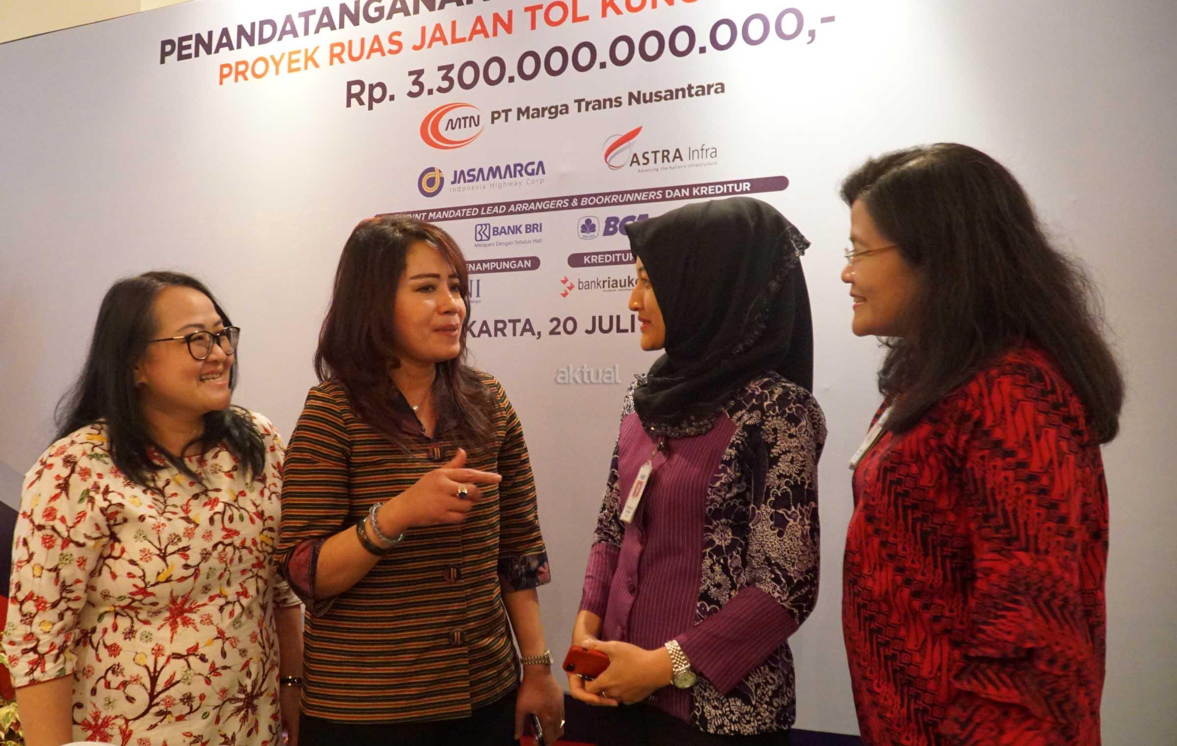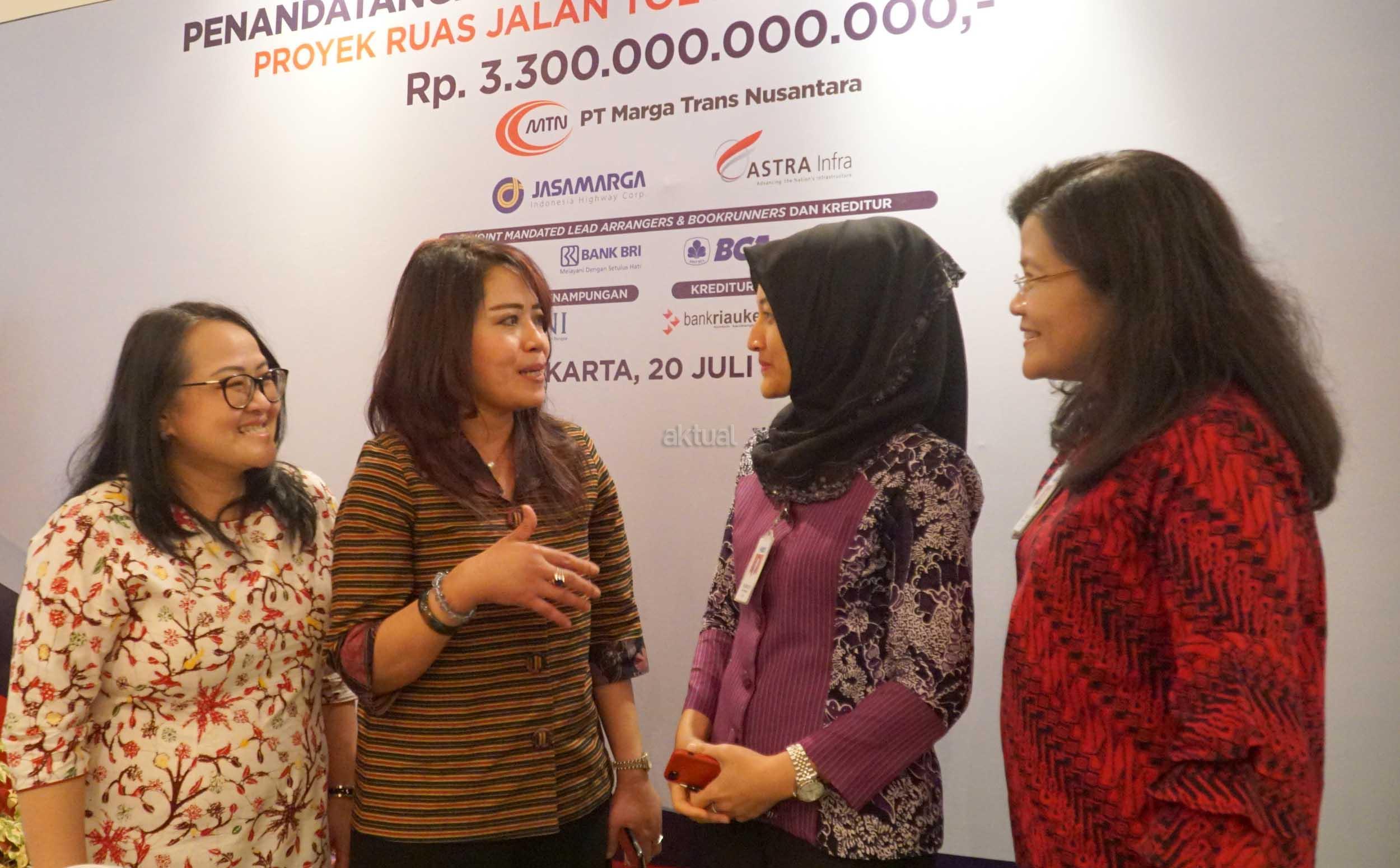 Executive Vice President Group Corporate Finance BCA Susiana Santoso (kiri) bersama Executive Vice President Group Corporate Banking BCA Yuli Melati Suryaningrum (kedua kanan), Kepala Kantor Cabang Korporasi BCA Dhejani Surjadi (kanan) dan Presiden Direktur PT Marga Trans Nusantara (MTN) Truly Nawangsari (kedua kiri) usai menandatangani Perjanjian Kredit Sindikasi Proyek Tol Kunciran-Serpong di Jakarta, Jumat (20/07). Melalui kerja sama ini, BCA menyalurkan kredit sindikasi senilai Rp735,9 Miliar kepada PT Marga Trans Nusantara (MTN) untuk pembangunan ruas tol Kunciran – Serpong sepanjang 11,20 KM, dari total plafon pembiayaan senilai Rp3,3 Triliun. AKTUAL/Eko S Hilman