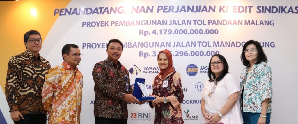 Senior Vice President Corporate Banking PT Bank Central Asia (BCA) Tbk Yuli Melati (ketiga kanan) bersama Senior Vice President Corporate Finance Susiana Santoso (kedua kanan) dan Senior Vice President Corporate Branch Dhejani Surjadi (kanan) menyerahkan cinderamata kepada Direktur Utama PT Jasamarga Pandaan Malang (JPM) Mohamad Agus Setiawan (ketiga kiri) disaksikan oleh Direktur Utama PT Jasamarga Manado Bitung (JMB) George IMP Manurung (kiri), Direktur Keuangan PT Jasa Marga Donny Arsal seusai penandatanganan dua Perjanjian Kredit Sindikasi di Jakarta, Jumat (13/10). Dua proyek jalan tol tersebut termasuk dalam Proyek Strategis Nasional, di mana untuk Jalan Tol Pandaan Malang BCA memberikan kredit sebesar Rp1 triliun dari total pembiayaan sindikasi sebesar Rp4,179 triliun dan proyek Tol Manado Bitung sebesar Rp. 652,8 miliar dari total pembiayaan sindikasi sebesar Rp3,586 triliun. AKTUAL/Humas BCA