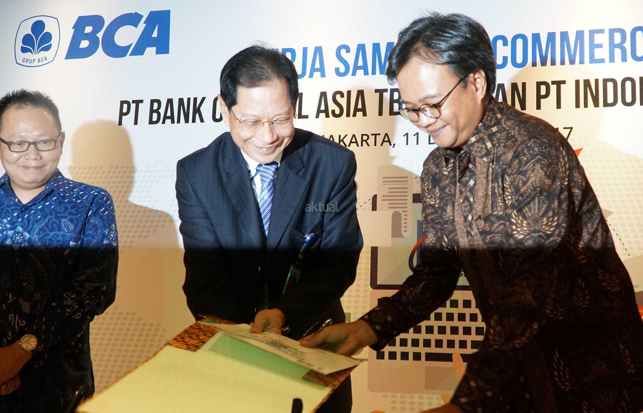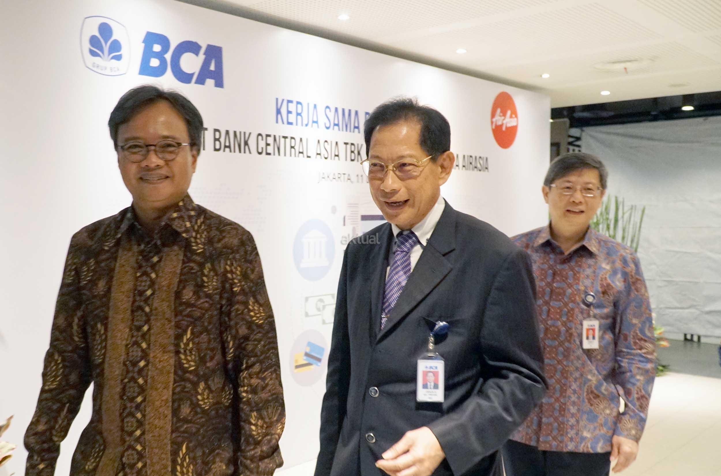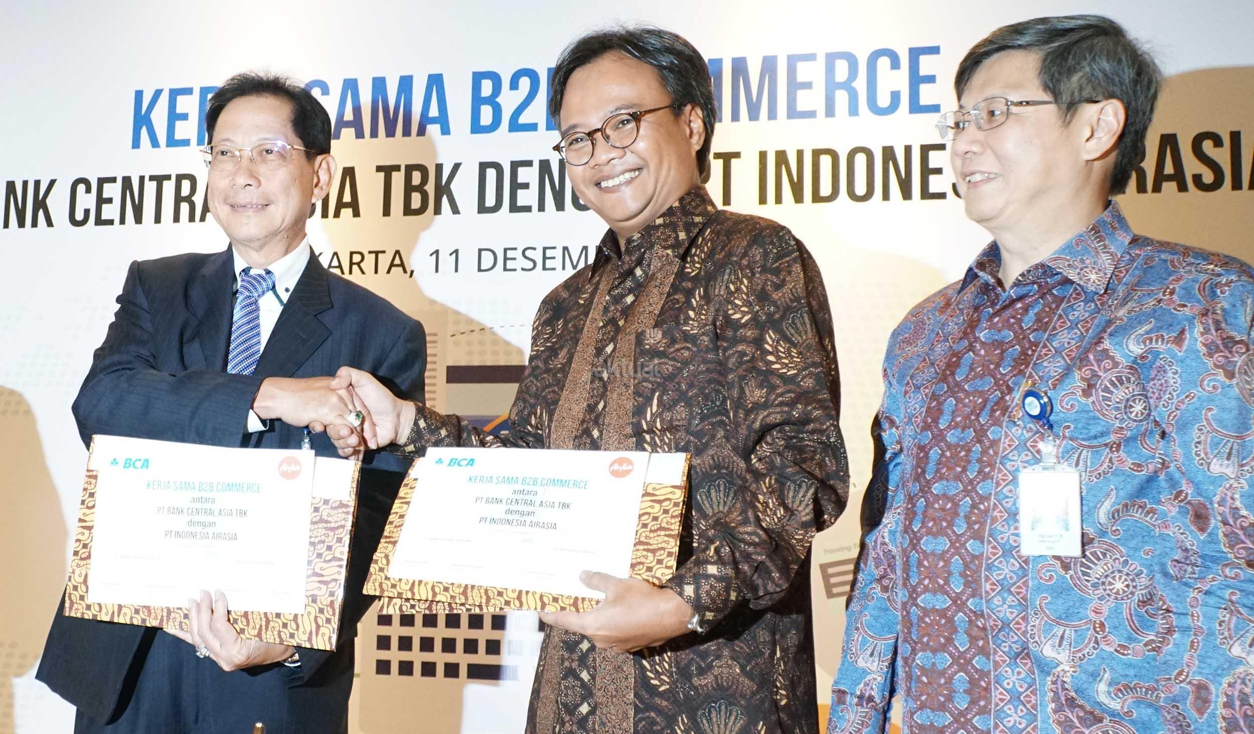 Presiden Direktur BCA, Jahja Setiaatmadja bersama CEO Grup AirAsia di Indonesia , Dendy Kurniawan dan Direktur BCA, Henry Koenaifi seusai acara penandatangan perjanjian kerja sama antara BCA dan AirAsia di Jakarta, Senin (11/12). Komitmen penandatangan tersebut perihal layanan penerimaan pembayaran Top UP dana deposit bagi mitra agen perjalanan (travel agent) AirAsia secara online melalui KlikBCA Bisnis.Kerja sama yang dilakukan ini diharapkan dapat berkontribusi meningkatkan nilai transaksi collection oleh agen perjalanan serta memperluas layanan platform cash management untuk menyediakan fasilitas kemudahan Top Up. AKTUAL/Eko S Hilman
