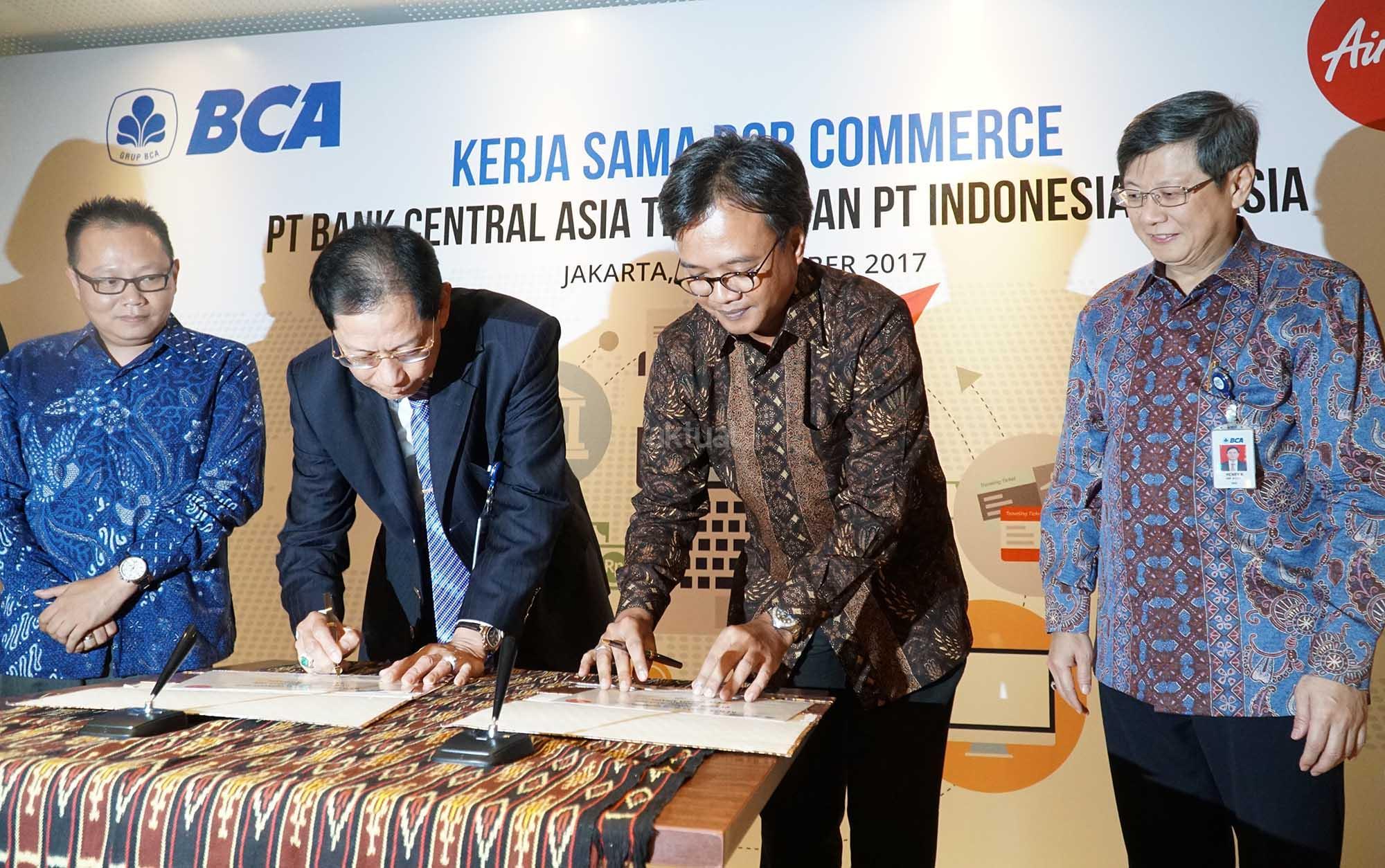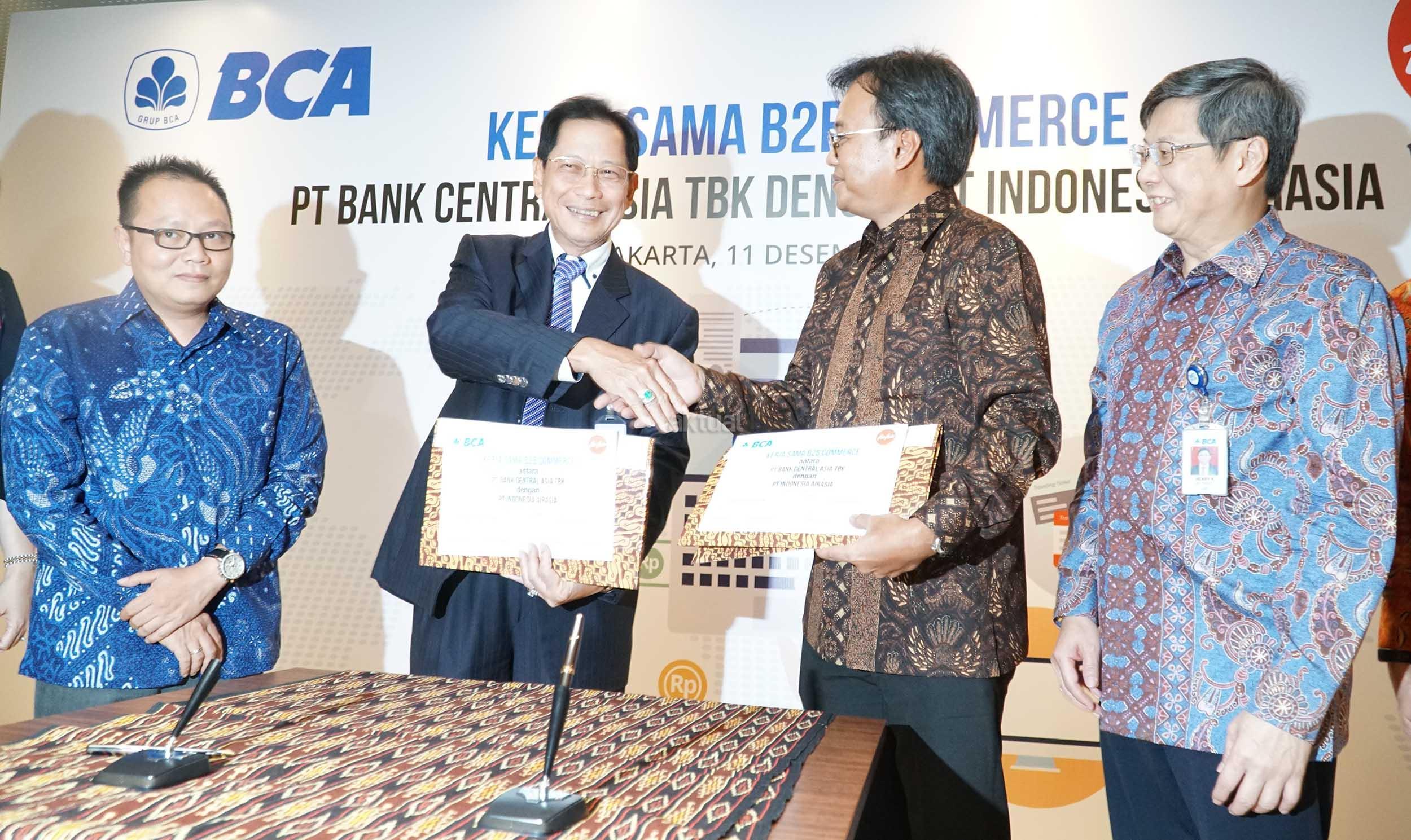 Presiden Direktur BCA, Jahja Setiaatmadja (kedua dari kiri) bersama Direktur Niaga AirAsia Indonesia, Rifai Taberi, CEO Grup AirAsia di Indonesia , Dendy Kurniawan (kedua dari kanan), serta Direktur BCA, Henry Koenaifi (kanan) saat acara penandatangan perjanjian kerja sama antara BCA dan AirAsia di Jakarta, Senin (11/12). Komitmen penandatangan tersebut perihal layanan penerimaan pembayaran Top UP dana deposit bagi mitra agen perjalanan (travel agent) AirAsia secara online melalui KlikBCA Bisnis.Kerja sama yang dilakukan ini diharapkan dapat berkontribusi meningkatkan nilai transaksi collection oleh agen perjalanan serta memperluas layanan platform cash management untuk menyediakan fasilitas kemudahan Top Up. AKTUAL/Eko S Hilman