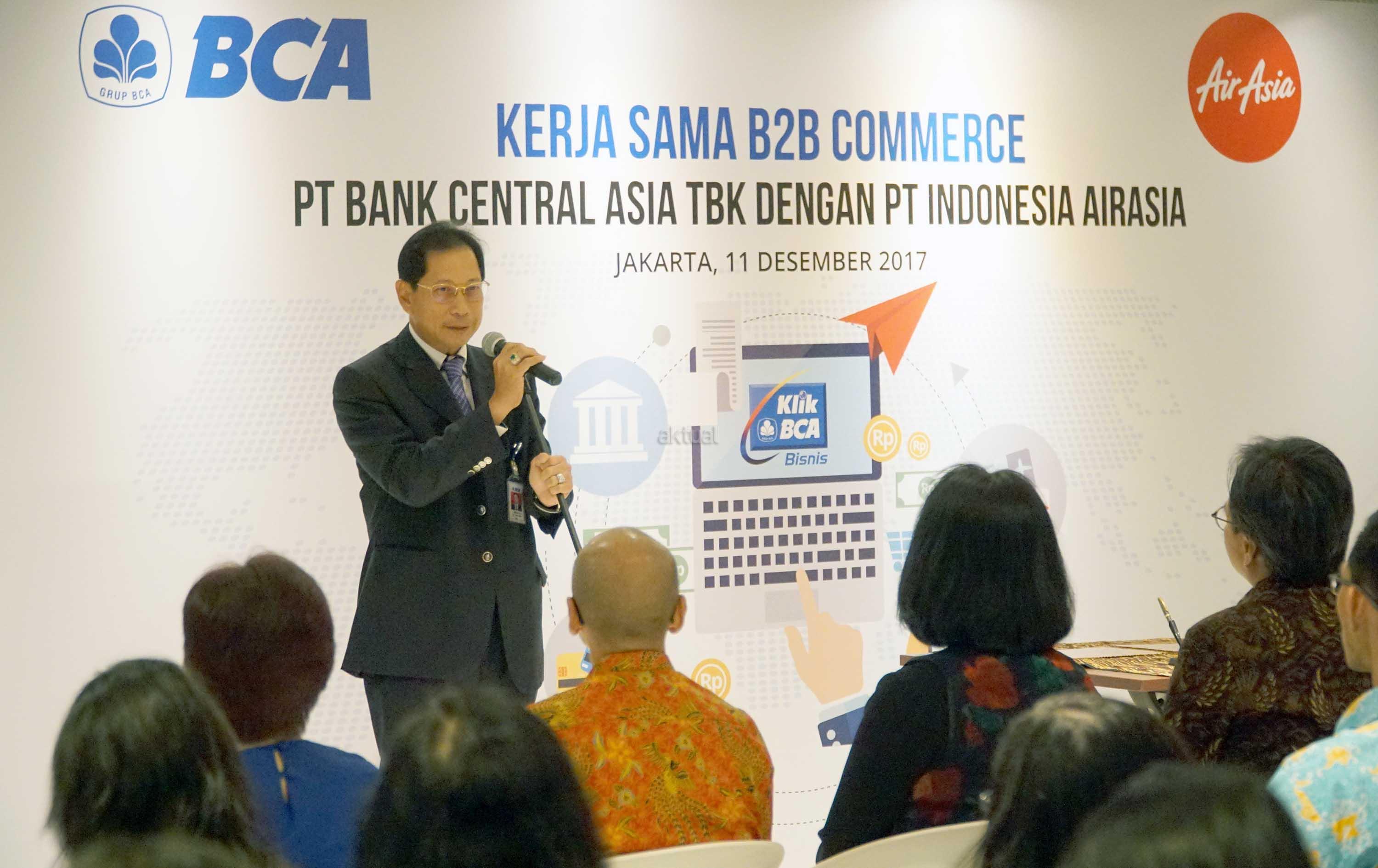 Presiden Direktur BCA, Jahja Setiaatmadja memberikan sambutan disela acara penandatangan perjanjian kerja sama antara BCA dan AirAsia di Jakarta, Senin (11/12). Komitmen penandatangan tersebut perihal layanan penerimaan pembayaran Top UP dana deposit bagi mitra agen perjalanan (travel agent) AirAsia secara online melalui KlikBCA Bisnis.Kerja sama yang dilakukan ini diharapkan dapat berkontribusi meningkatkan nilai transaksi collection oleh agen perjalanan serta memperluas layanan platform cash management untuk menyediakan fasilitas kemudahan Top Up. AKTUAL/Eko S Hilman